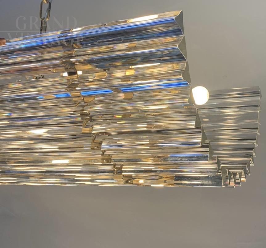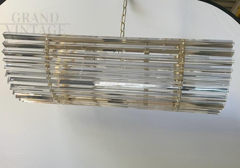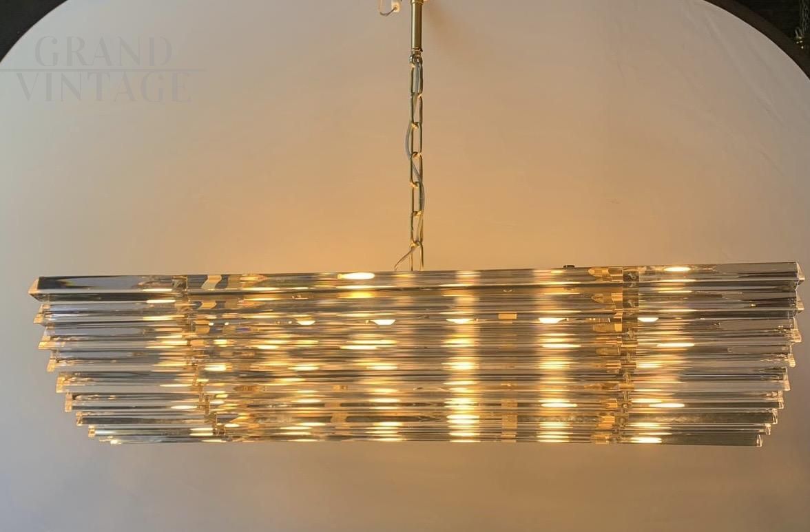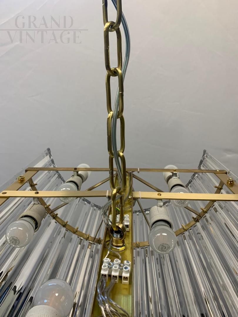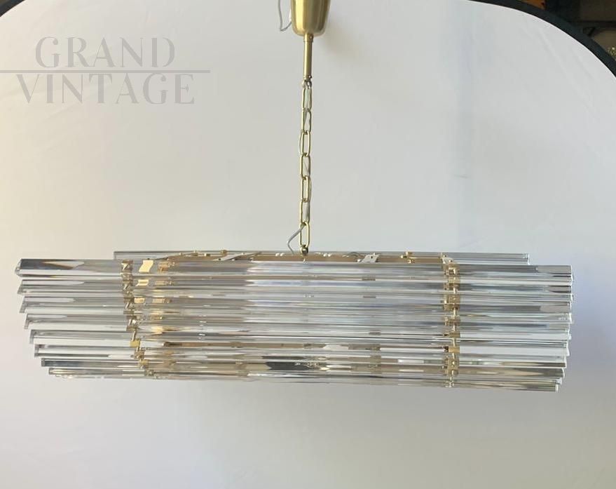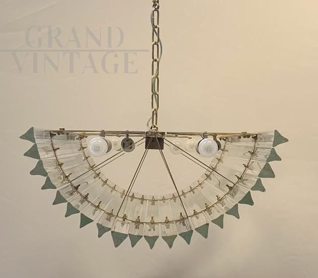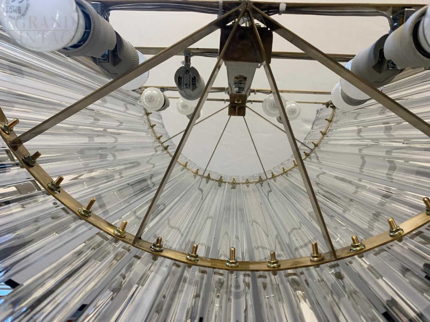 Beautiful and majestic horizontal chandelier with 12 lights, composed of handmade transparent Murano glass slats mounted on a golden brass structure, recently produced to high quality standards with a touch of customization, with its hemispherical shape that gives tradition and design. The transparent Murano glass slats were created by hand by Murano masters; each slat is similar but not the same, in fact no molds were used in the creation. The handcrafted structure is made of welded brass and in some places joined with screws. The electrical system is of new production and has 12 sockets for E27 ceramic bulbs. To fix it to the ceiling, a golden and welded iron chain, with a customizable length.