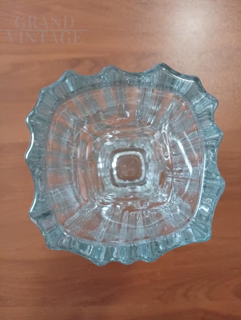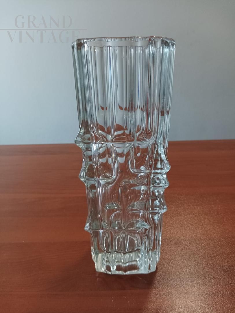 Ice Melting 617 vase by Vladisvav Urban for Rasice Glass Tsechoslowakia, Sklo Union, 1968, with the typical appearance of melted ice. The designers at Sklo Union were inspired by simple geometric shapes arranged on glass to capture and reflect light in a modern way. This design is based on a rectangular shape with two flat and curved sides. It has 4 concave indentation columns arranged on opposite sides of the vase to create a light pattern that changes depending on the viewer's angle.