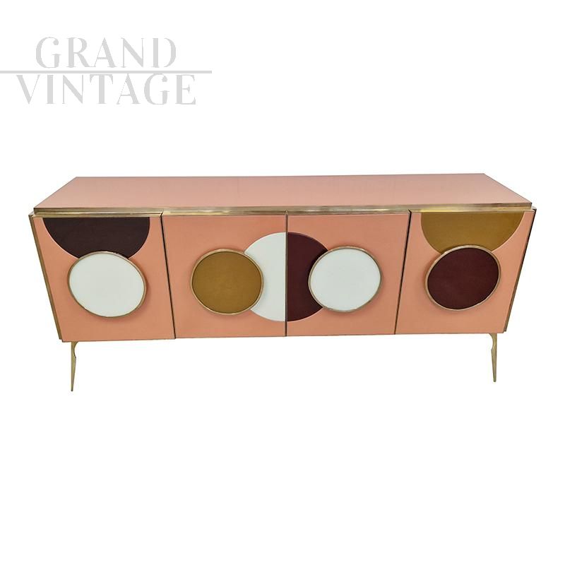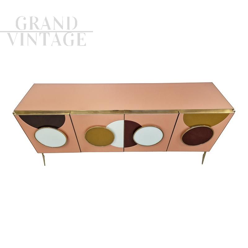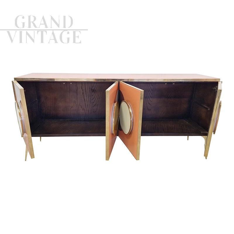 Four-door design sideboard with internal shelf, entirely handmade, with wooden structure covered in salmon glass. Profiles and feet in golden brass. LED backlit colored round handles.