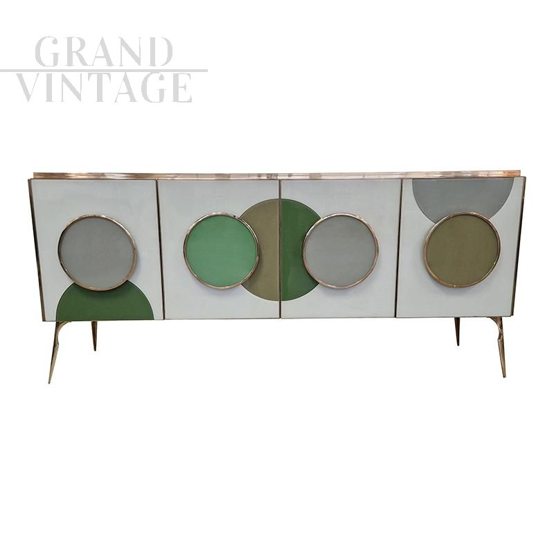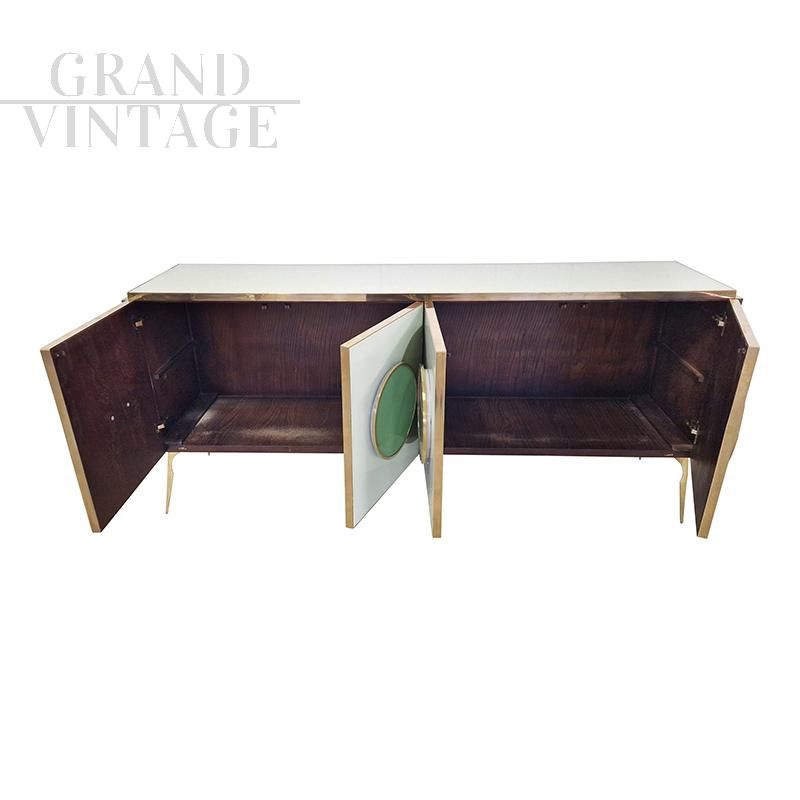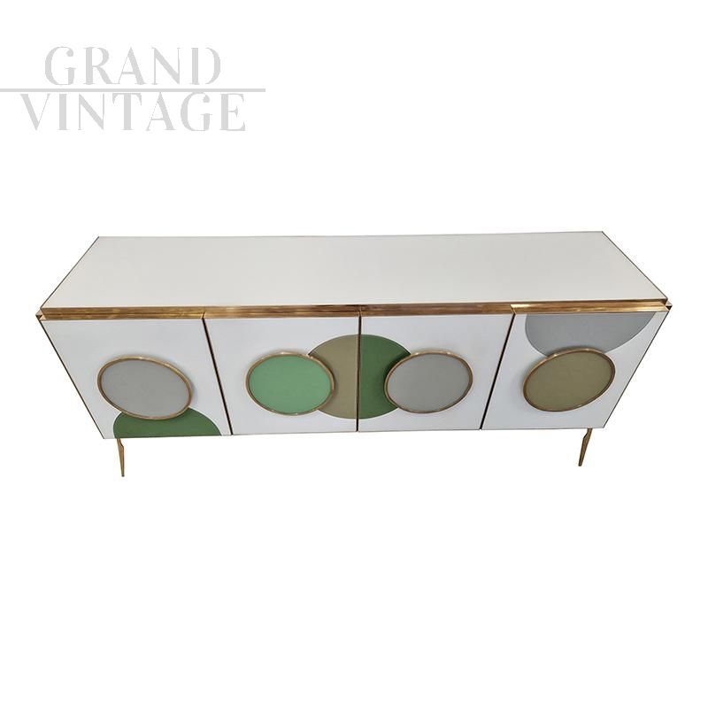 Four-door design sideboard with internal shelf, entirely handmade, with wooden structure covered in white glass. Profiles and feet in golden brass. LED backlit colored round handles.