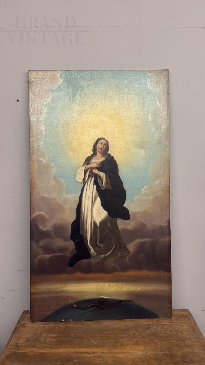 Antique oil painting on canvas depicting the Immaculate Conception with a serpent, 19th century Italian school, 104 x 59 cm.