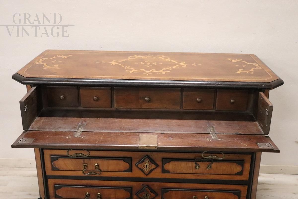 This antique Italian chest of drawers from the second half of the 17th century is an authentic masterpiece of the Baroque period, reflecting the elegance and craftsmanship typical of the Louis XIV style. Attributable to the prestigious cabinet-making workshops of northern Italy. Made of solid walnut with a rich decoration on each side characterized by fluid elements such as curls and scrolls. The ebonized wood frames further enhance the richness of the light inlays. Featuring four large drawers offering generous storage space. The first drawer, equipped with other internal drawers, can be opened by folding and reveals a useful surface for quick writing or as a support for consulting documents. Good condition, price negotiable.
