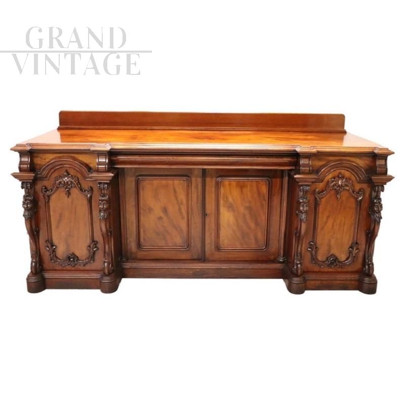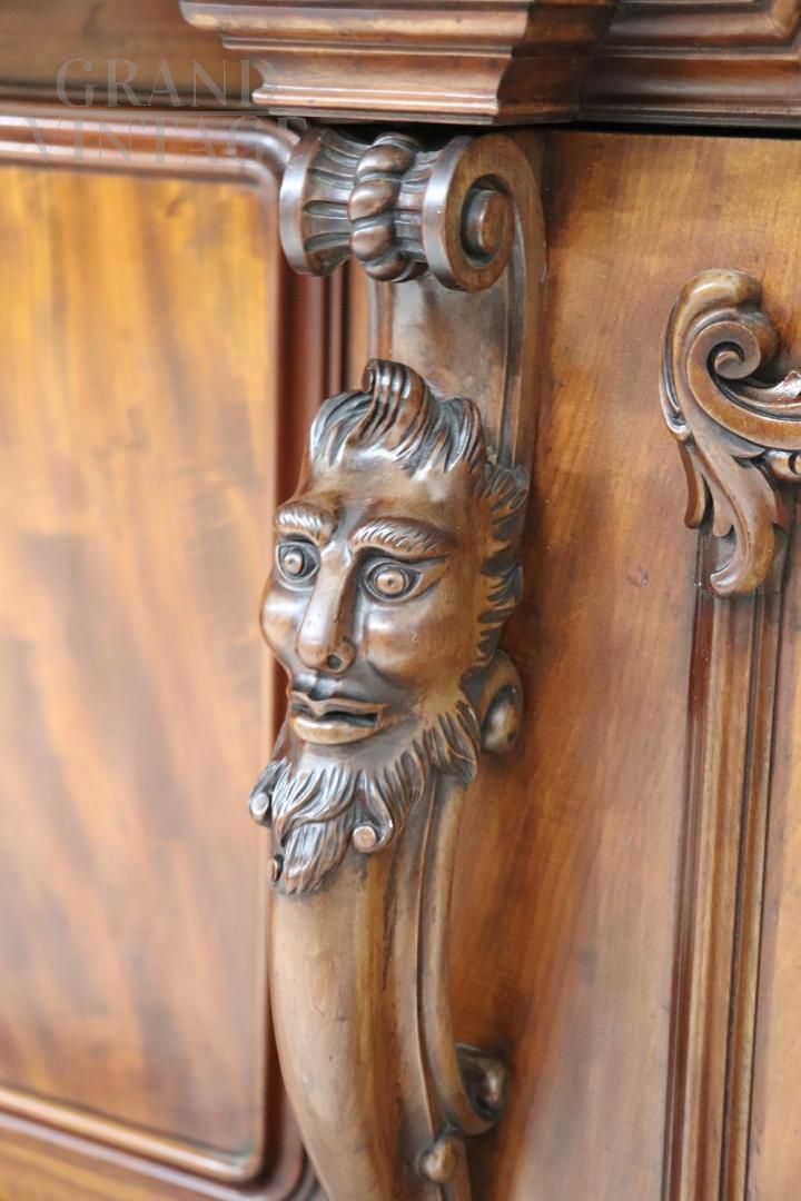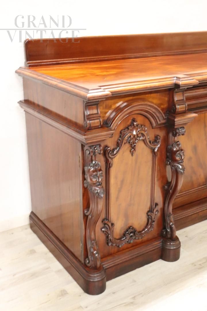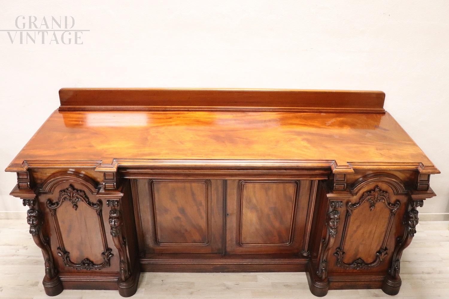 Imposing antique sideboard made in the first decades of the 20th century in precious mahogany wood, characterized by a large internal useful space with shelves and drawers. Simple and linear, it is enriched by important decorations carved in solid wood with grotesque elements of neo-Gothic inspiration. In excellent condition, the replacement of the internal green lining cloth is recommended. Perfect as a furnishing element also for clubs and restaurants. Great negotiable price.