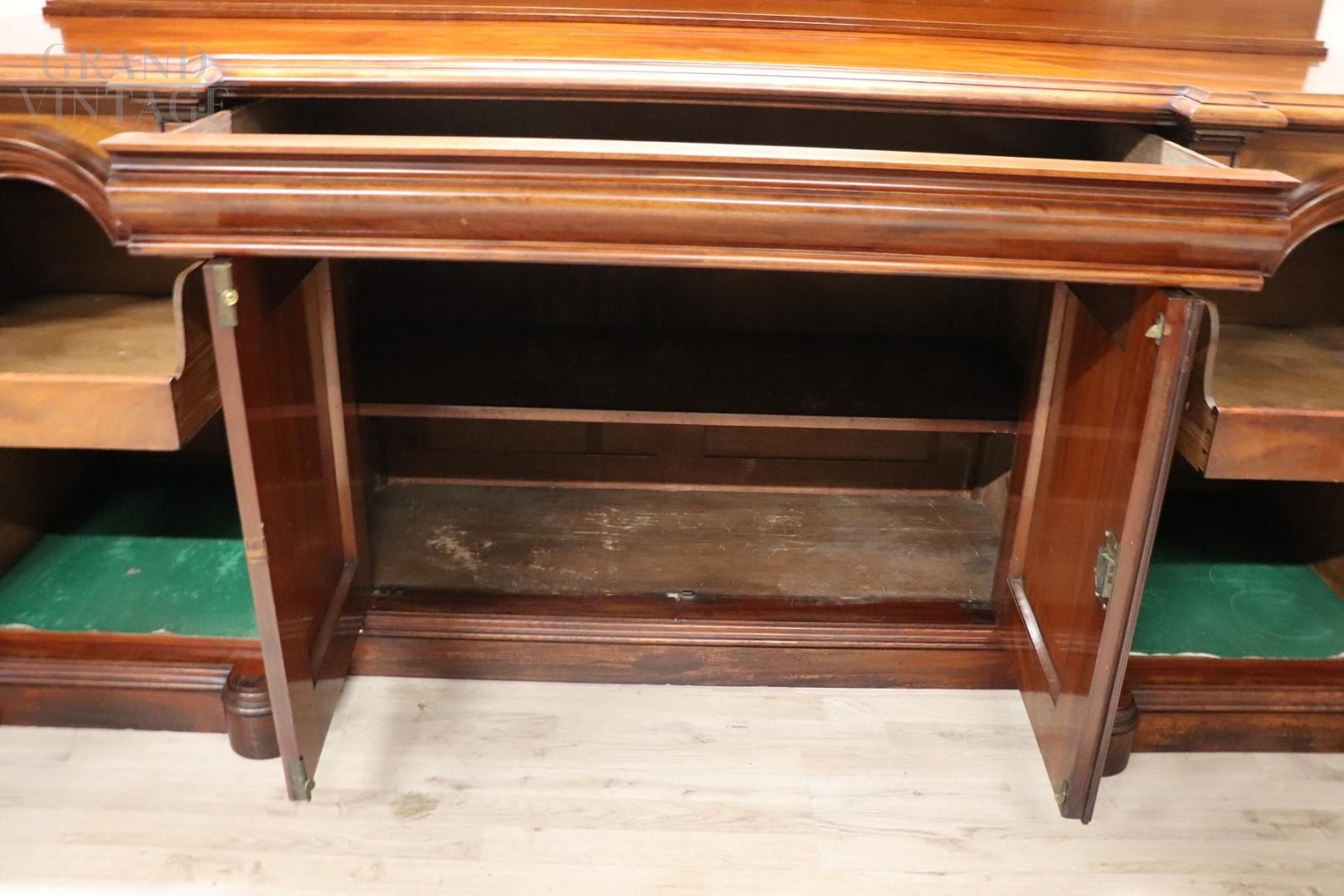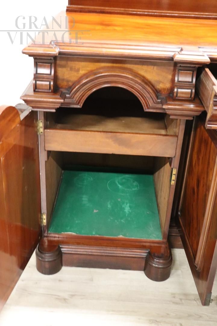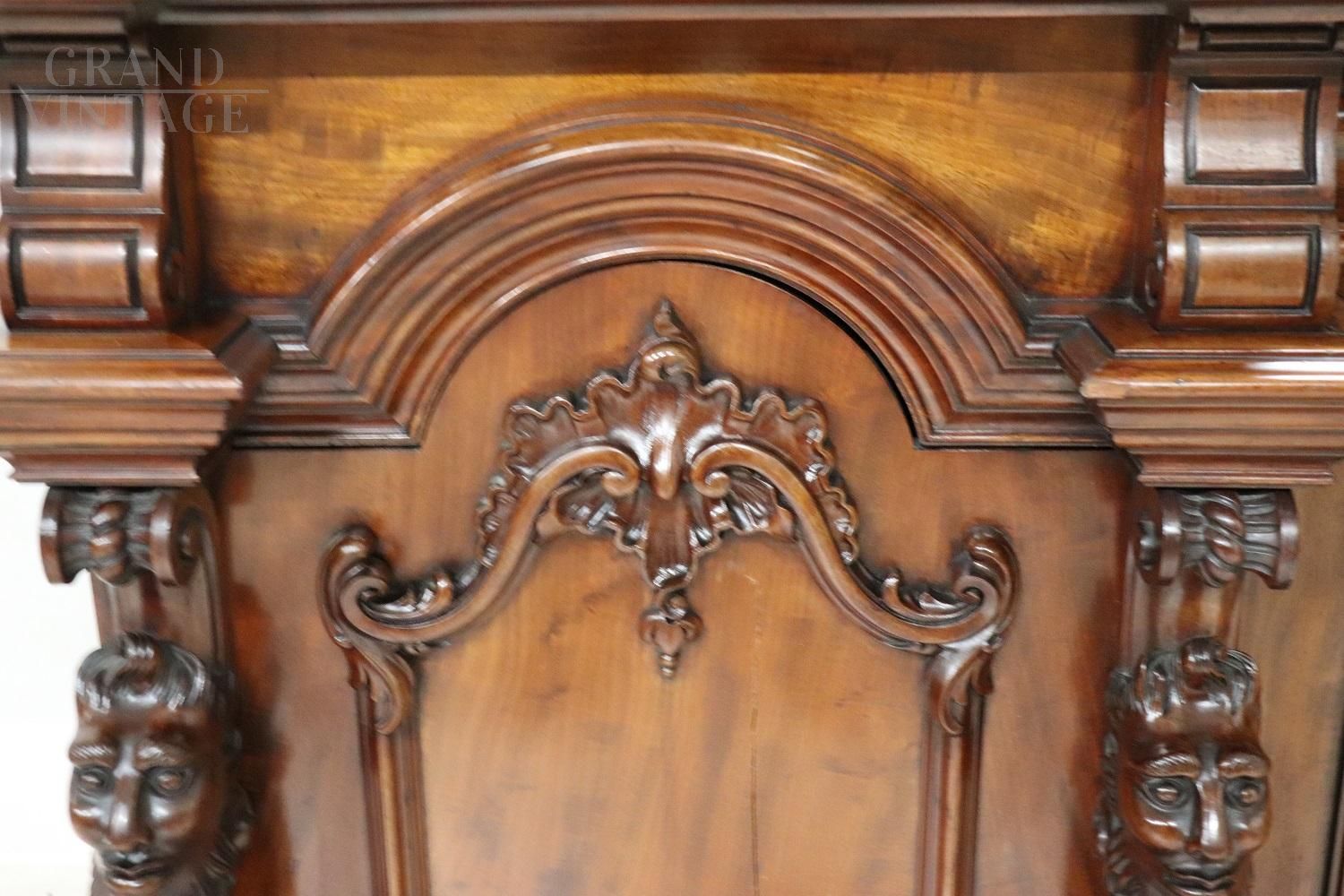 Imposing antique sideboard made in the first decades of the 20th century in precious mahogany wood, characterized by a large internal useful space with shelves and drawers. Simple and linear, it is enriched by important decorations carved in solid wood with grotesque elements of neo-Gothic inspiration. In excellent condition, the replacement of the internal green lining cloth is recommended. Perfect as a furnishing element also for clubs and restaurants. Great negotiable price.