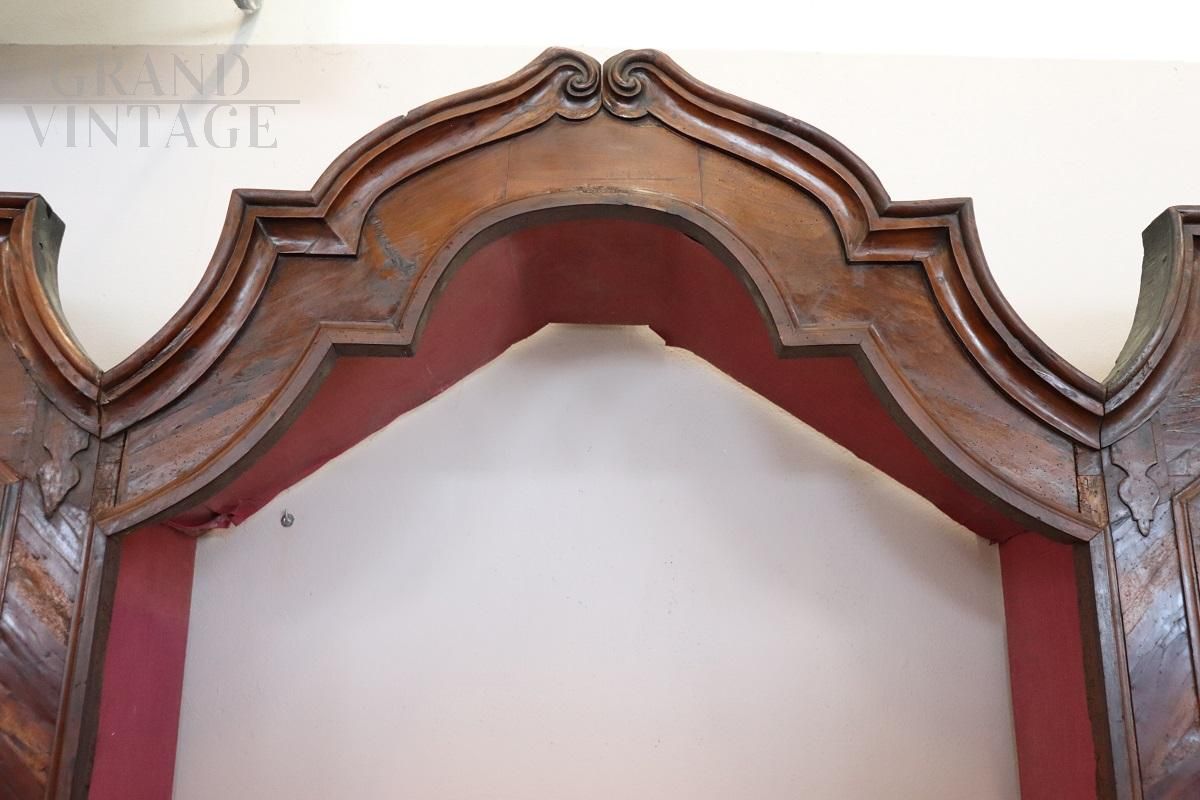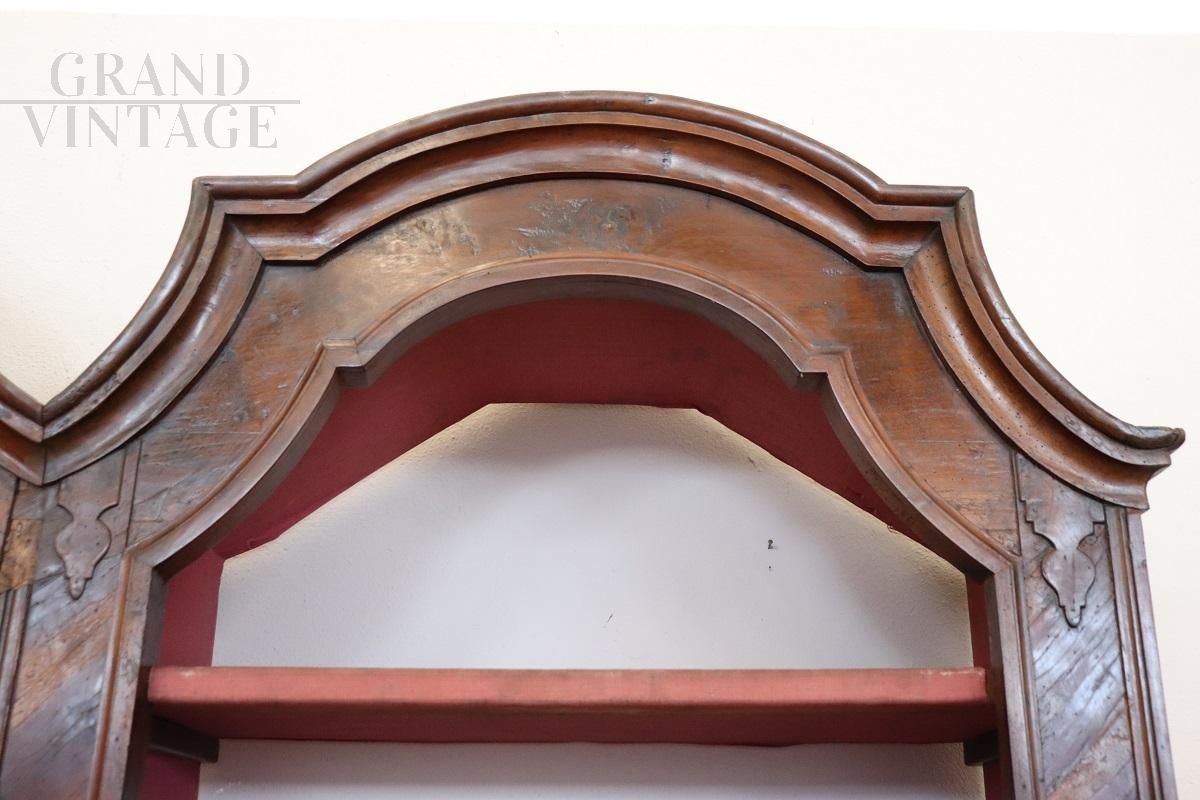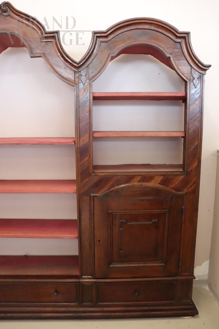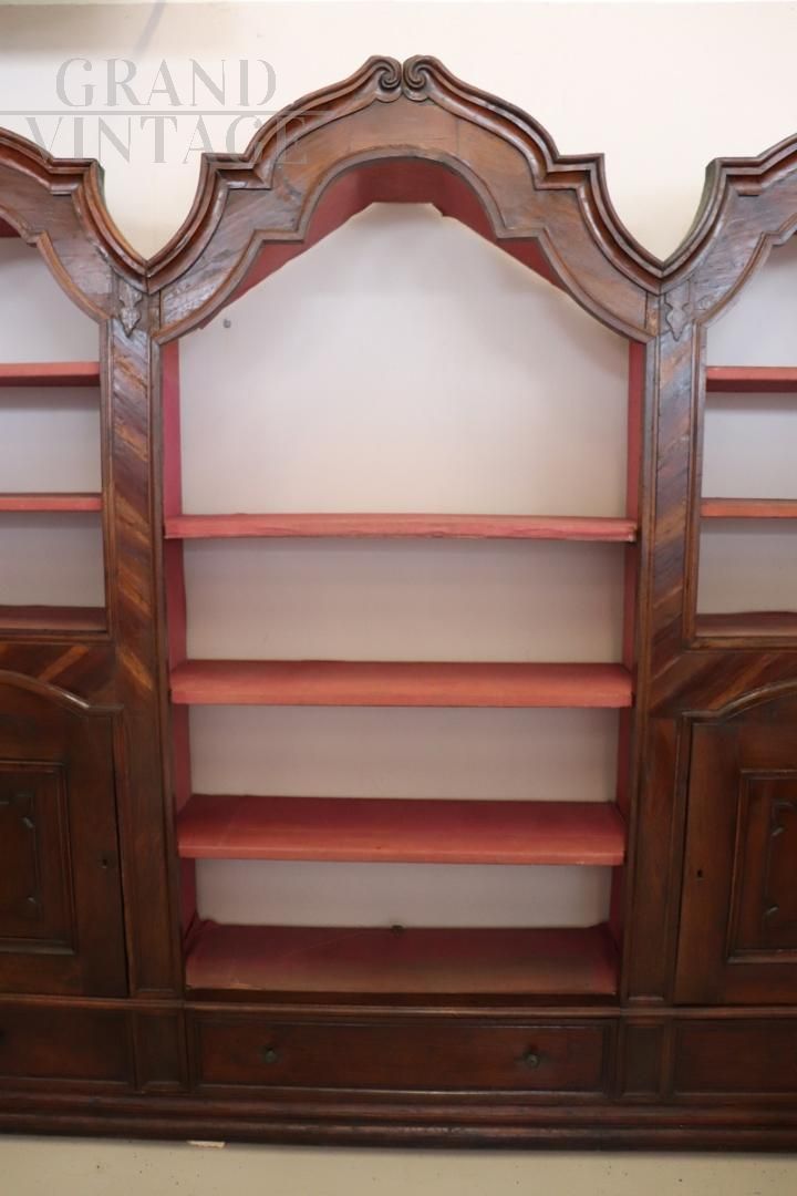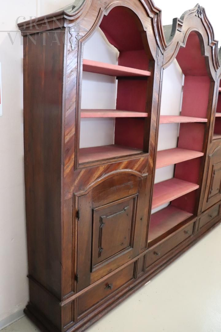 Extraordinary ancient baroque bookcase, an authentic masterpiece that embodies the charm and history of the 17th century. Made of fine walnut wood, this bookcase embodies the essence of baroque elegance, with sophisticated and flowing lines that reflect a simple decoration, avoiding excessive ornamentation and maintaining a perfect balance between functionality and beauty. The bookcase is designed with three modules, equipped with visible shelves in the upper part, the two lateral bodies, in the lower part, are enriched with closed doors which offer a further storage opportunity. Each module is also equipped with a drawer at the bottom. The back of the bookcase, although not visible in the images, is included in the sale and was left disassembled for logistical reasons.