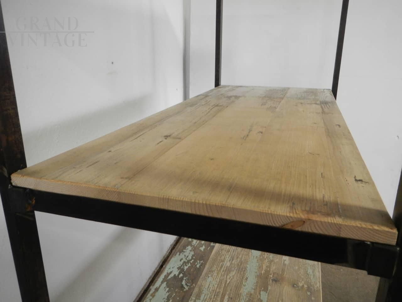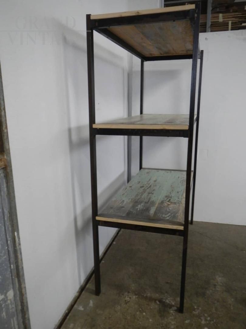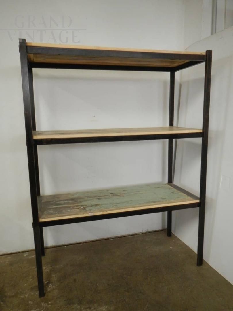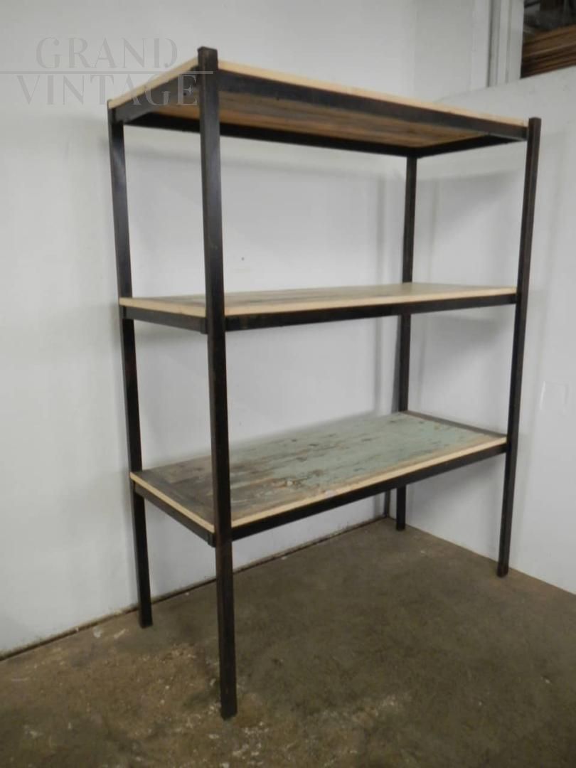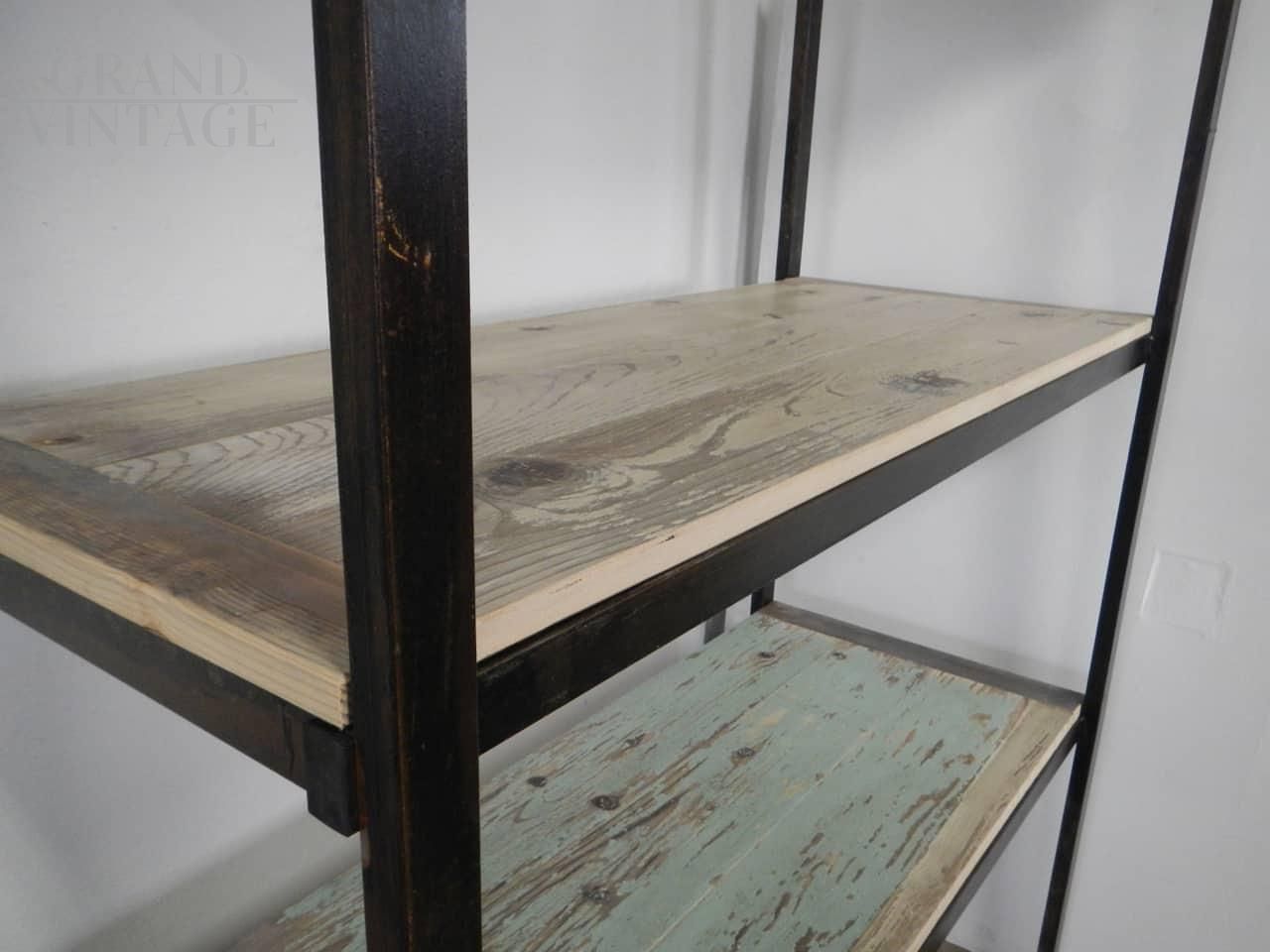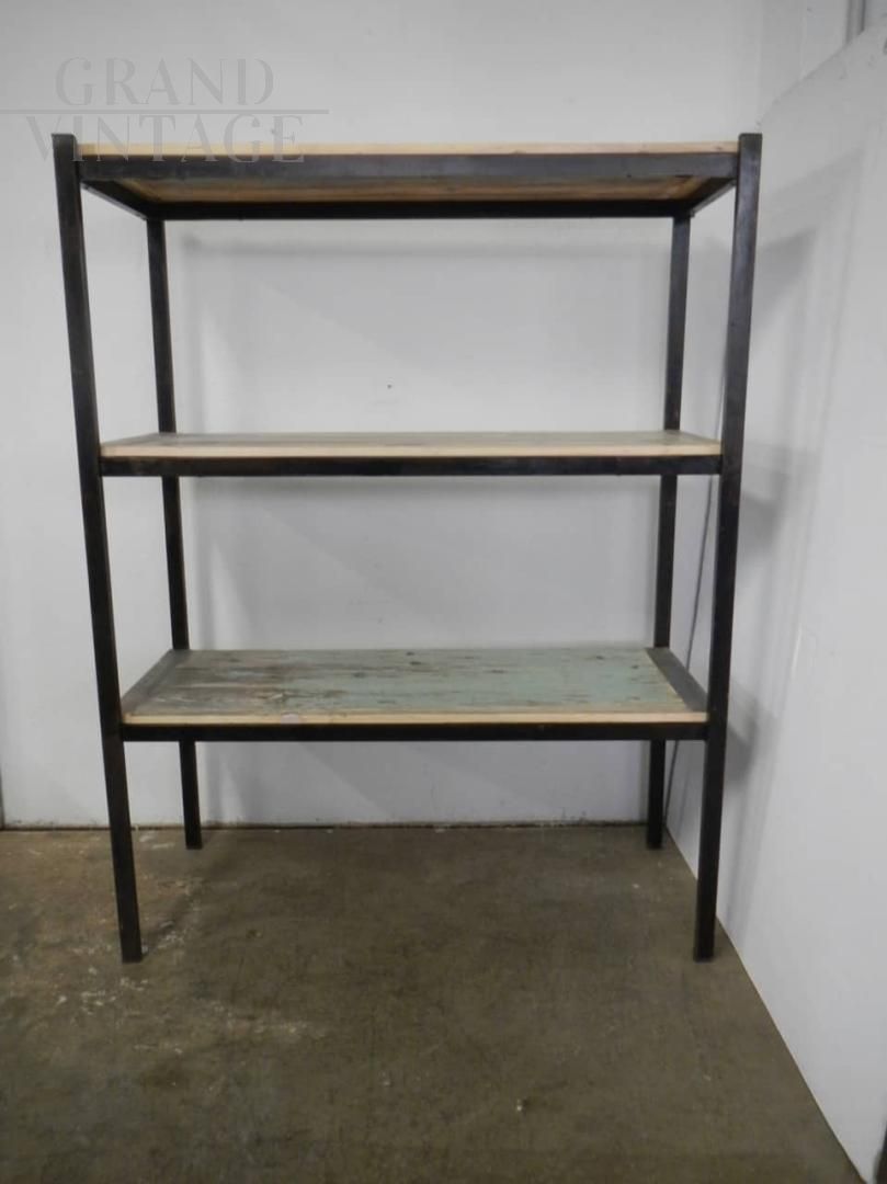Industrial bookcase in black painted iron with shelves in fir wood, in patina. In good condition, the shelves are fixed.