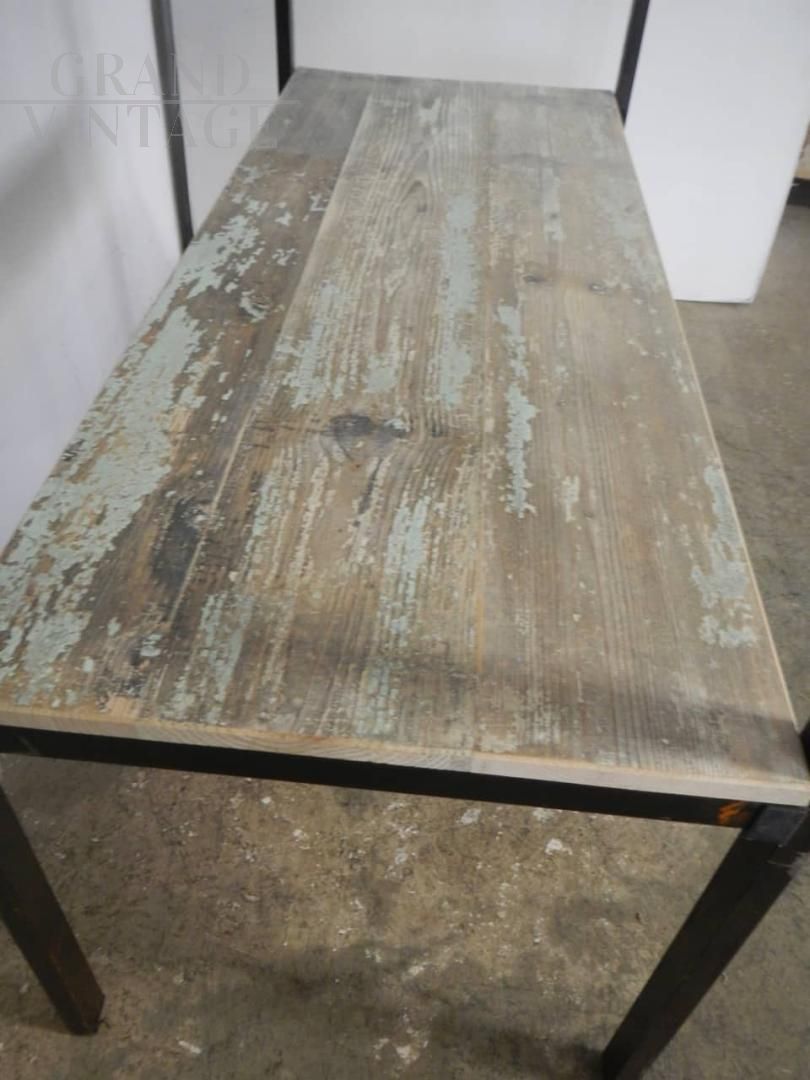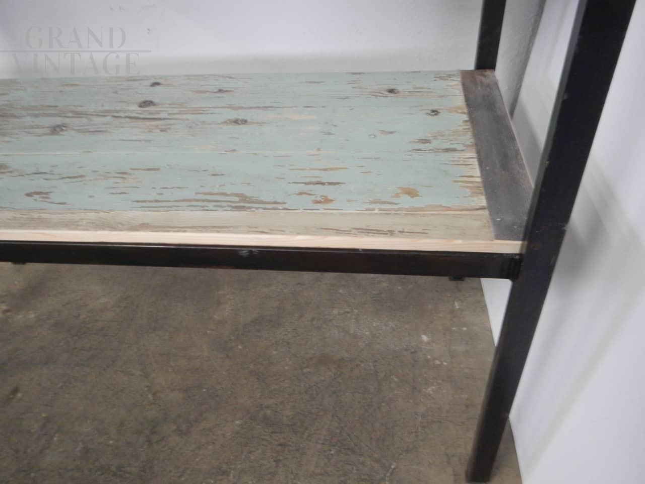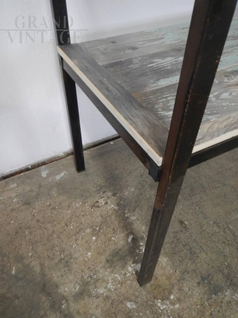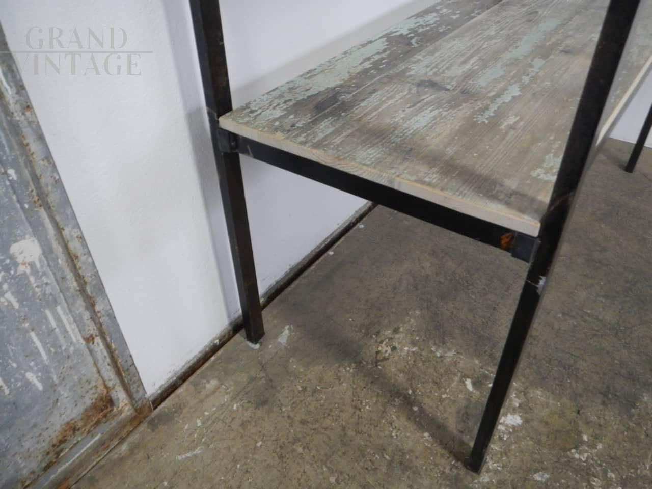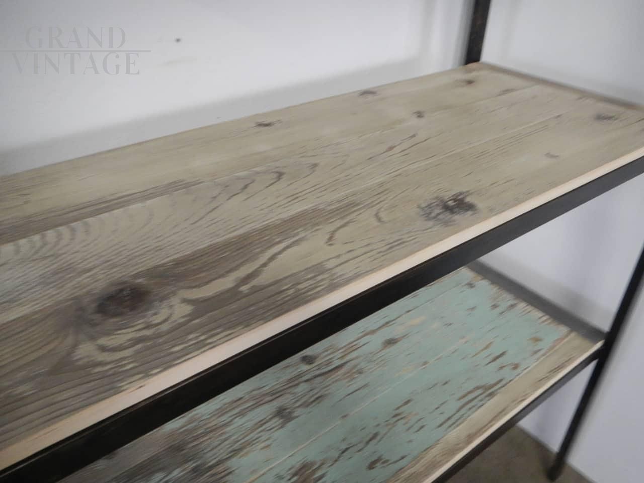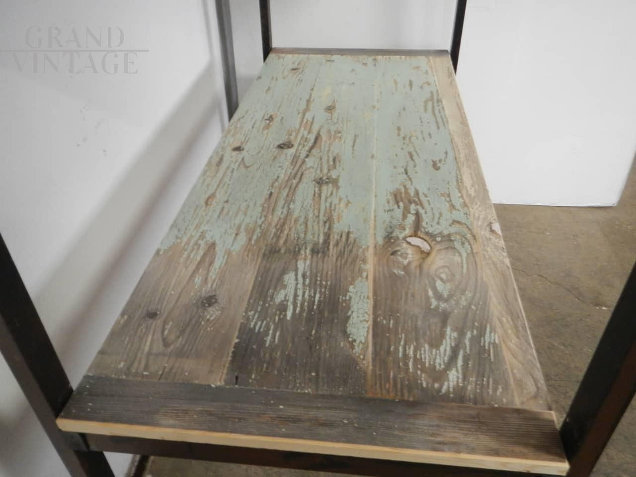 Industrial bookcase in black painted iron with shelves in fir wood, in patina. In good condition, the shelves are fixed.