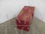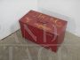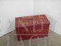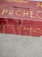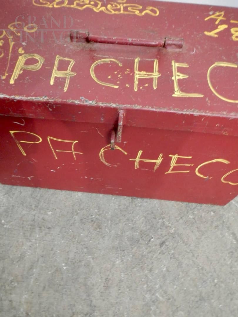 Industrial container case in red lacquered iron with yellow writings, cleaned and treated with wax. The writings probably refer to a surname, Pacheco, and a place, Caparica, on the coast of Portugal. Good construction with signs of use.