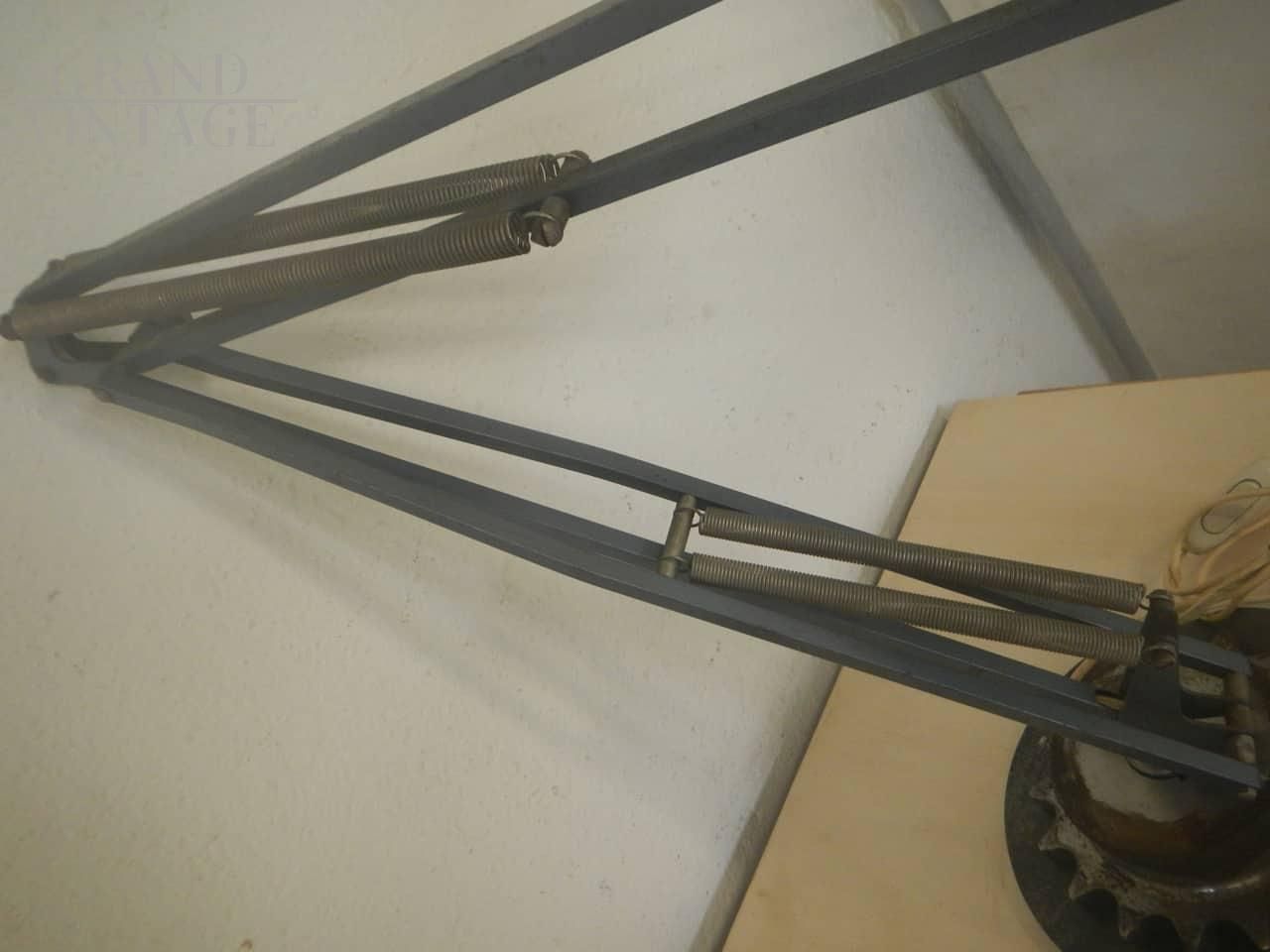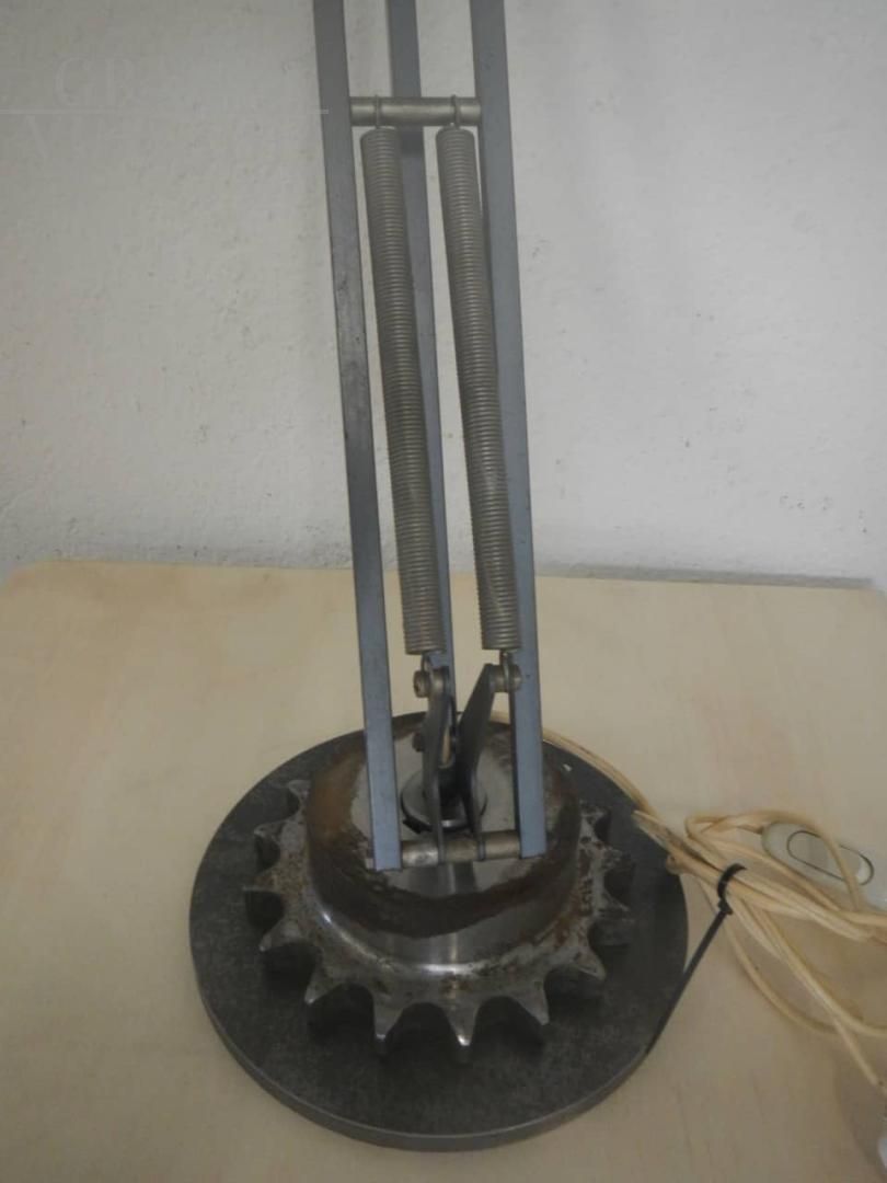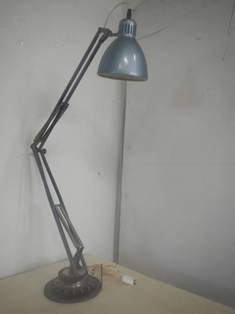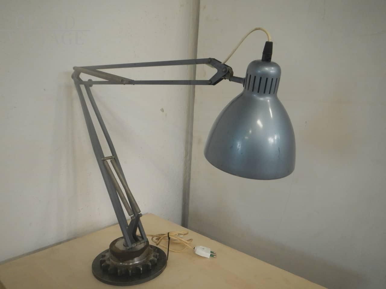 Vintage industrial style table or desk lamp in metallic light blue and white lacquered metal, a metal gear support has been applied to the base. Functional with switch for on and off, adjustable in various heights. Bell diameter 16 cm. In good condition.