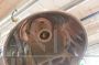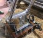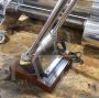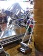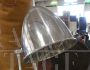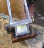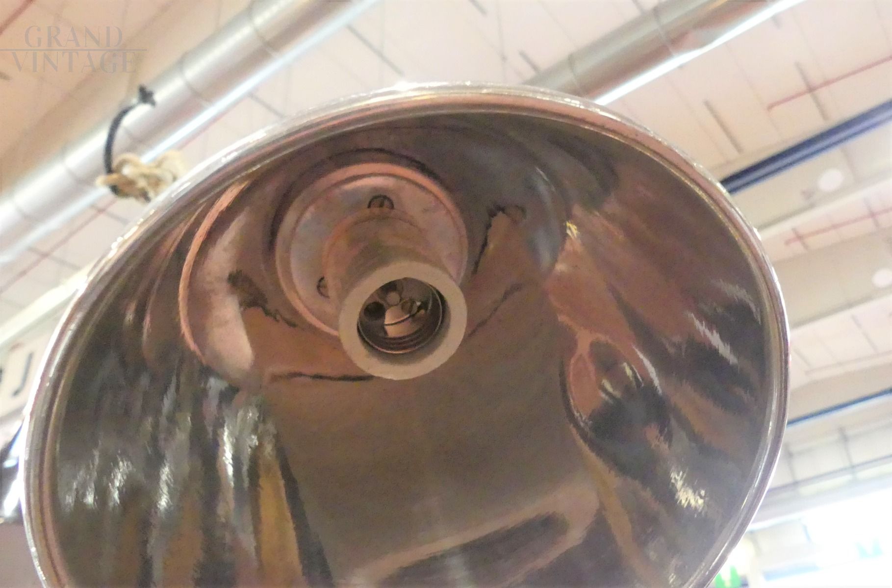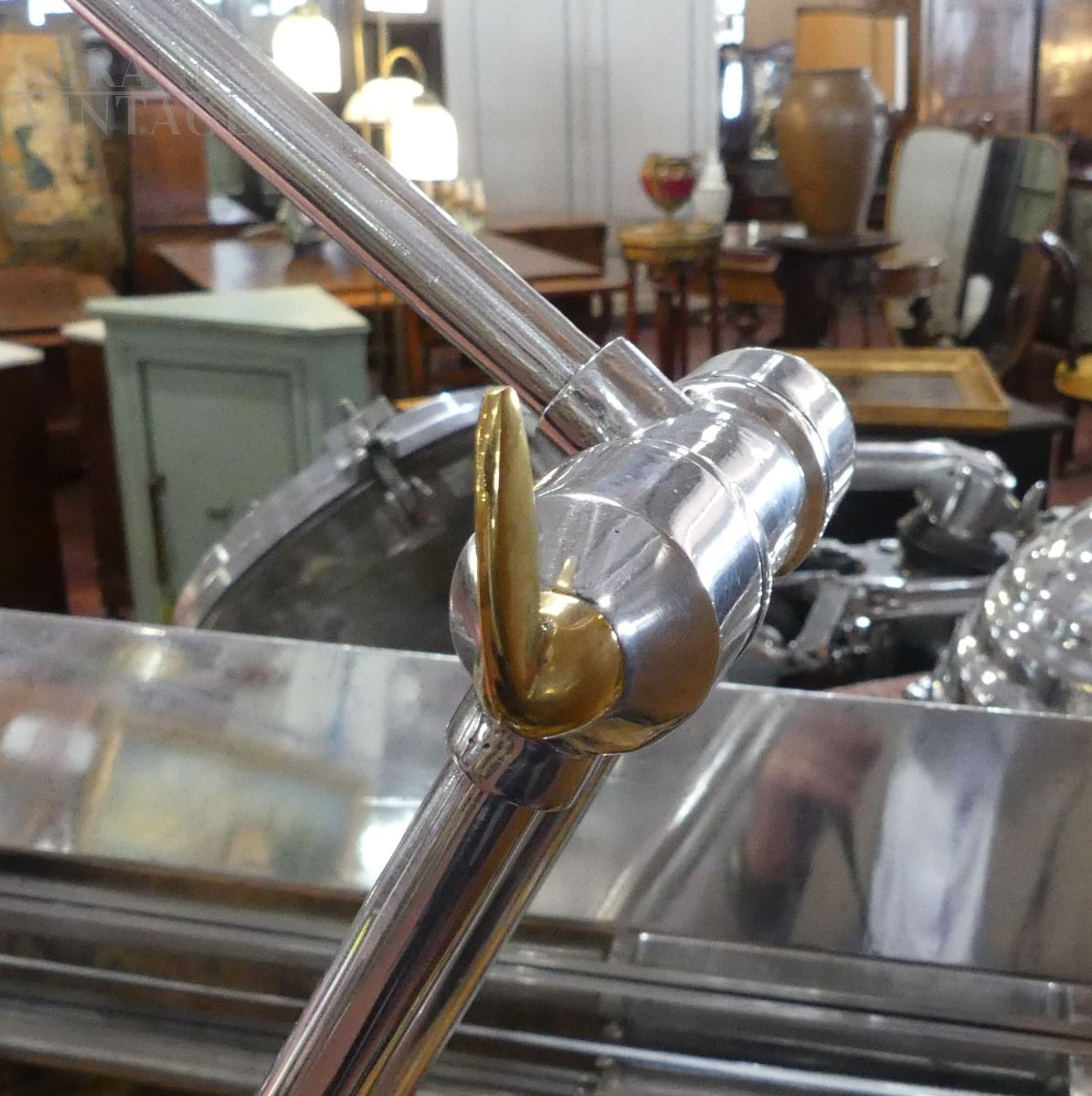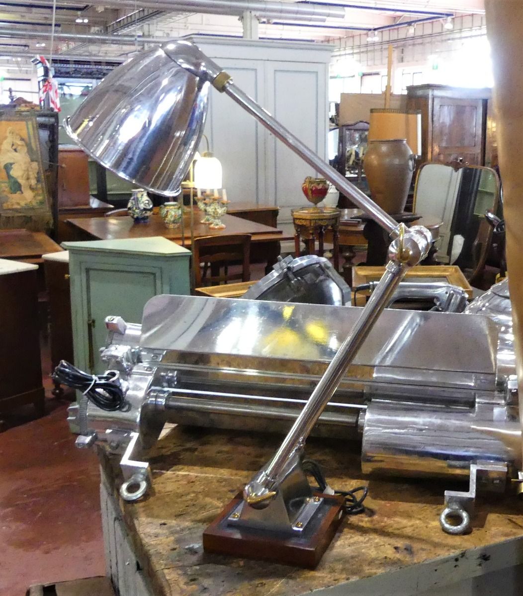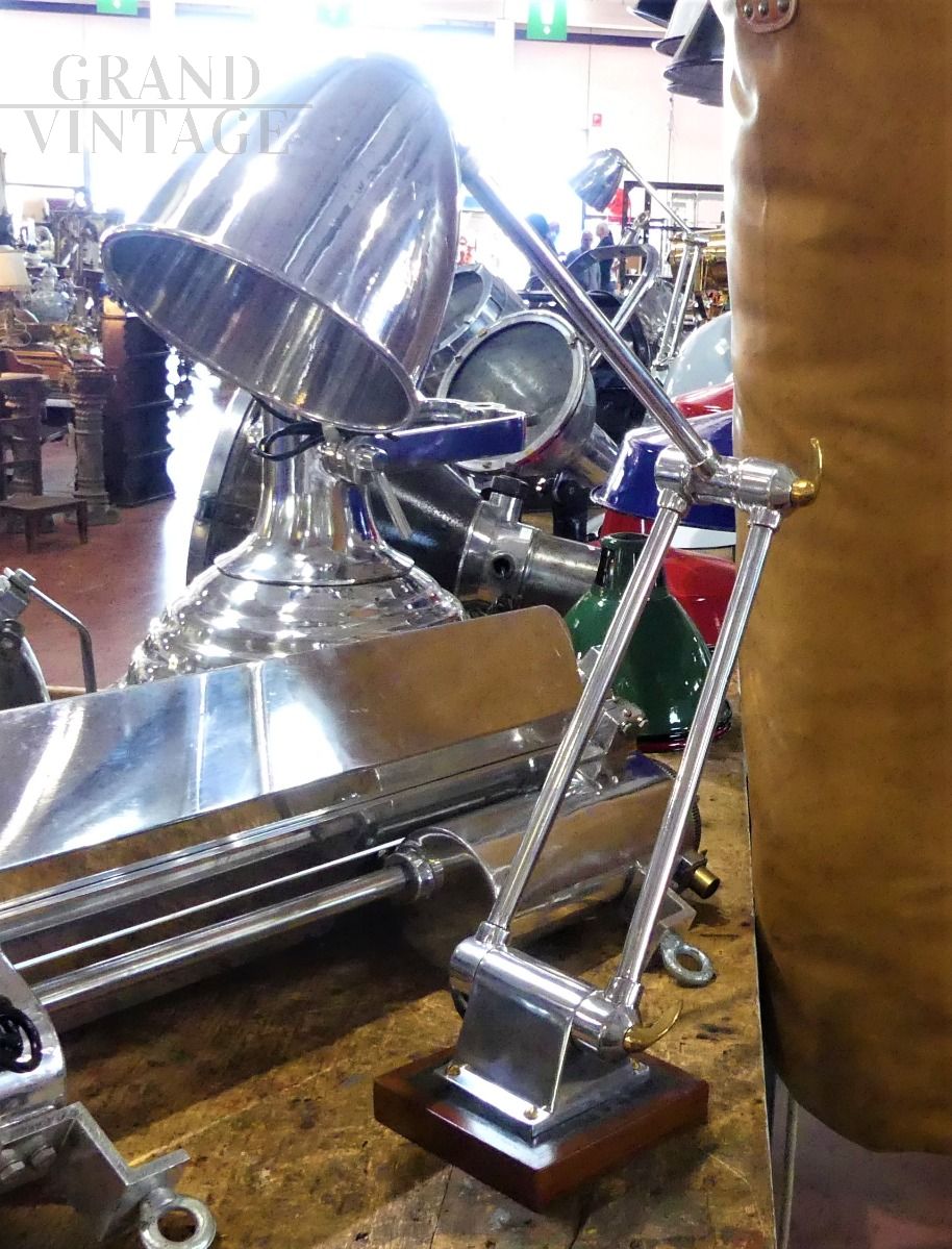 Industrial desk lamp, this is a sanding table wall lamp that has been adapted to a table lamp. The lamp is in chromed metal and rests on a wooden base, a touch of elegance is given by the gold-colored screws and levers for adjustment.