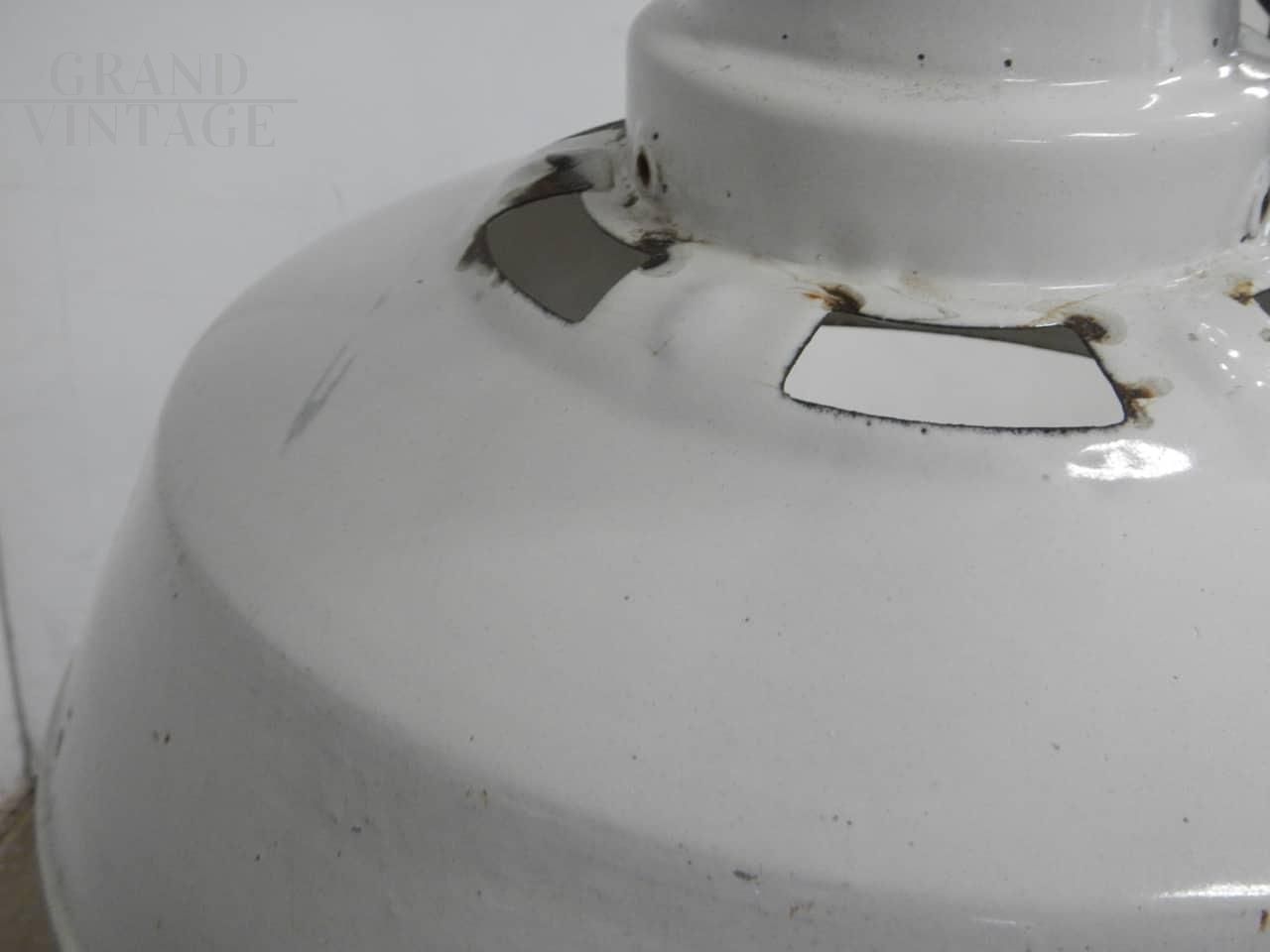Industrial funnel-shaped suspension lamp in cream-white metal with white interior, with a diameter of 45 cm, from the 1950s, electrical system redone and in working order with E27 bulb socket. In good condition with evident signs of use, as shown in the photos.