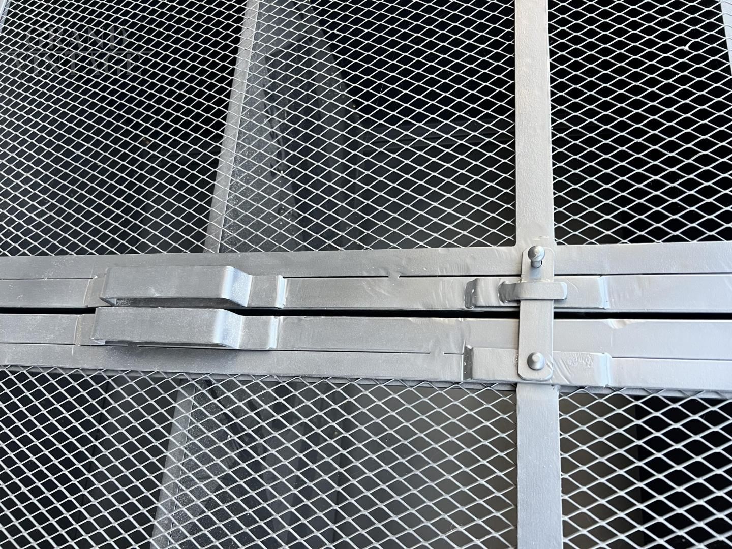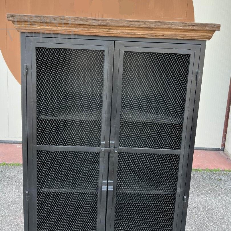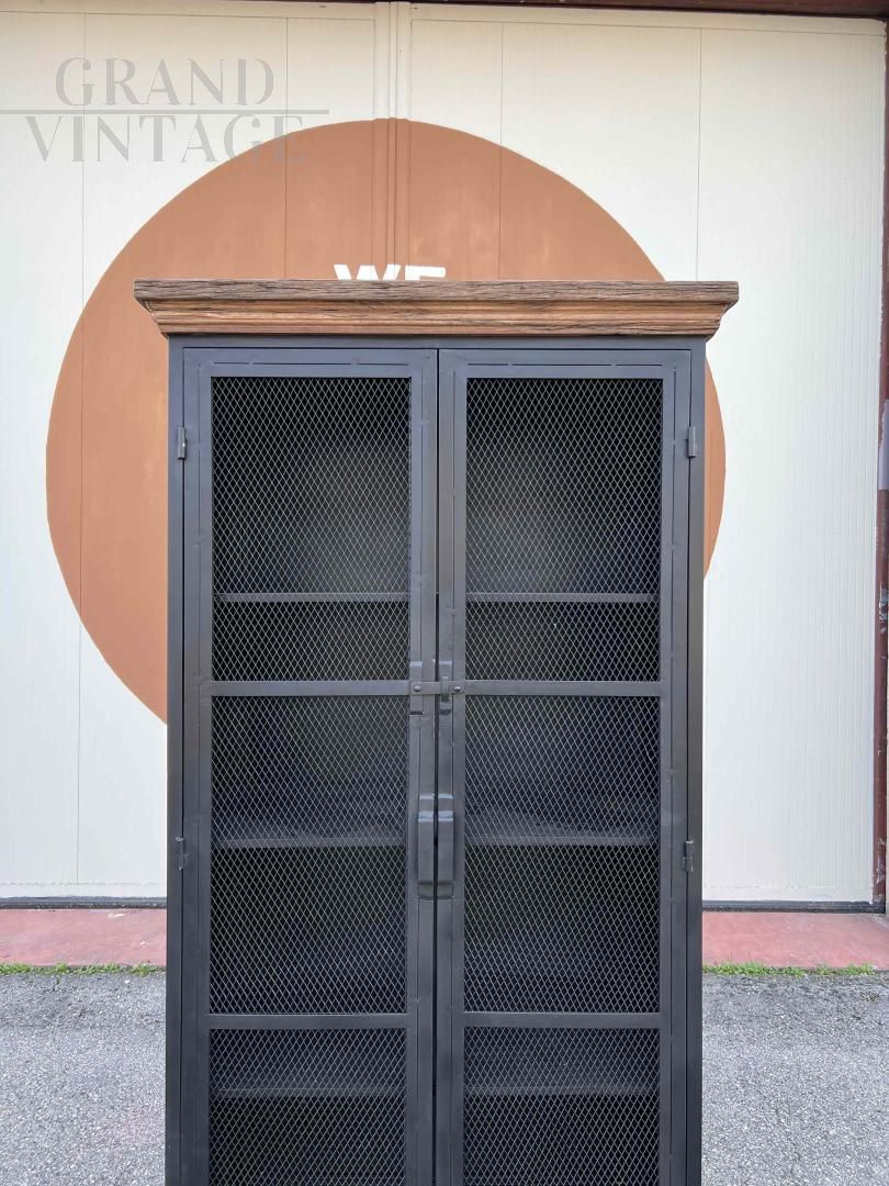 Vintage industrial wardrobe, locker or pantry cabinet in black metal with mesh doors and interior organized into 4 shelves, the upper top is made of wood.
