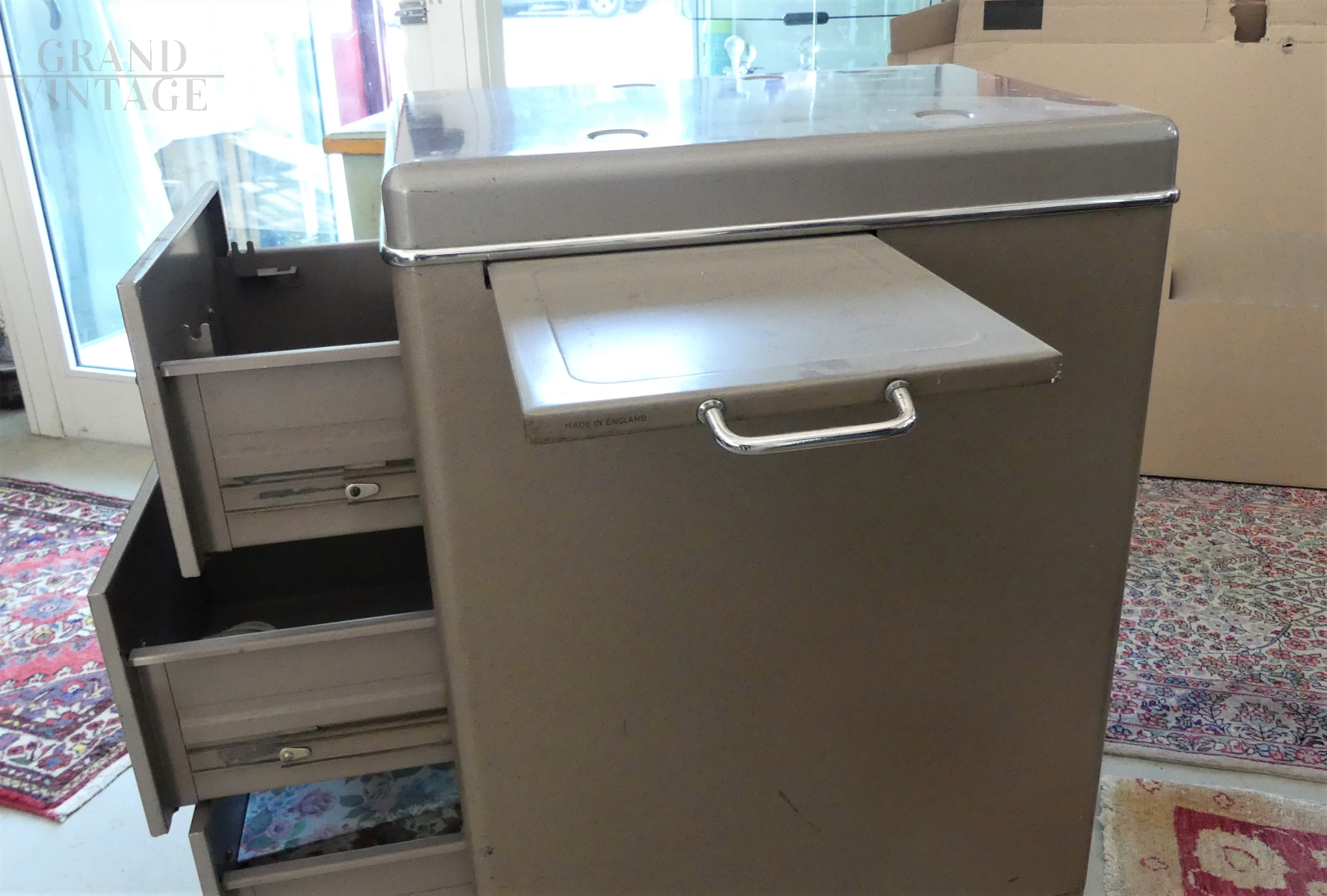 Industrial office chest of drawers, vintage 40s, with metal structure, three capacious drawers and a small pull-out top positioned on the side.