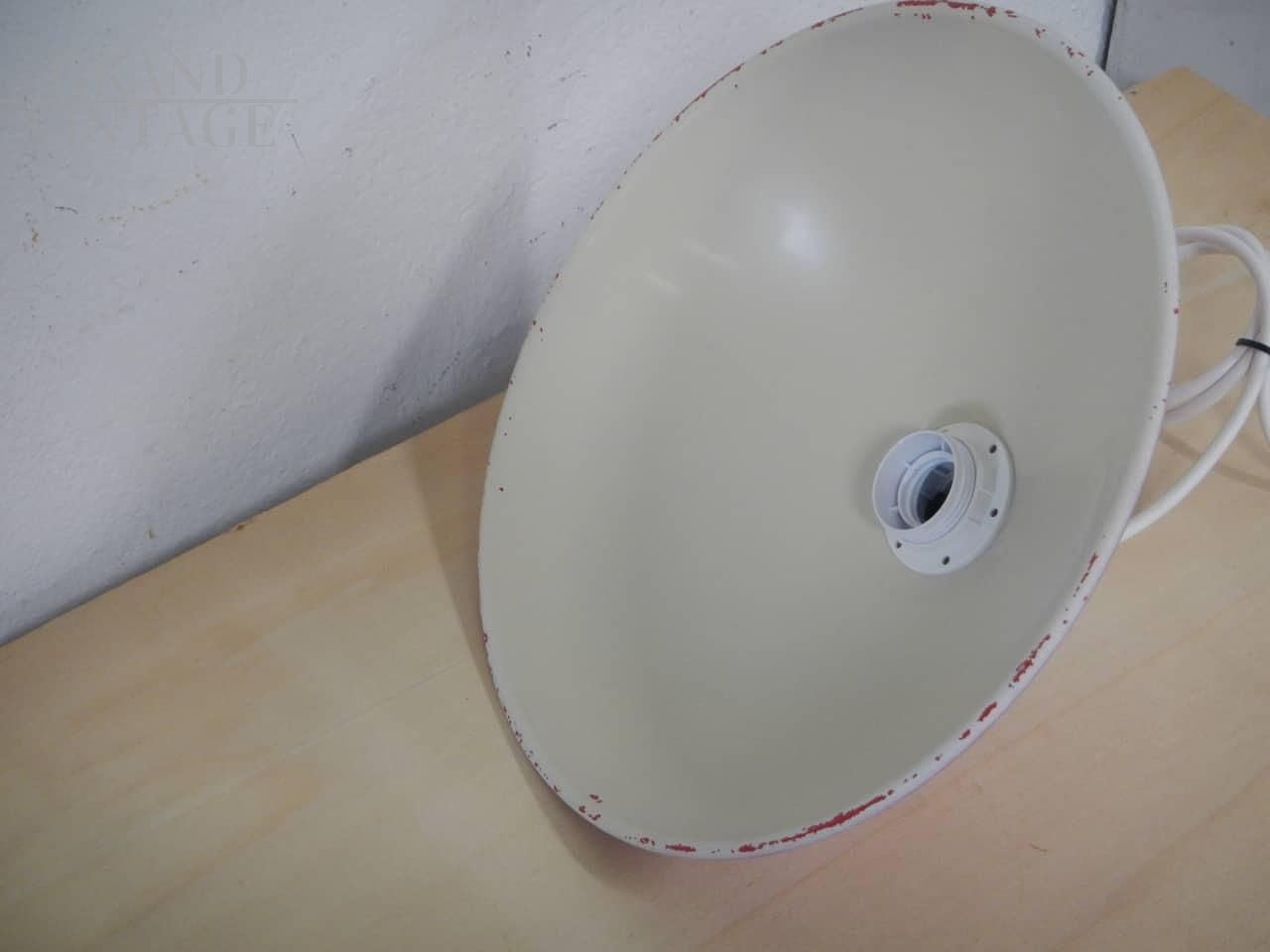 Bowl pendant lamps in red enamelled metal, industrial style from the 80s, with working electrical system, in good condition with signs of aging, especially the color has faded in some parts. Available in 4 pieces, the price refers to a single piece.