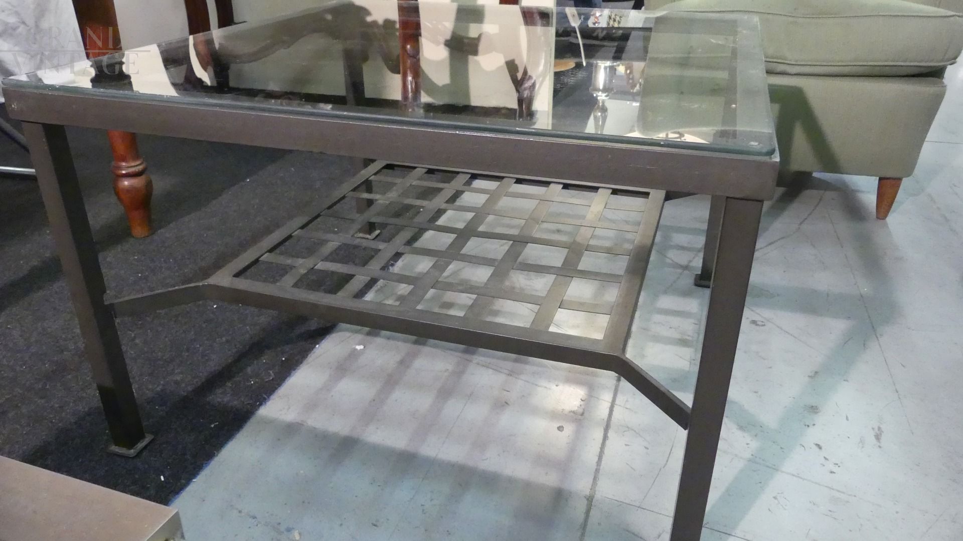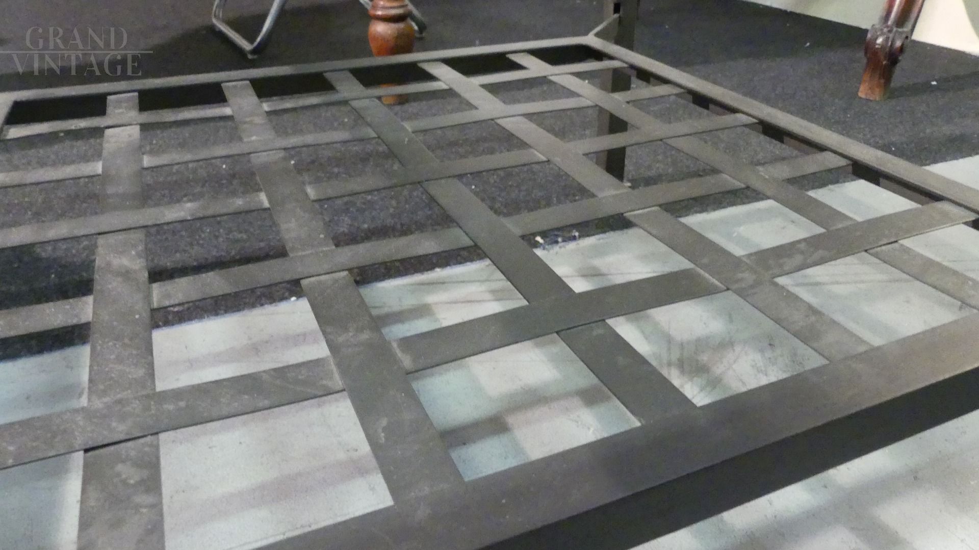 Industrial style coffee table in metal from the 70s, with glass top and undertop in intertwined metal strips, the square feet are very particular.