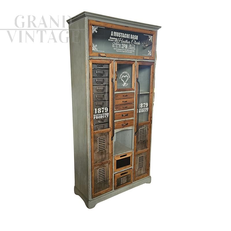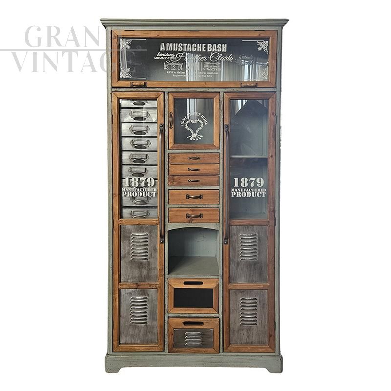 Vintage English style shop display cabinet in lacquered wood with metal drawers and glass doors with writing, also perfect as a cupboard for an industrial style kitchen.