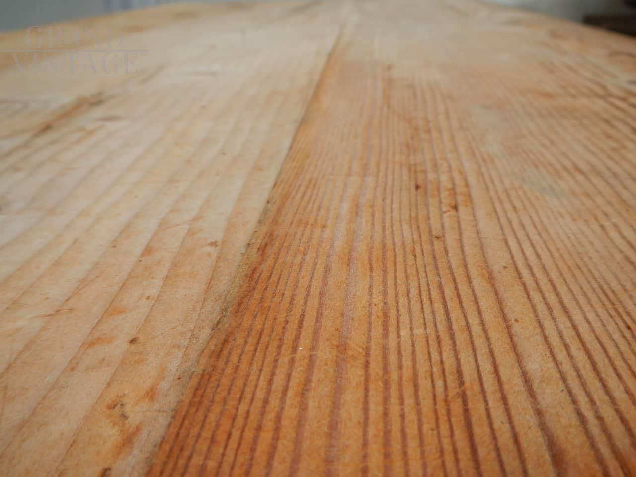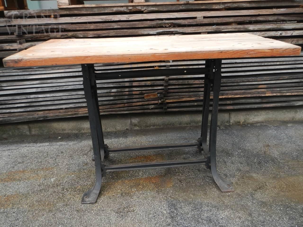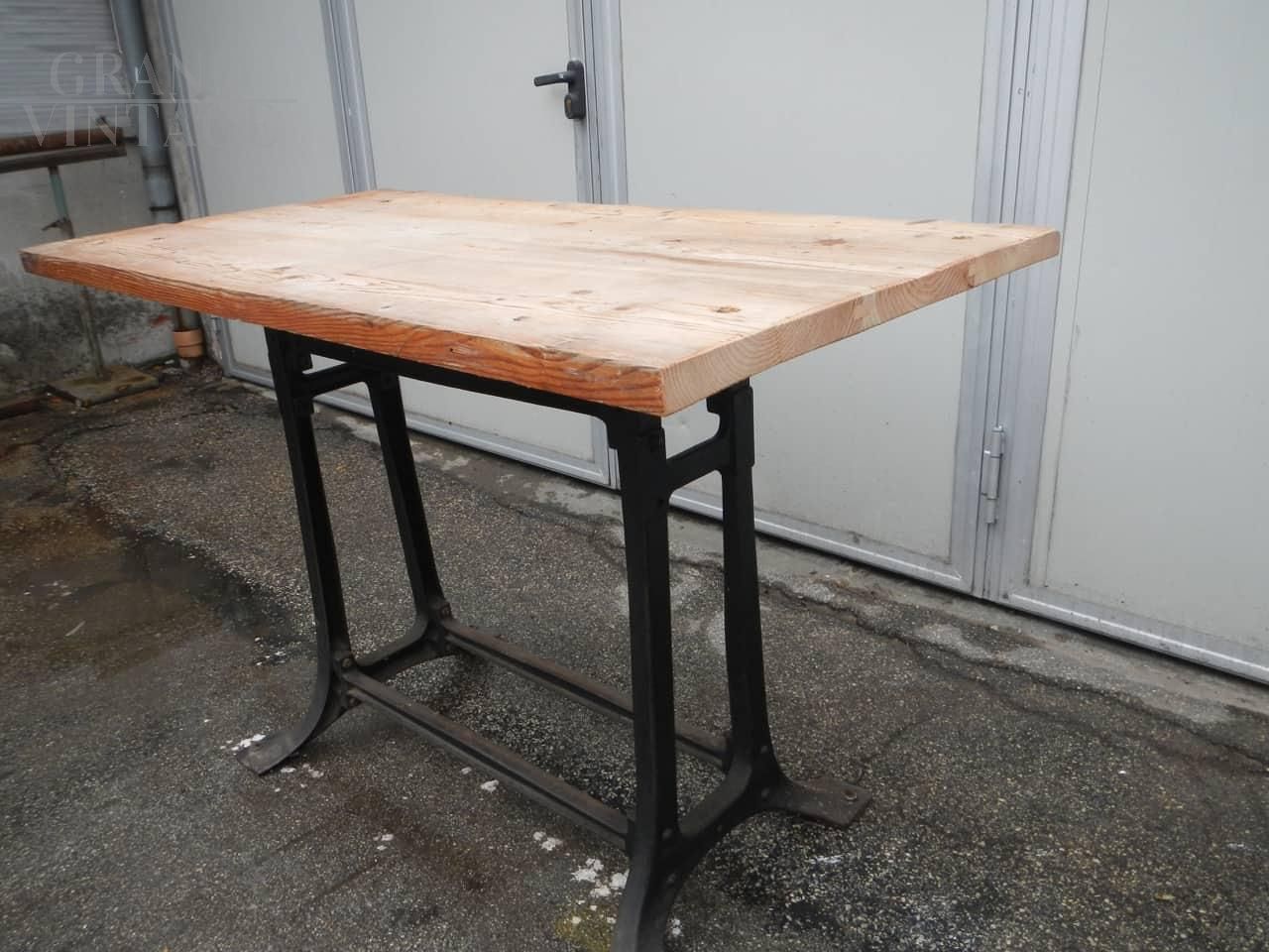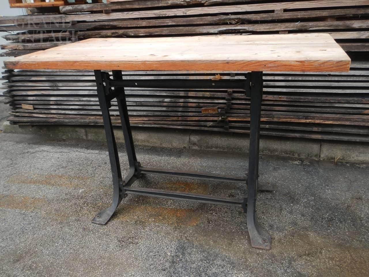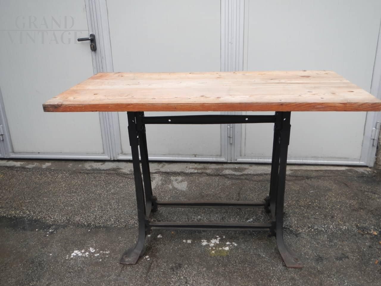Industrial work table with cast iron base and patina fir top. 1950s, composition of two elements.