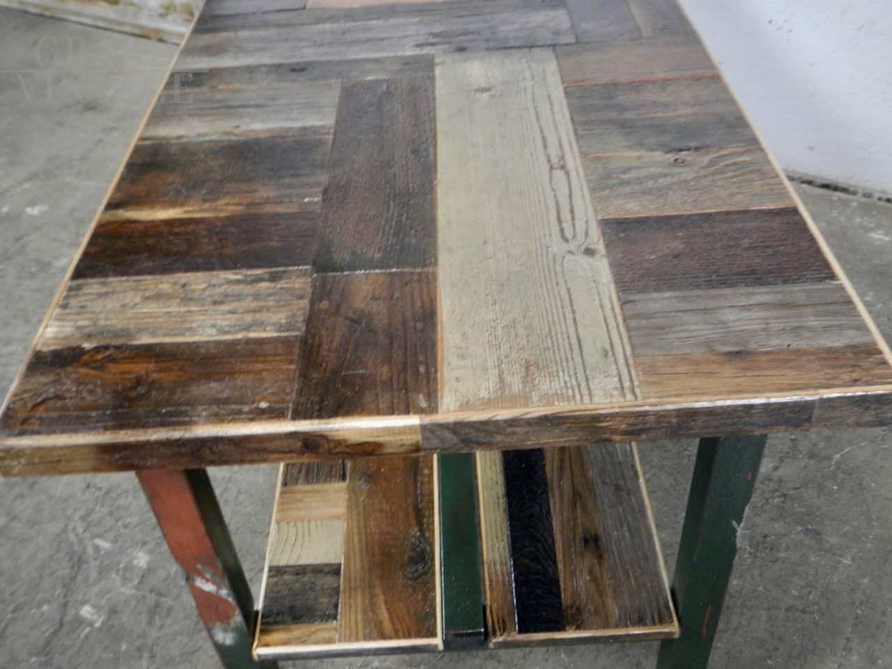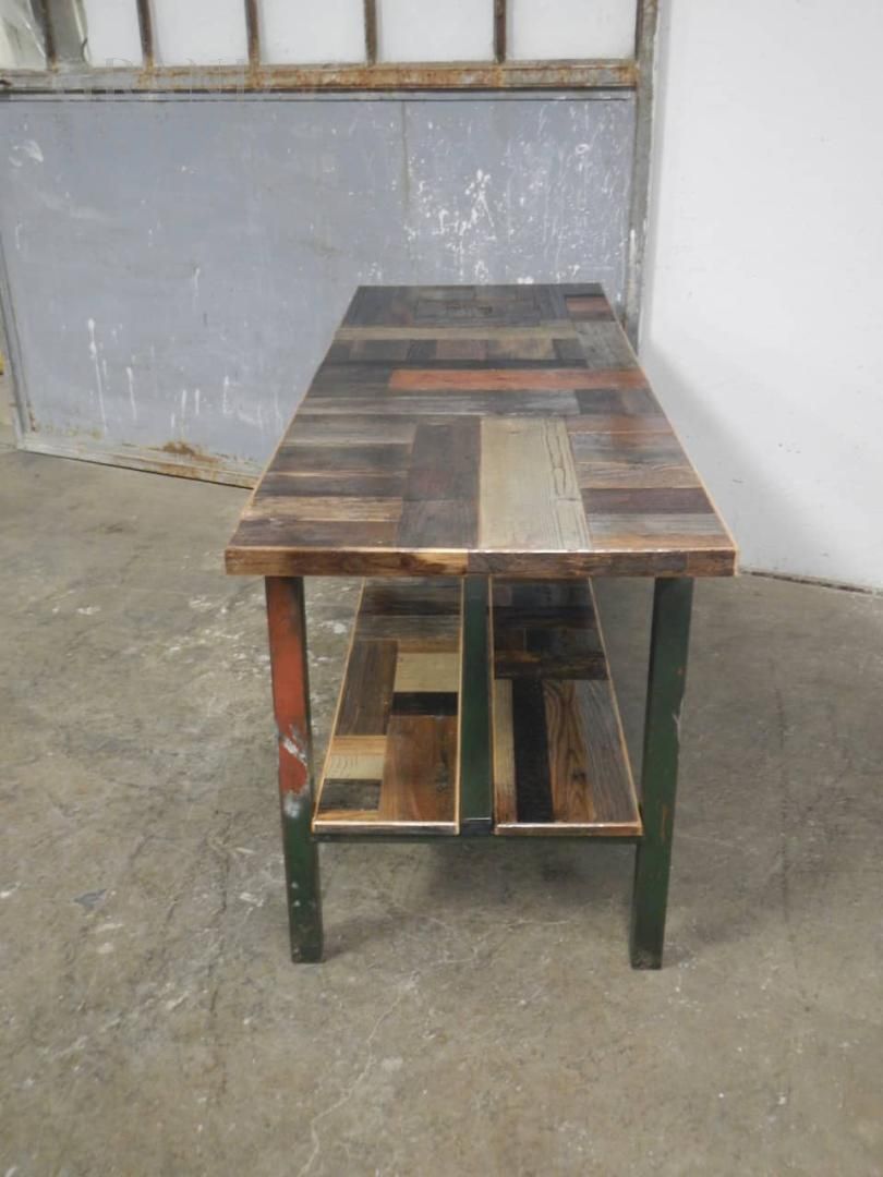Industrial table shelf workshop bench in green metal finished with 2 shelves in 3 cm thick fir wood worked in patchwork style with shades of brown. The distance between the shelves is 39 cm. In good condition, restored and treated with wood varnish.