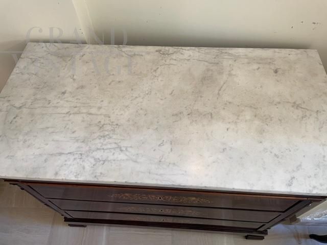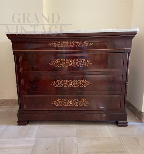 Elegant and refined dresser from the Charles X period in mahogany wood with boxwood inlays and top in white Carrara marble. Italian manufacture from the first decades of the 19th century.