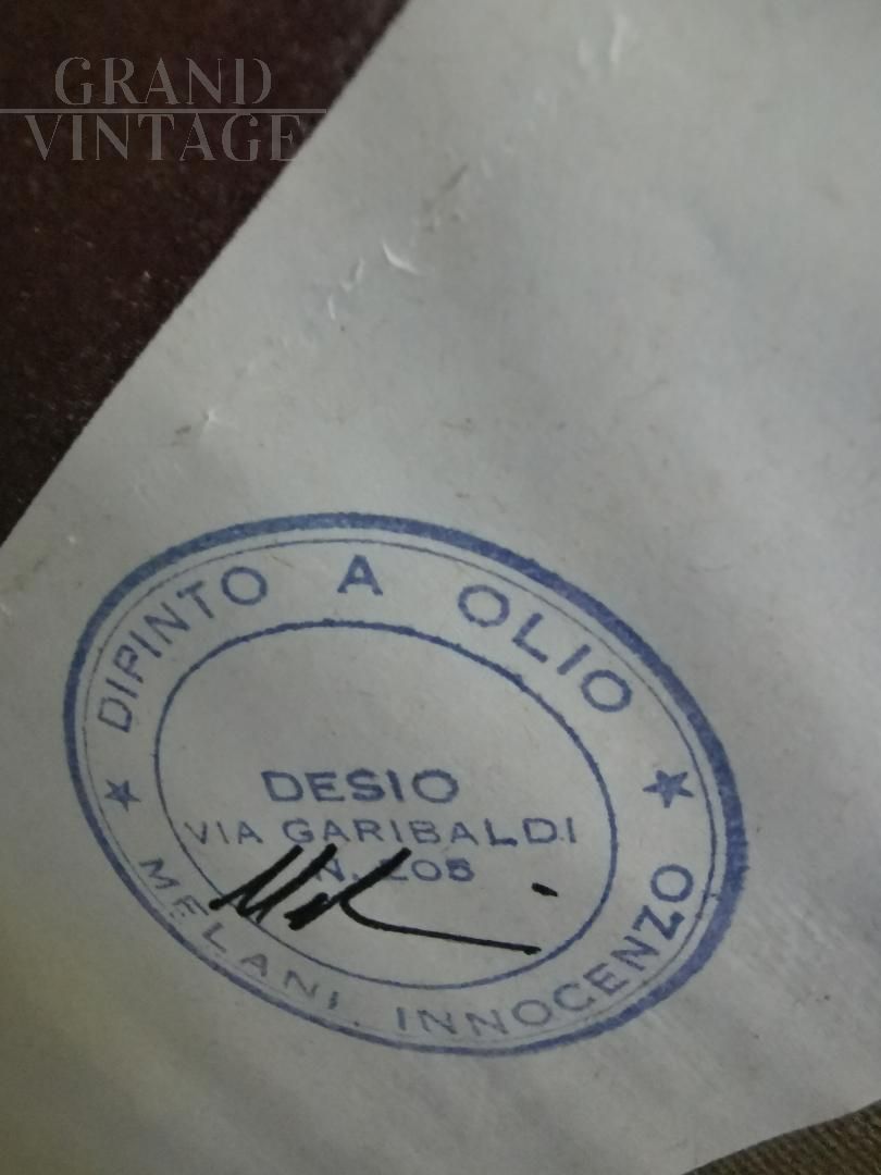 Painting Altalena by Innocenzo Melani depicting a girl on a swing, oil on canvas signed, numbered 80 and dated in the 1974 yearbook, complete with certificate of originality.