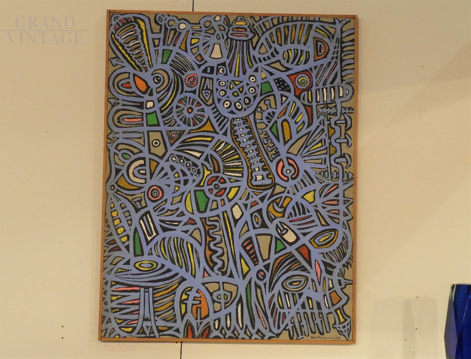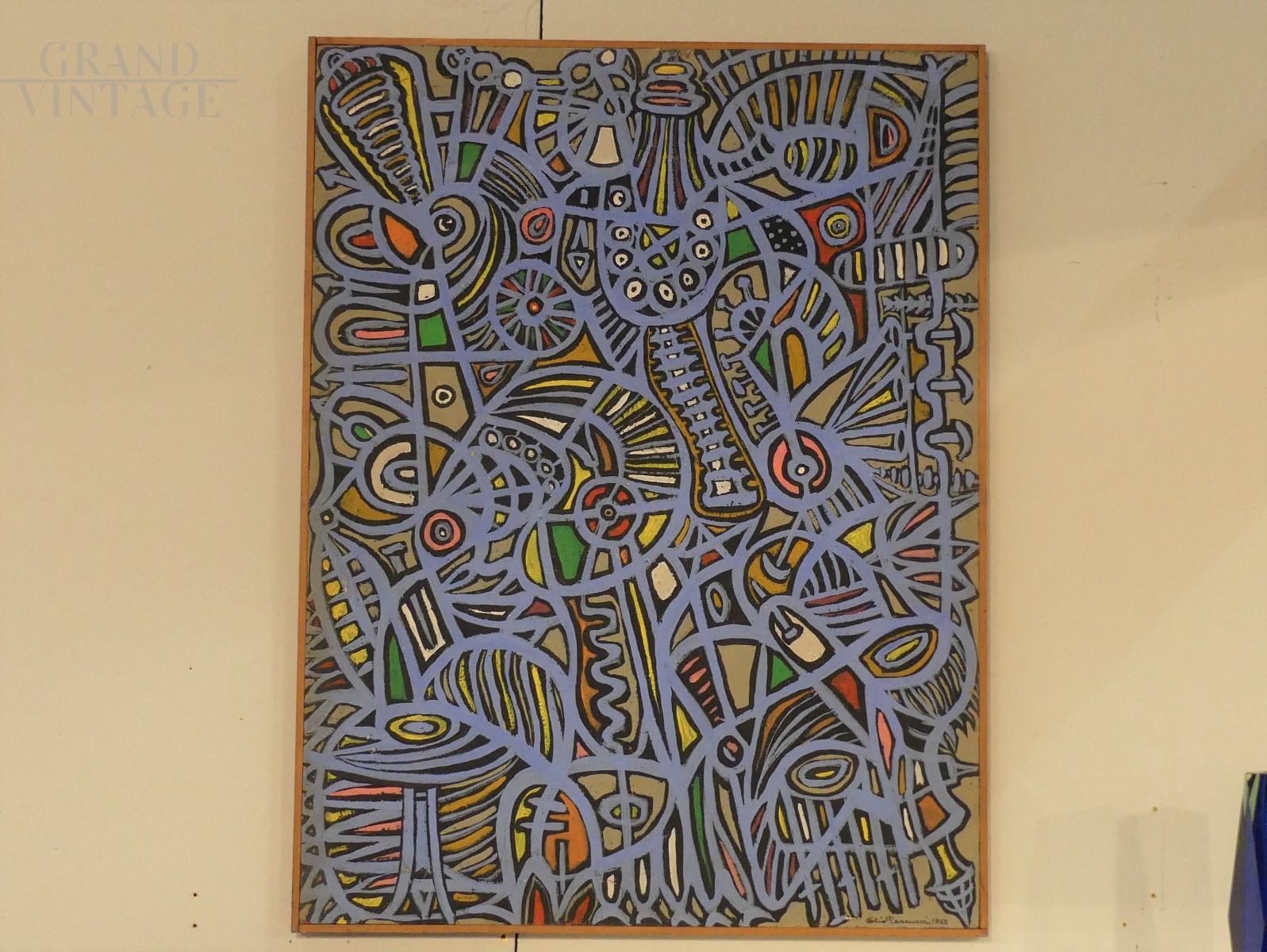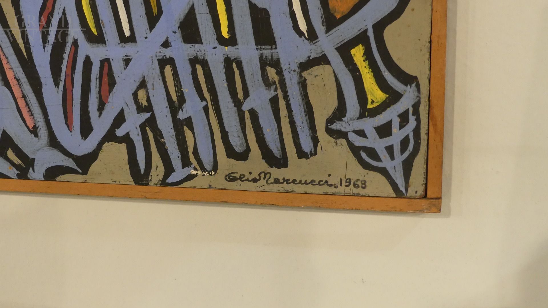 Painting by Elio Marcucci entitled Intrico, precursor of the Pop-Art style, acrylic on wood, signed and dated 1968.
