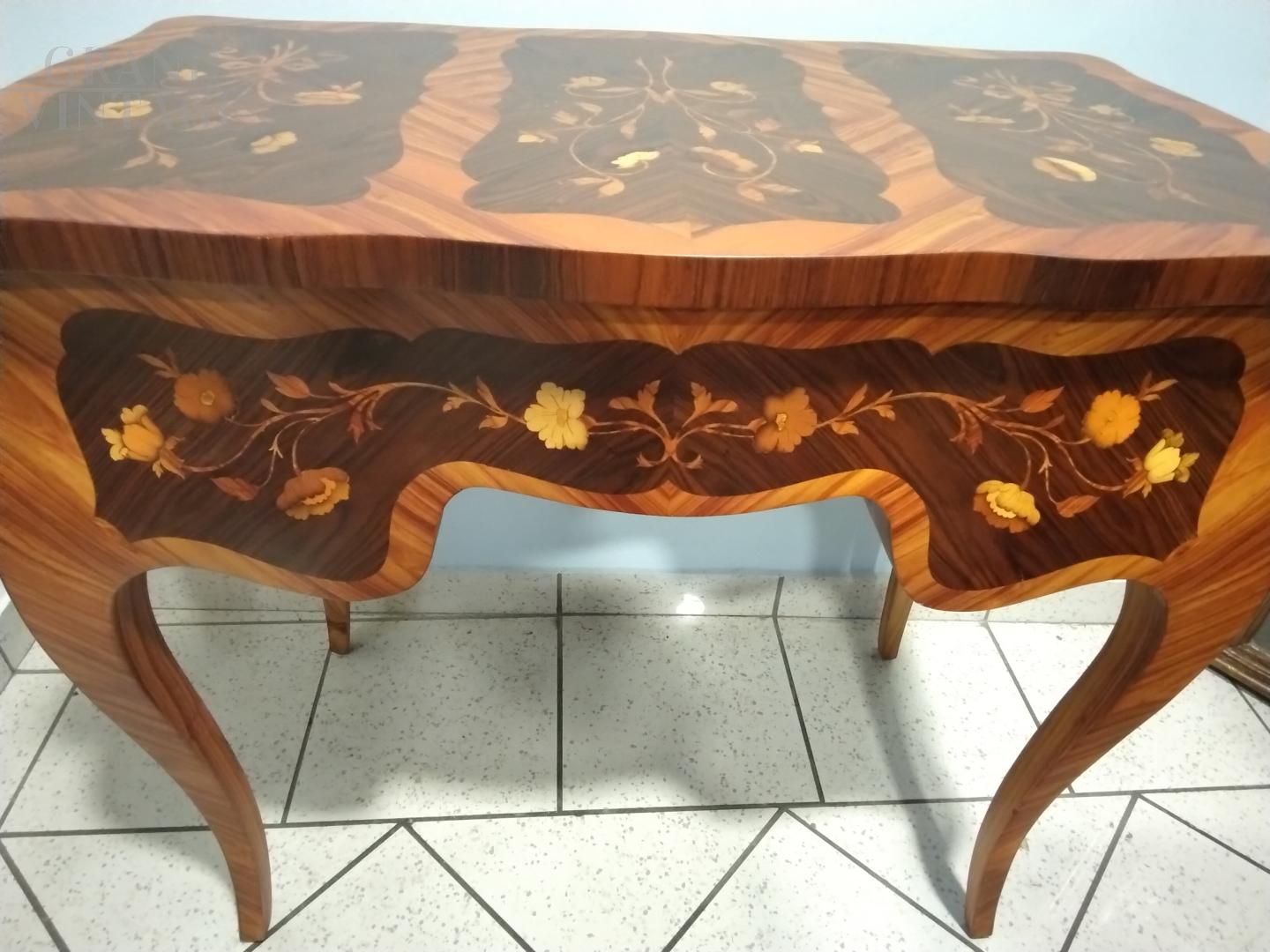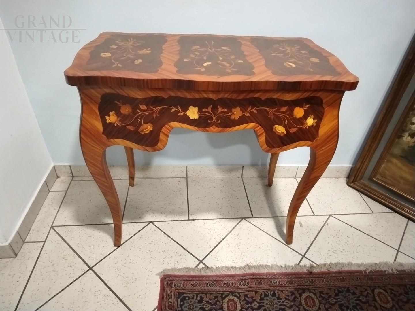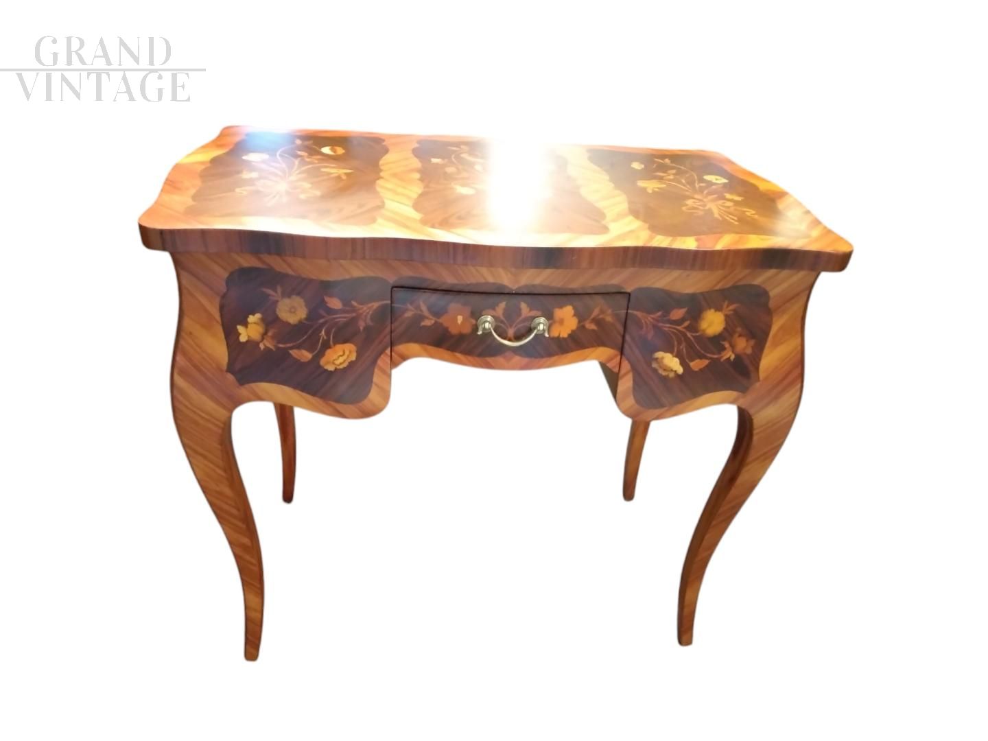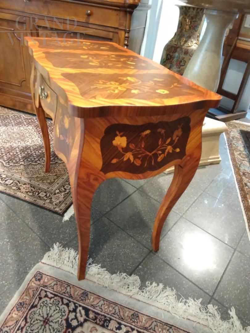 Antique style center desk in bois de rose with a rich floral inlay in various wood essences on all sides, complete with drawer, made in Italy in the 1970s. Restored.