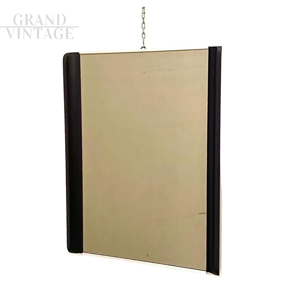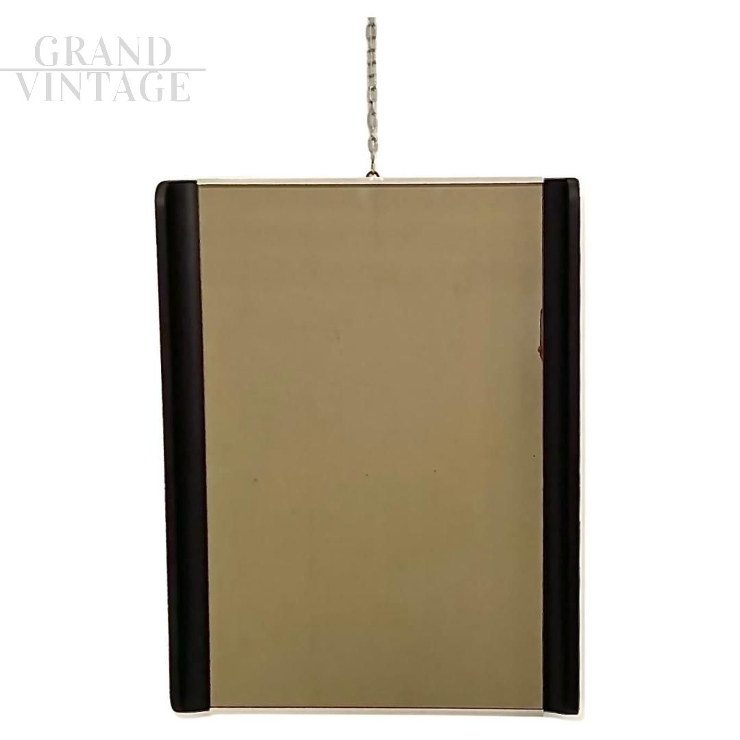 Vintage Italian barber shop mirror from the 1970s with chromed iron frame and two curved black iron strips on the sides. The back is made of wood. No damage or cracks, very good condition with some natural signs of wear and use.