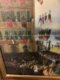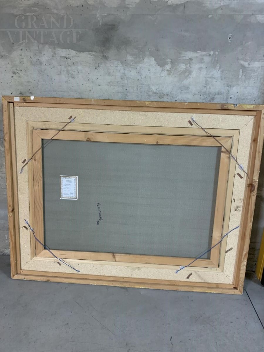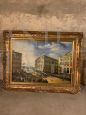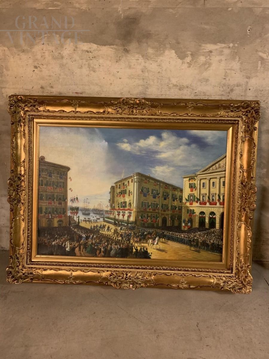 Painting by Flavio Bonanni with an Italian landscape in celebration, oil on canvas with gilded frame.