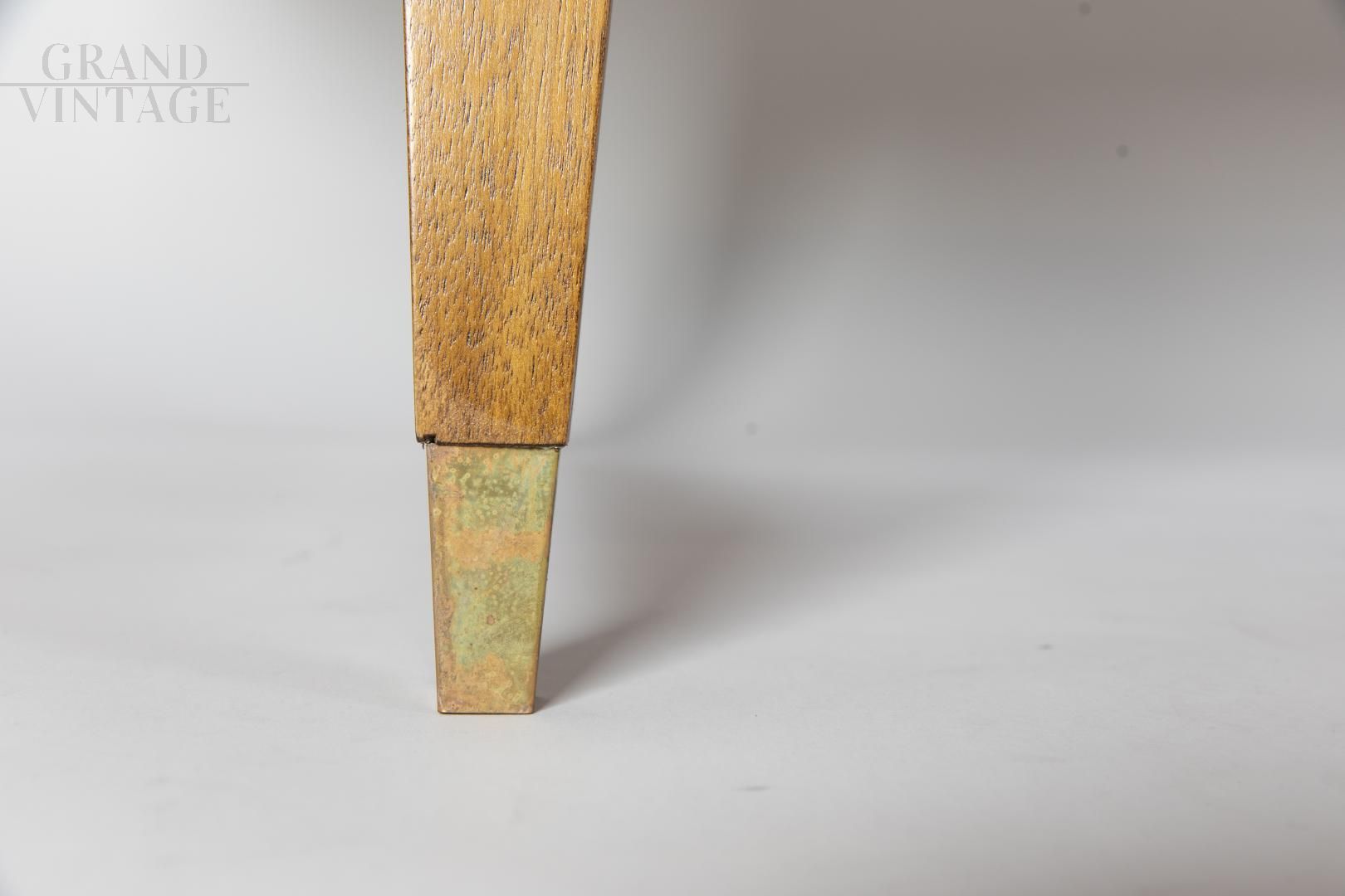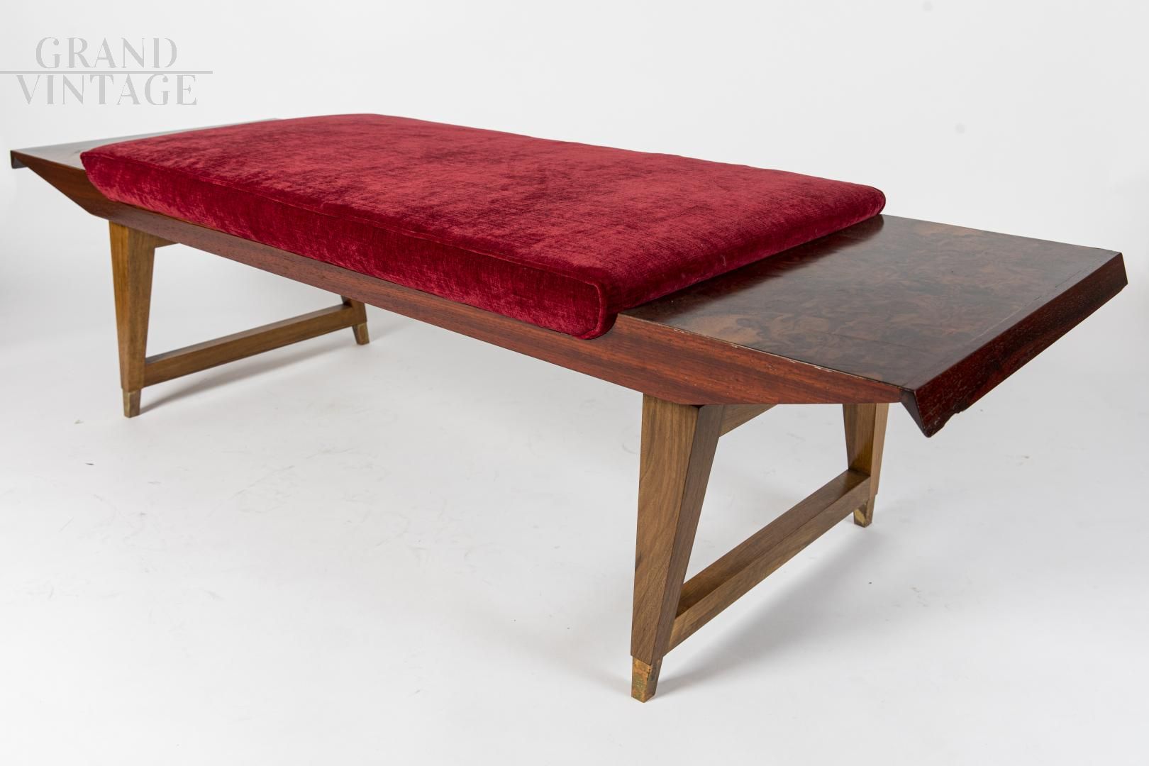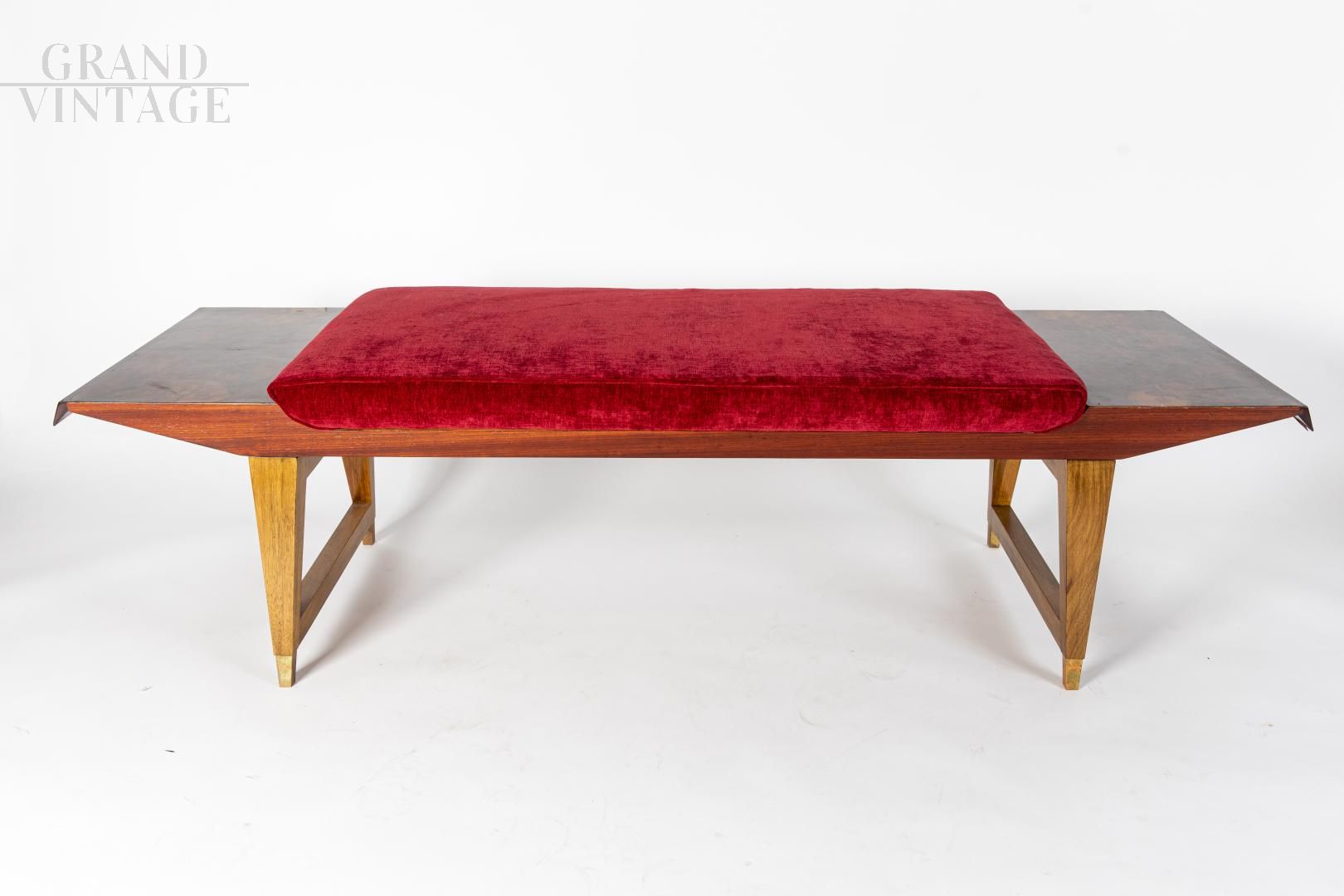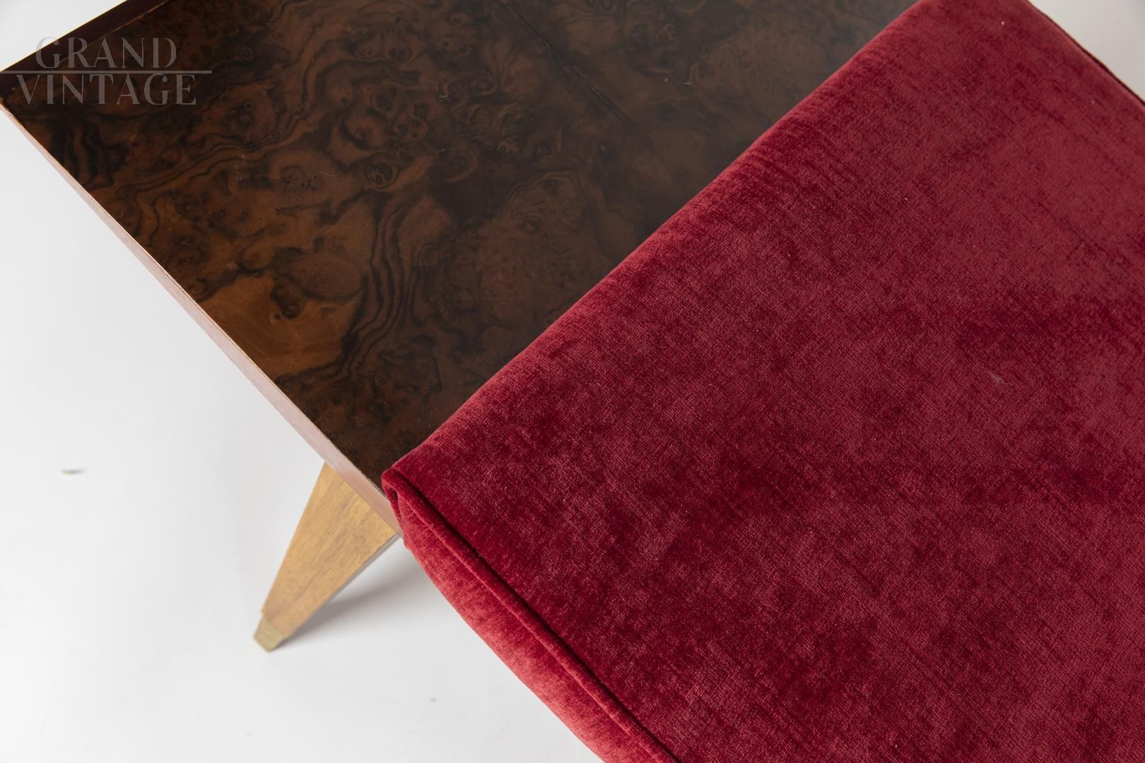 Vintage Italian mid-century briar bench with burgundy velvet upholstery, mahogany and Canaletto black walnut, and with brass feet.