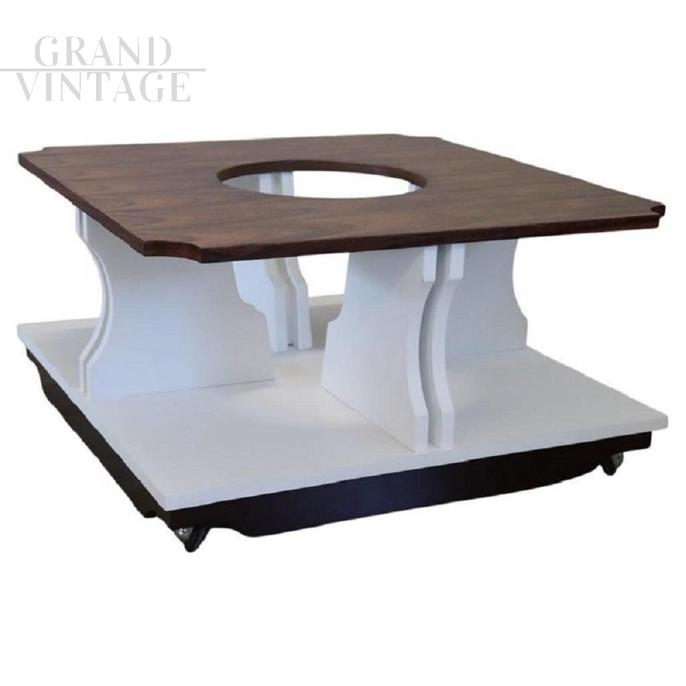 This is a striking and sophisticated mid-20th-century piece of furniture. The combination of walnut veneer and white lacquer creates a captivating aesthetic. Contrasting colors are a key element of its unique design. Its square shape, combining aesthetics and functionality, makes it a versatile addition to any living space. Additional details, such as the recesses in the lower shelf, make it practical and offer additional storage space for magazines or other everyday items. It features convenient wheels for easy movement when hosting guests. In the center of the tabletop, a single open compartment can be used for magazines or, more creatively, for a vase of flowers. Restored, price negotiable.