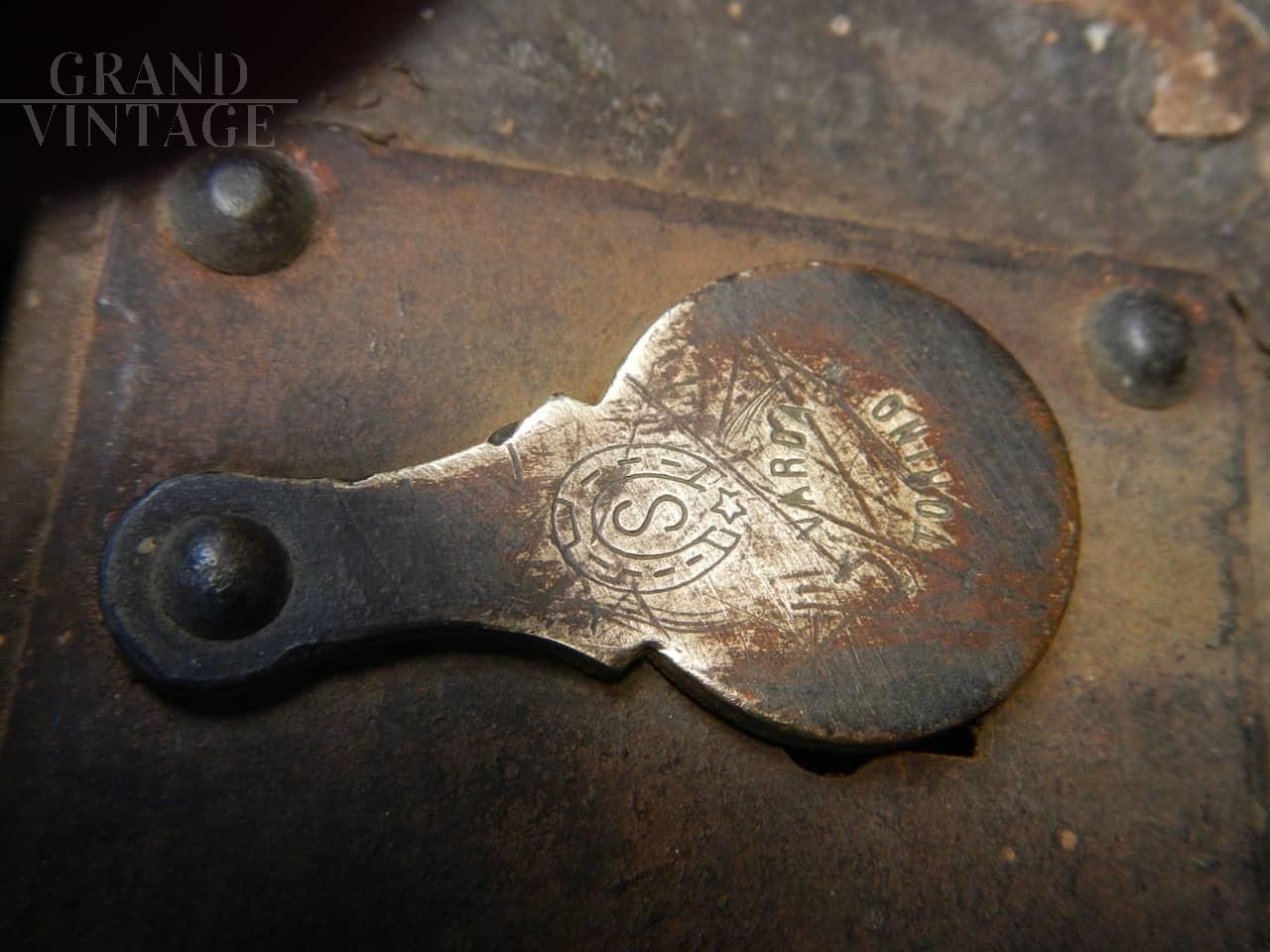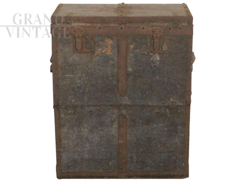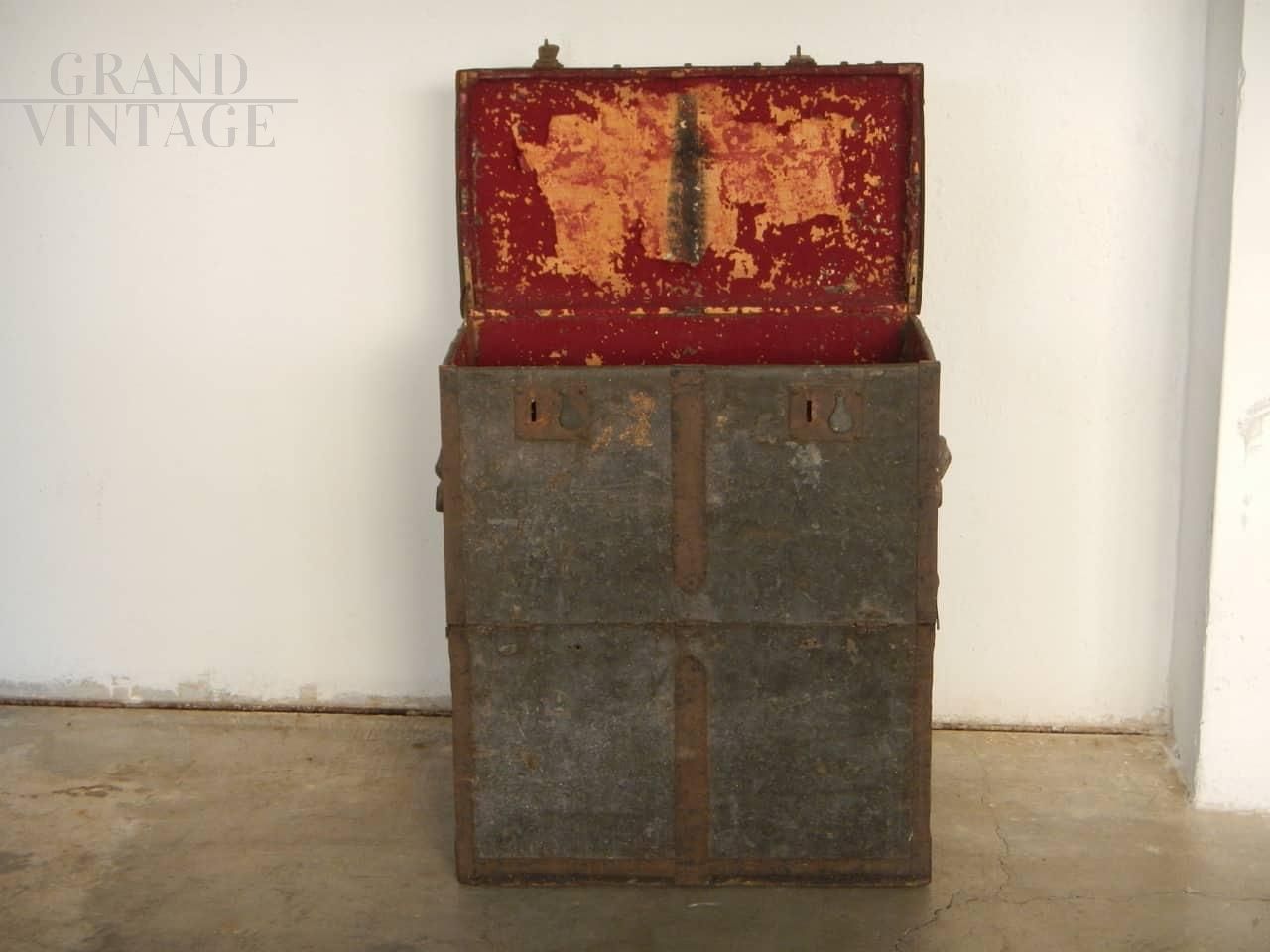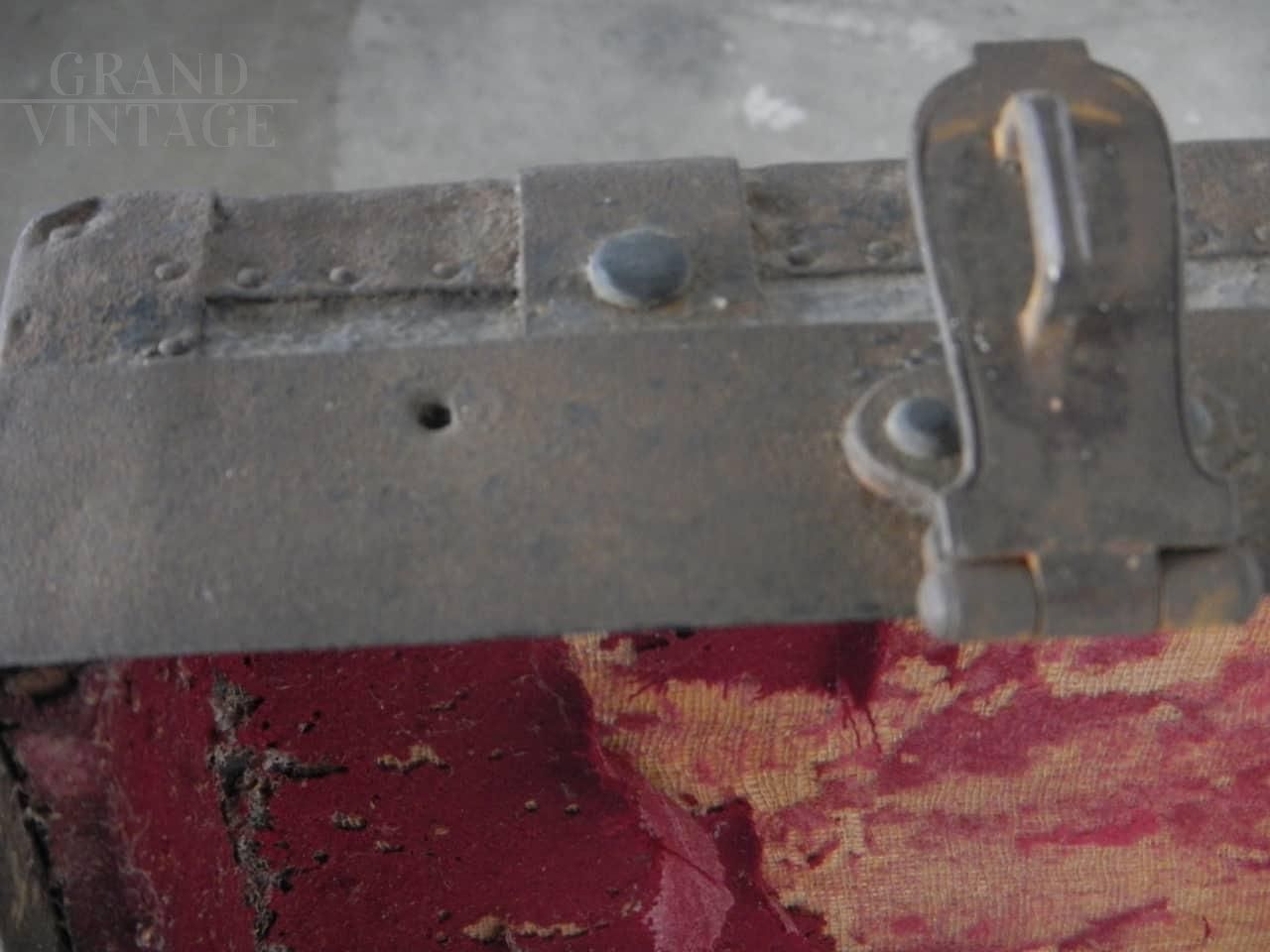 Military crate in wood and studded with sheet metal and brass corners. Covered with red velvet fabric (if desired to be replaced), brass closures with manufacturer's signature.