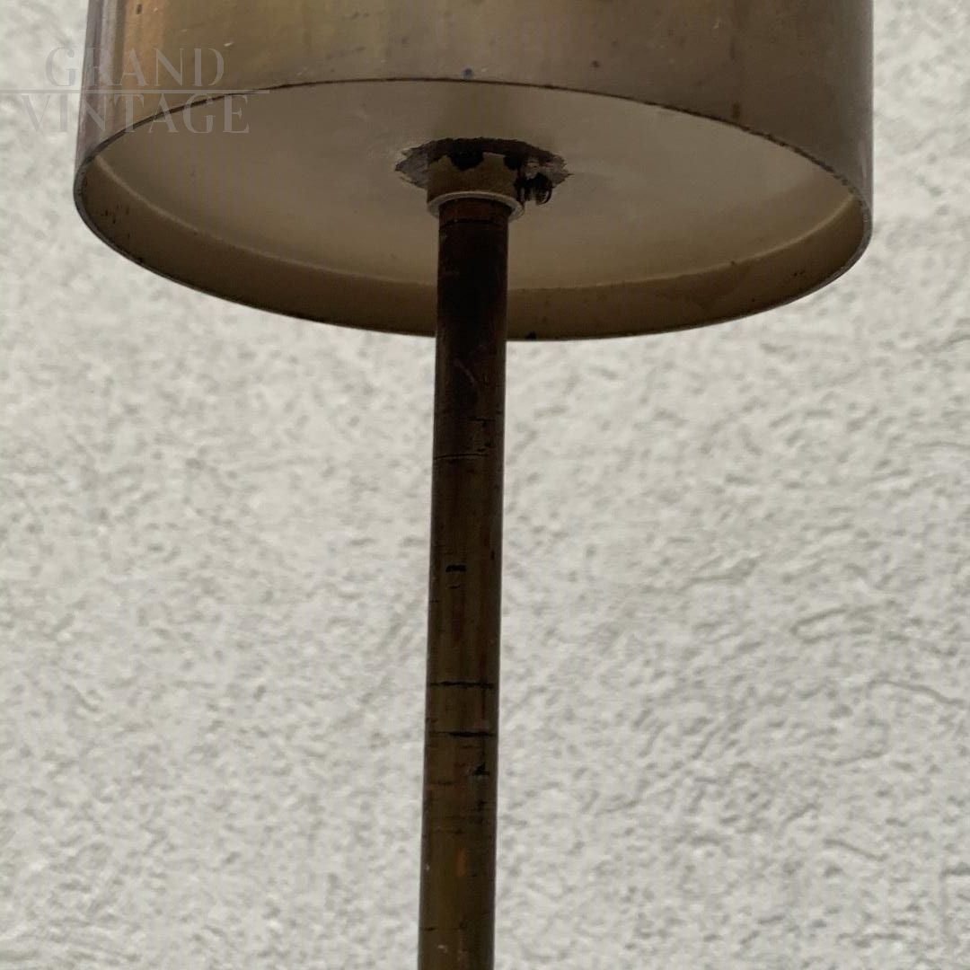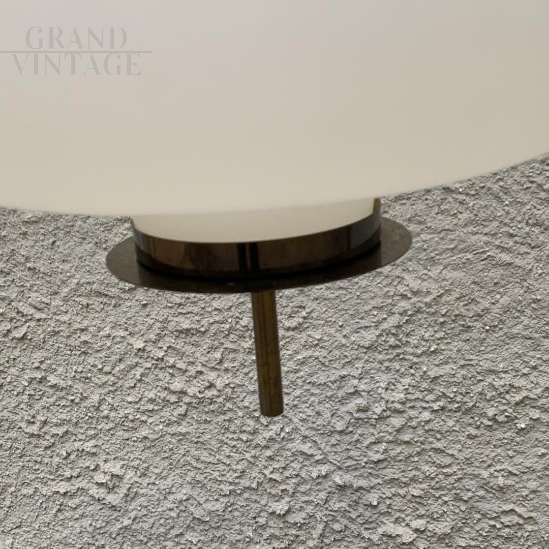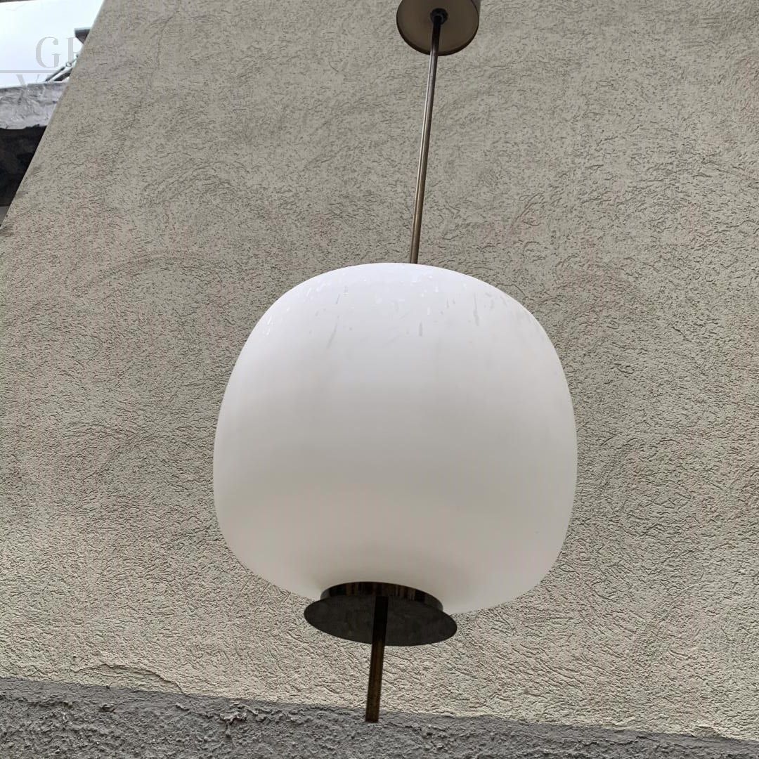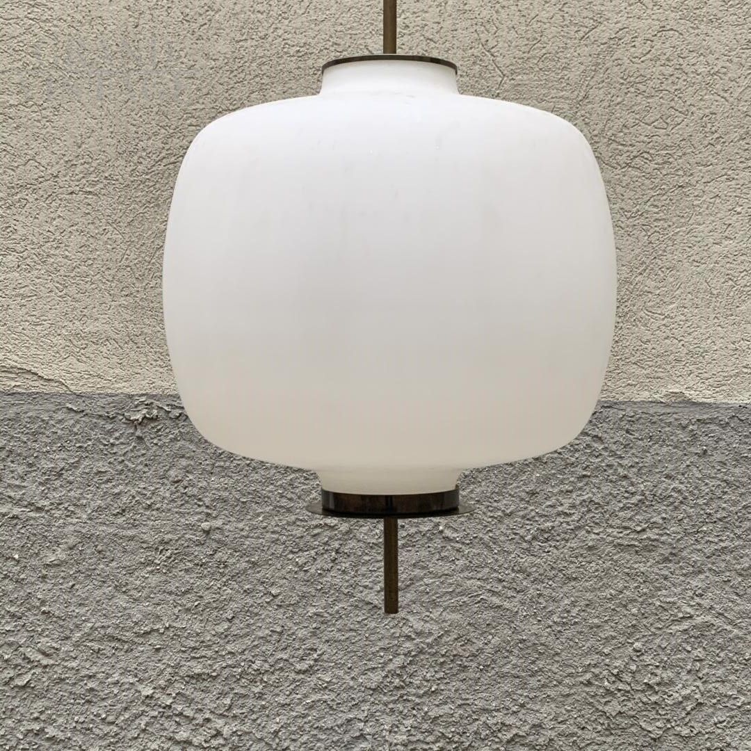 Italian midcentury vintage pendant lamp in opal glass and brass. Attributed to Arredoluce, as a similar model can be found published in the book Arredoluce, p. 319, fig. 232.