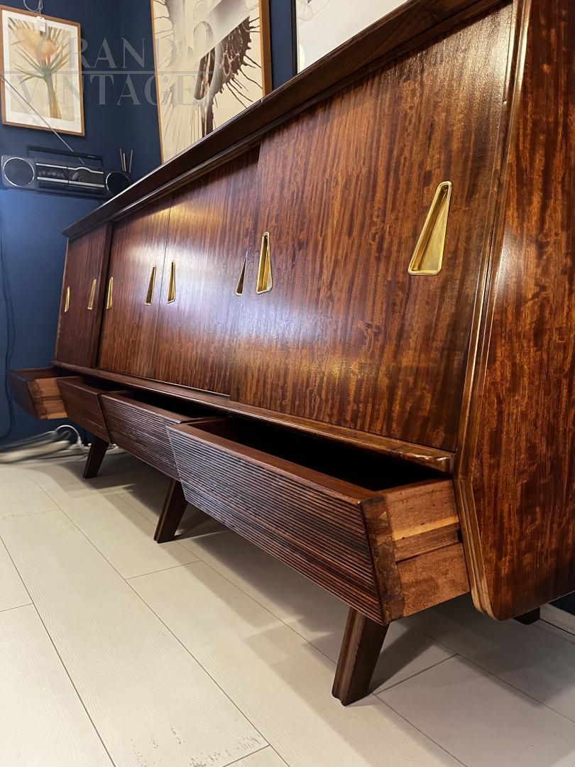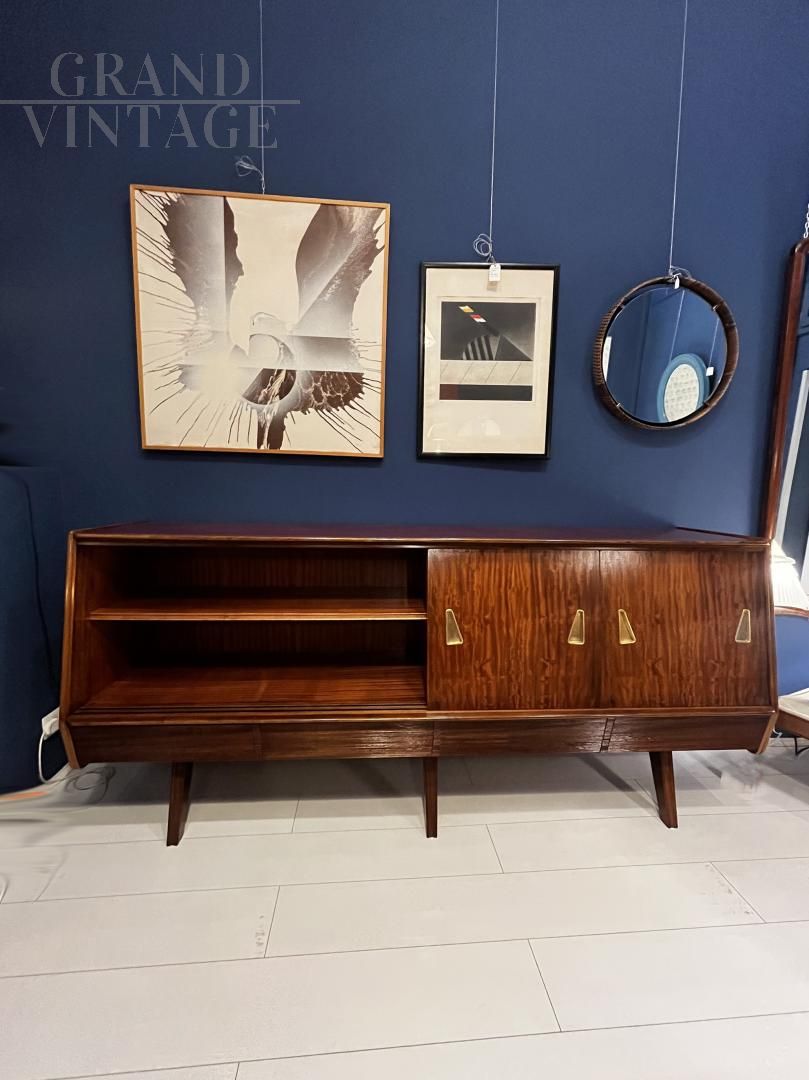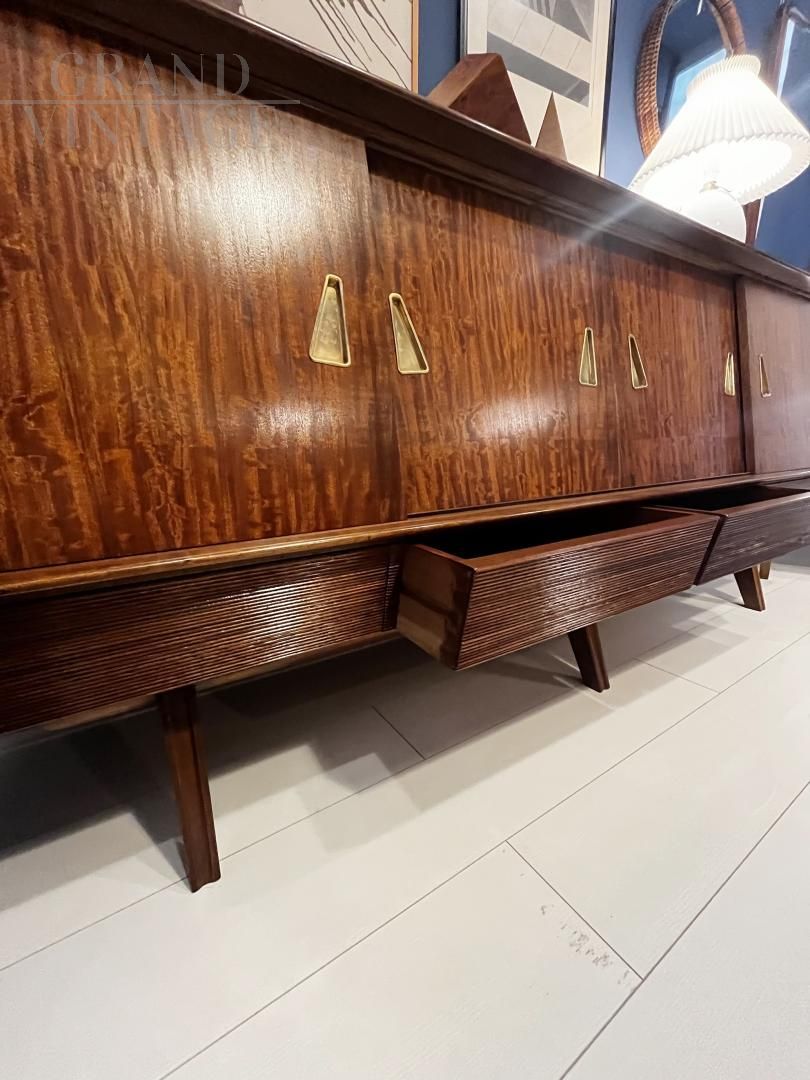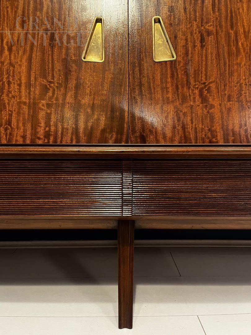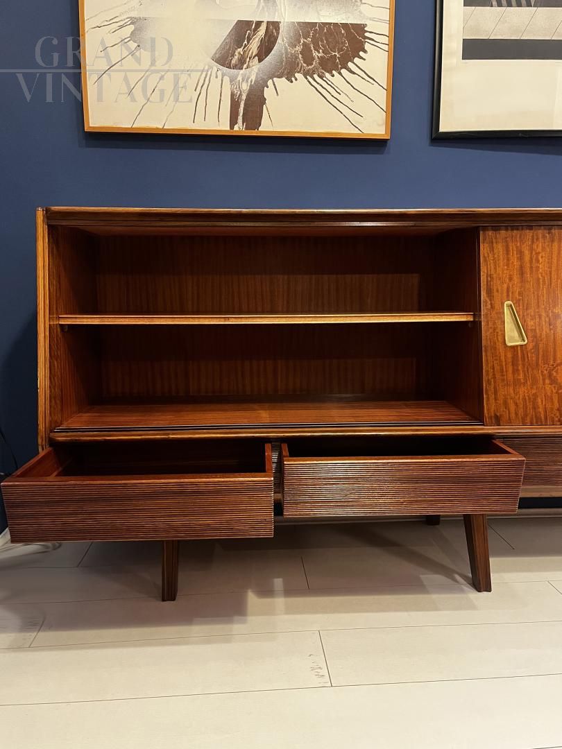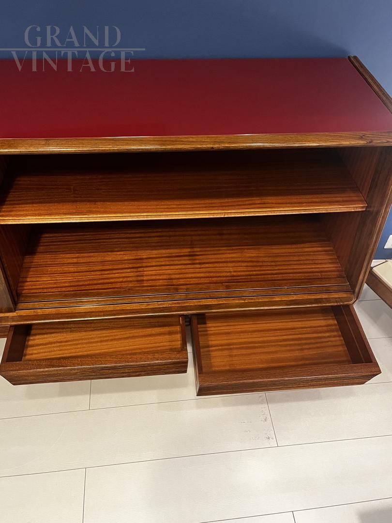 Italian wooden sideboard with brass handles and new burgundy glass. This cabinet is really roomy and also has 4 drawers on the base, with a ribbed wooden front, also very roomy. The cabinet is in impeccable condition, it has been completely restored both in terms of carpentry, the structure of the support legs has become solid again, and in terms of finishing, it has been finished with shellac and the glass is new.
