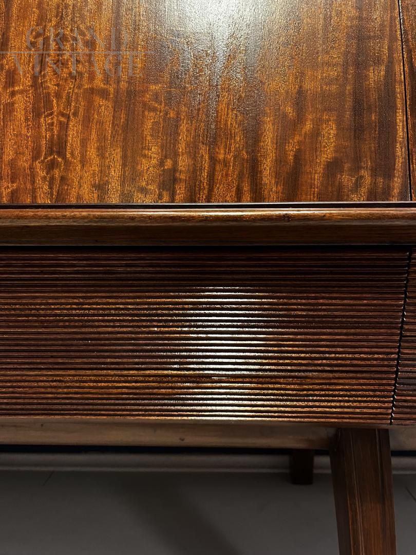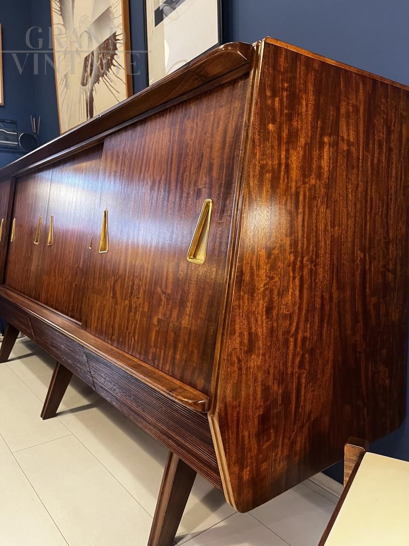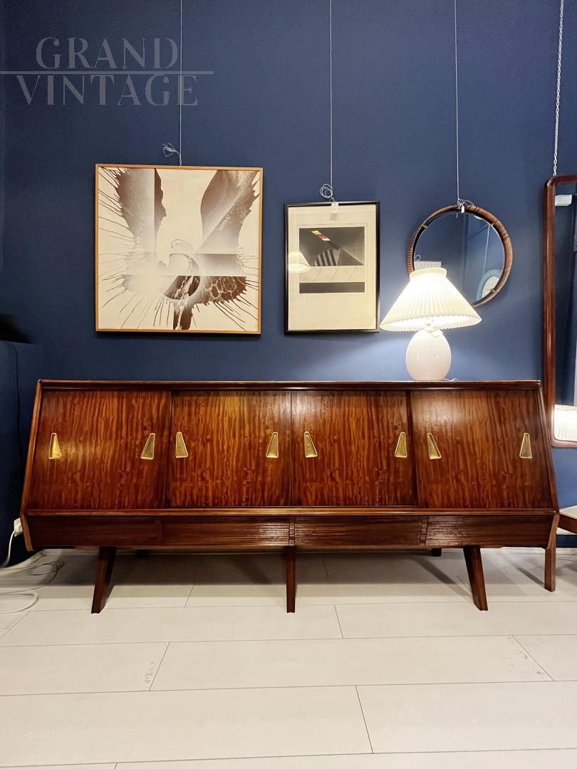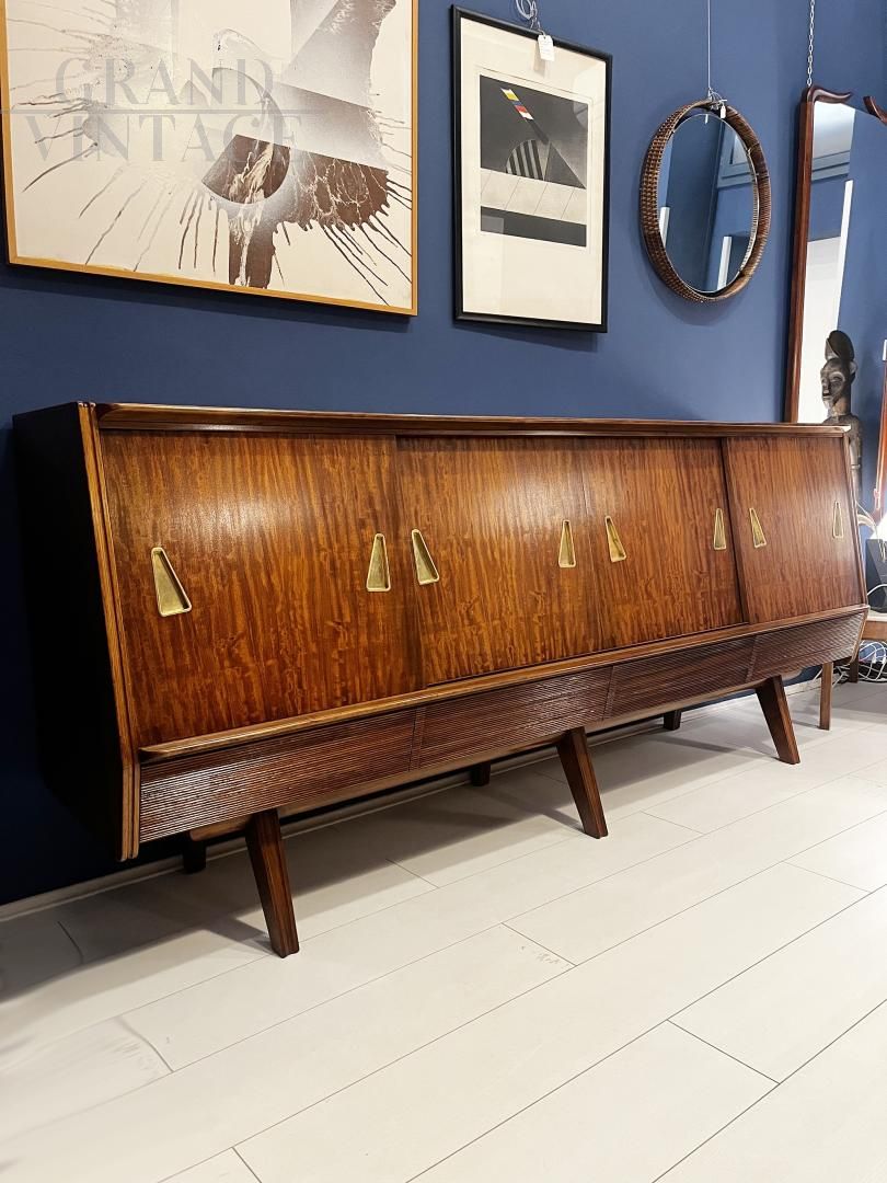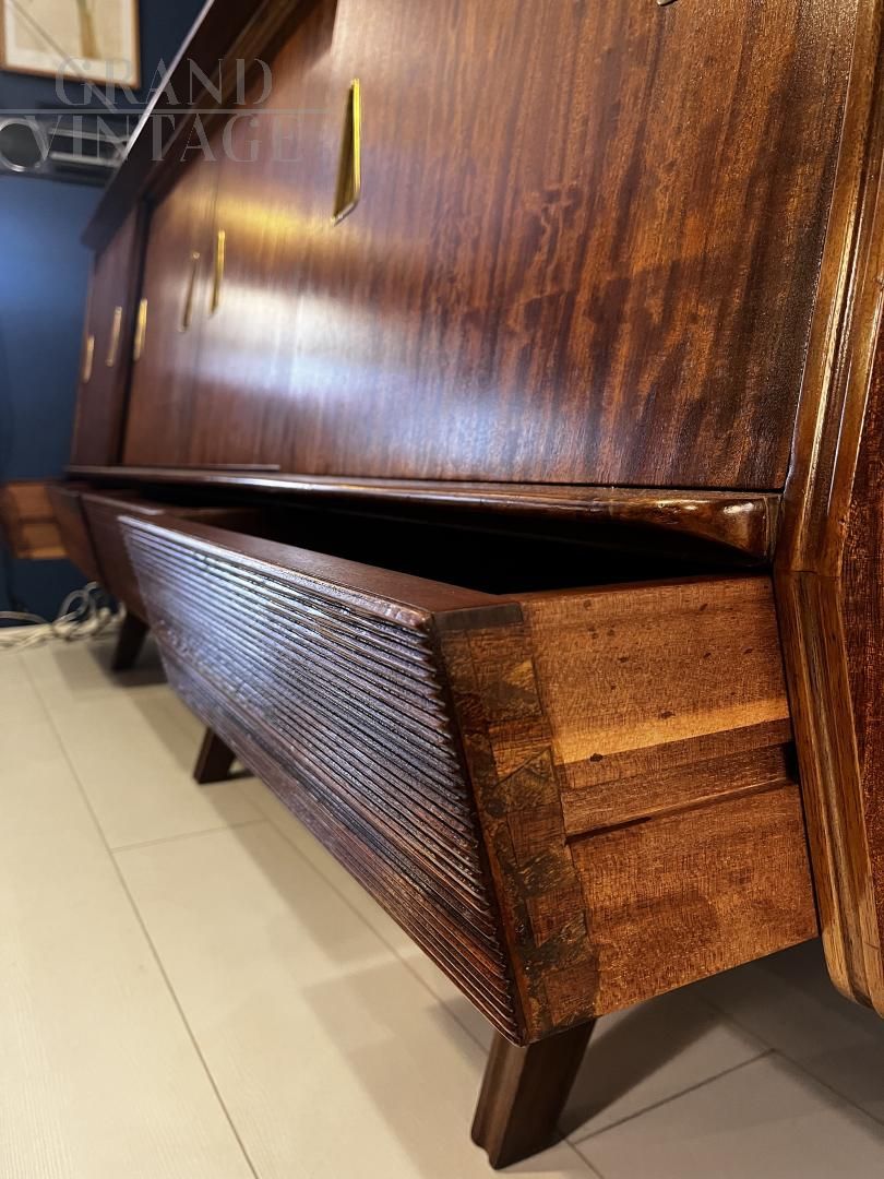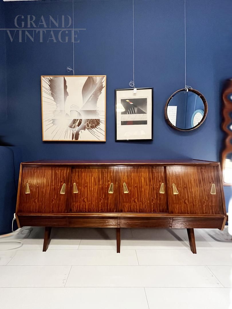 Italian wooden sideboard with brass handles and new burgundy glass. This cabinet is really roomy and also has 4 drawers on the base, with a ribbed wooden front, also very roomy. The cabinet is in impeccable condition, it has been completely restored both in terms of carpentry, the structure of the support legs has become solid again, and in terms of finishing, it has been finished with shellac and the glass is new.