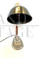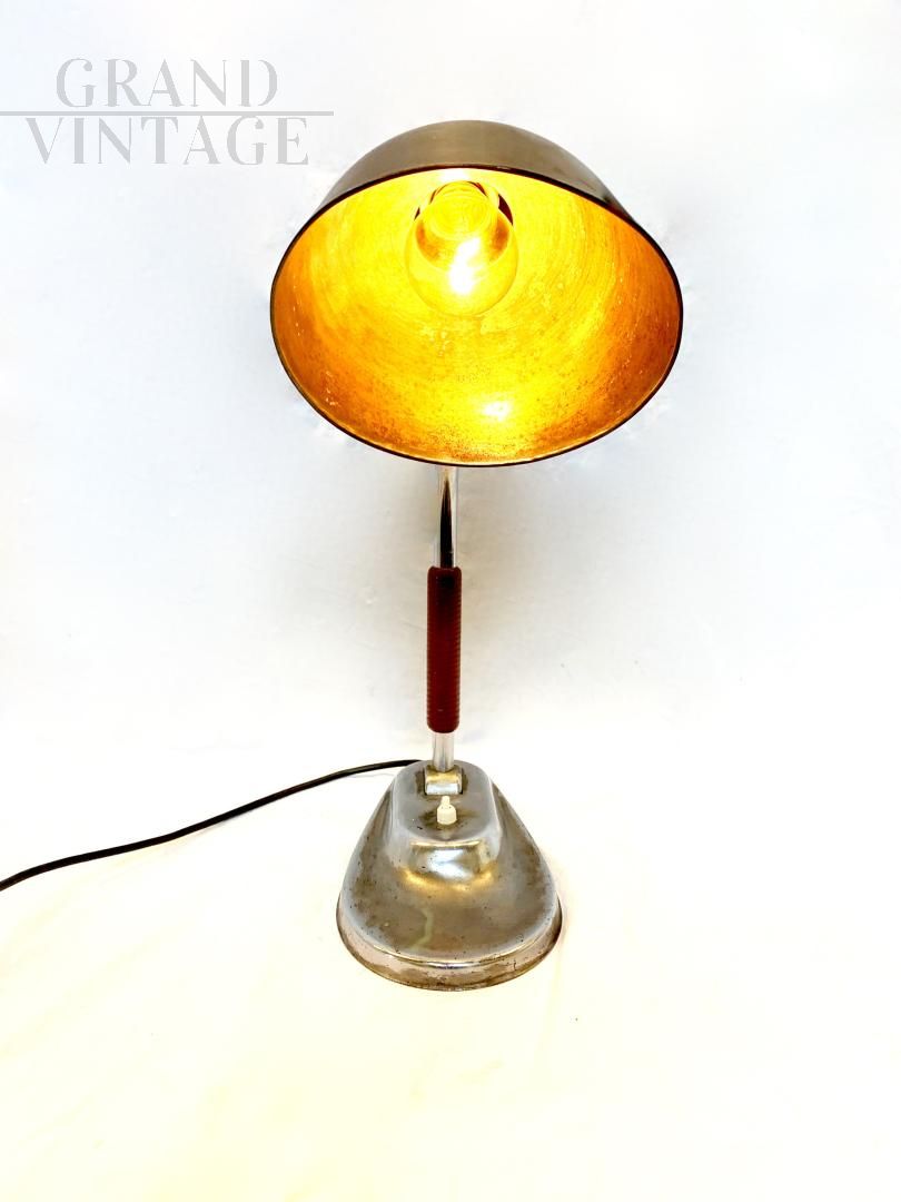 Fantastic and rare Italian vintage adjustable table lamp, with switch at the base. In good condition, it has the classic signs of aging being from around 1940, system redone with E 27 bulb socket, working. The lamp has a metal frame with brown original paint on the shade, on the stem it has a beautiful bakelite decoration.