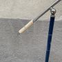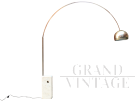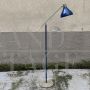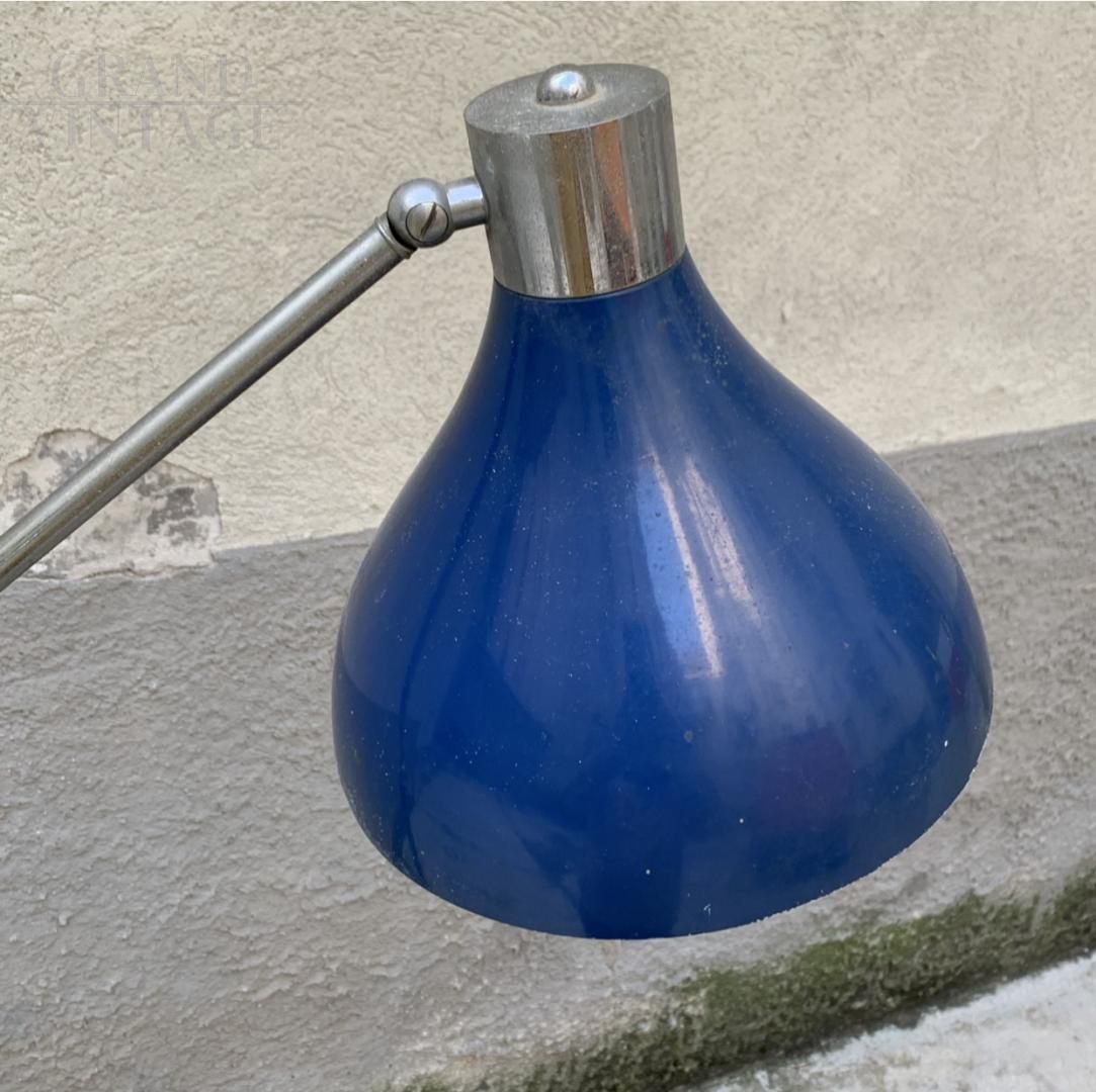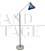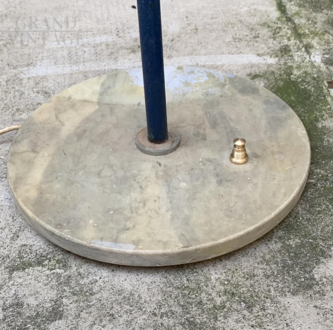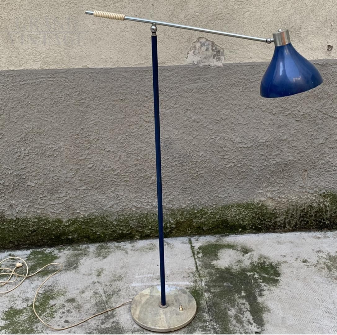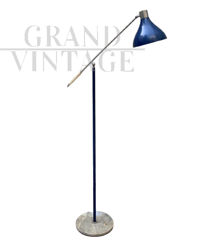 Adjustable floor lamp with blue and chromed lacquered metal structure, Carrara marble base and blue lacquered aluminum shade. Brass switch on the marble plate, it been replaced with a new one. all the rest is original and the marble base has a heavy layer of patina accumulated over time
