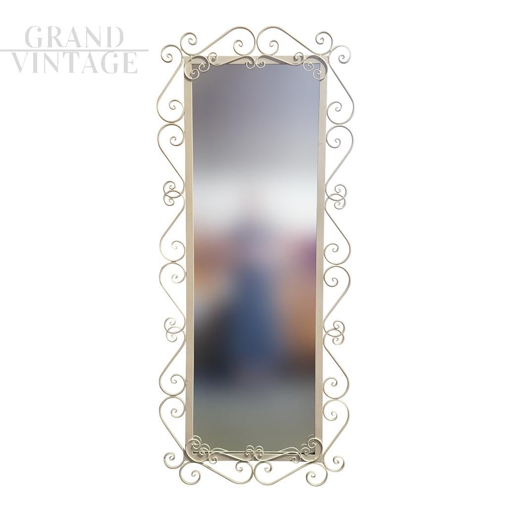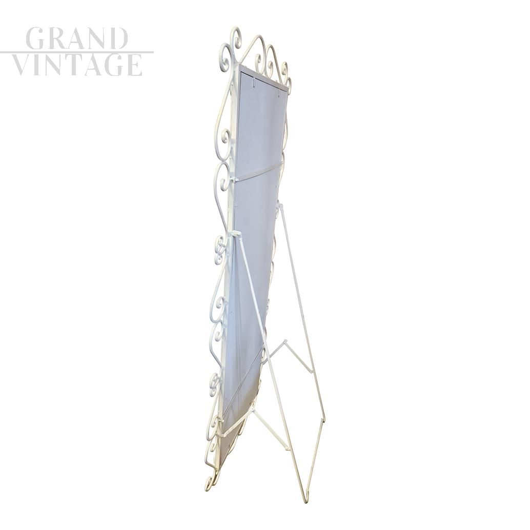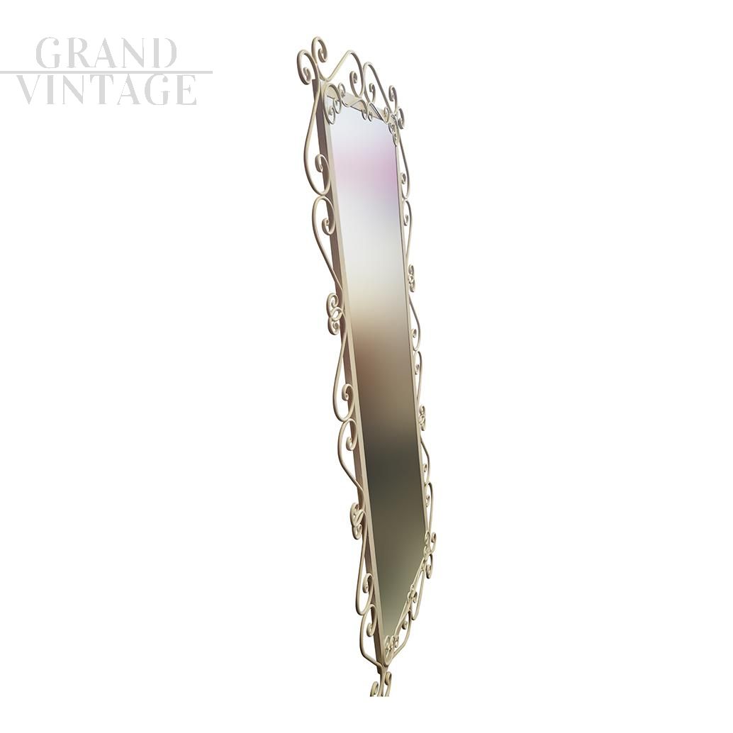 Rectangular floor mirror with metal frame decorated with curls and painted in ivory, complete with support to adjust the tilt of the mirror.