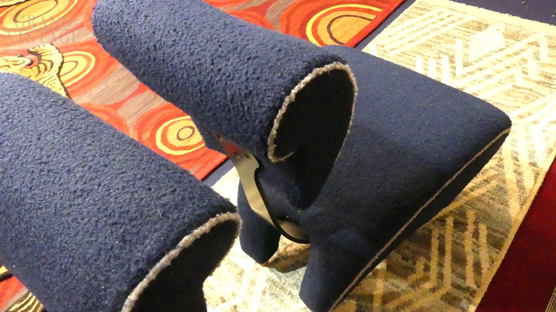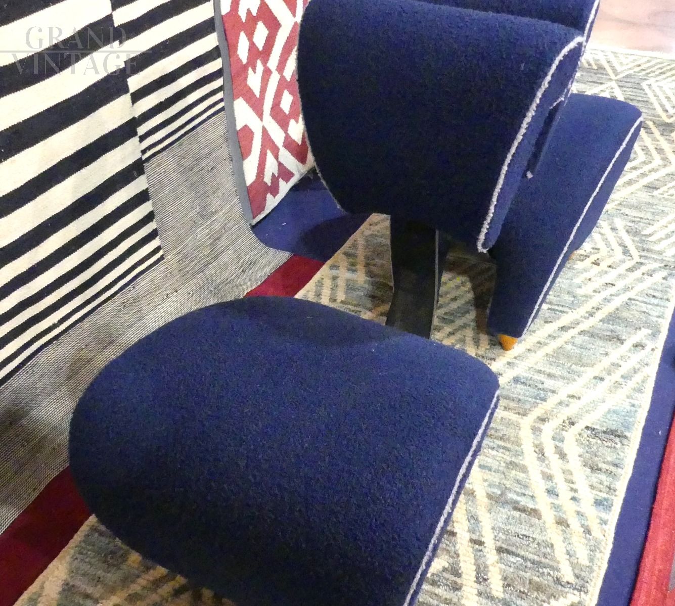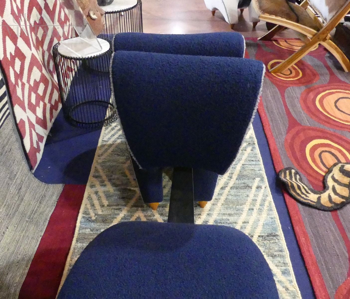 American armchairs designed by Jordan Mozer covered in blue bouclé wool with white profiles, 1970s.