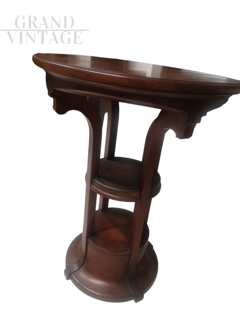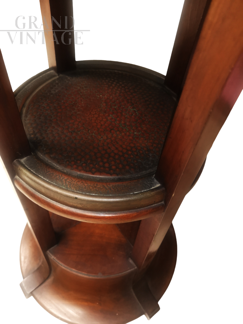 Beautiful round Austrian Jugendstil side table from the 1920s - 1930s, made of solid walnut wood with two tops, of which the lower top is completely covered with a hammered copper plate. The 4 stylized legs end upwards with beautiful curls. Elegant and with great charm.