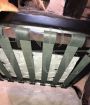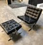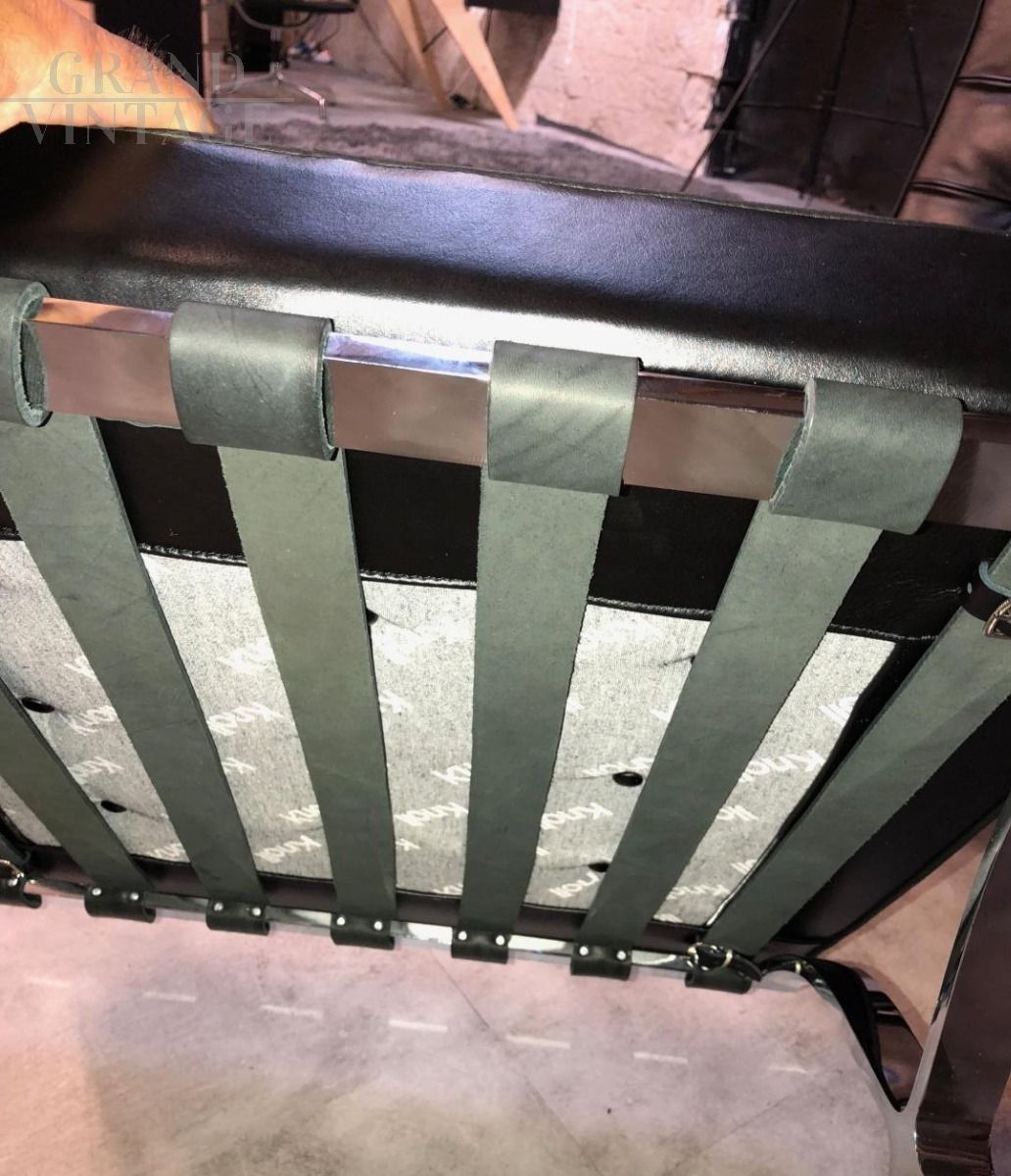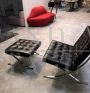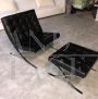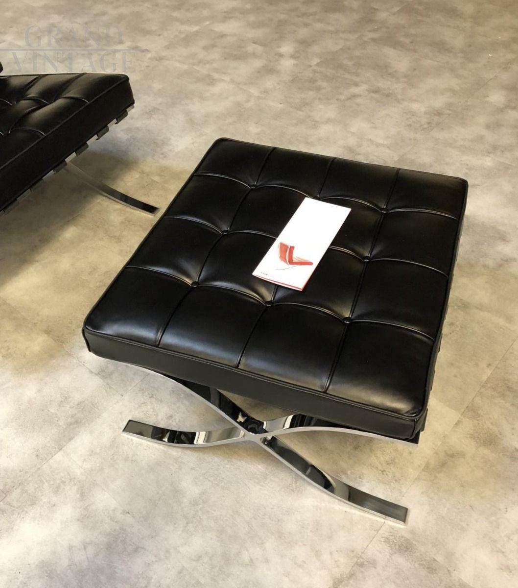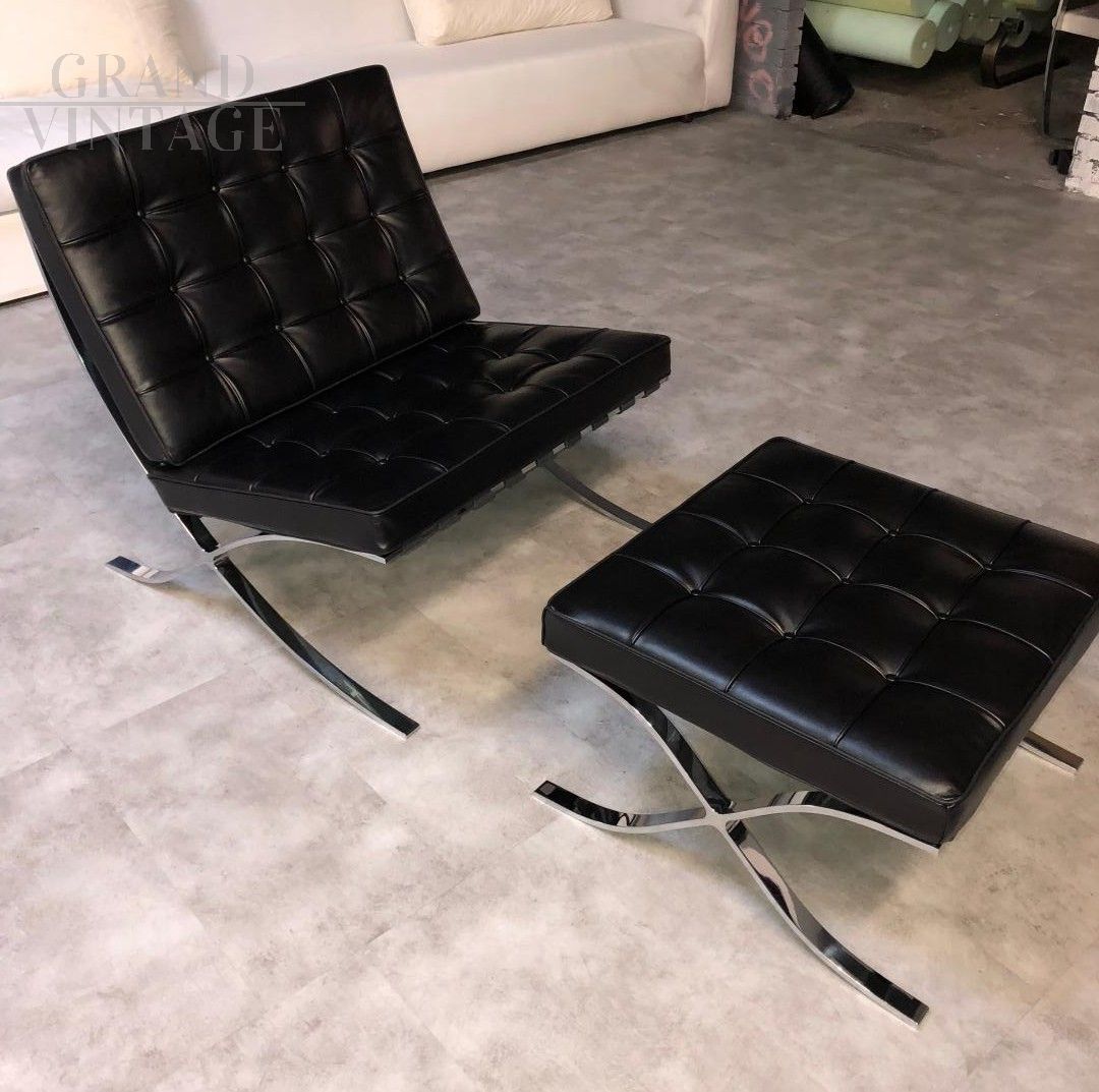 Magnificent original Barcelona armchair complete with ottoman, designed by Mies Van Der Rohe for Knoll and made of black leather, the brand is visible both on the structure and under the seat. Kept in excellent condition.