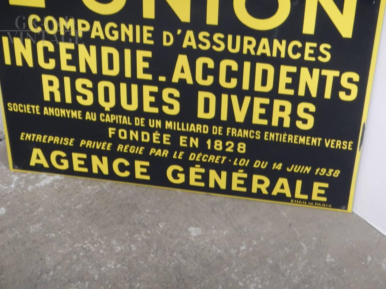 Vintage French insurance agency advertising sign in curved black enameled metal with yellow "L'Union Compagnie d'Assurances" lettering, produced in the 1930s/1940s. There is no enameler's mark. The sign includes holes for hanging. Two pieces available; the price refers to each. One of the two signs shows more signs of age than the other.