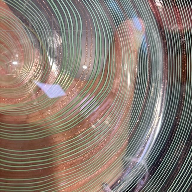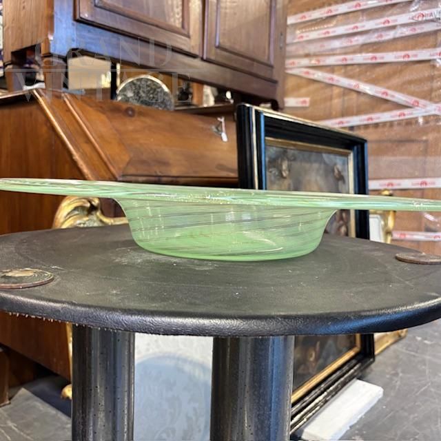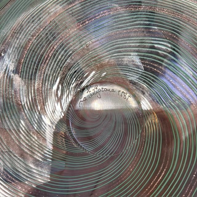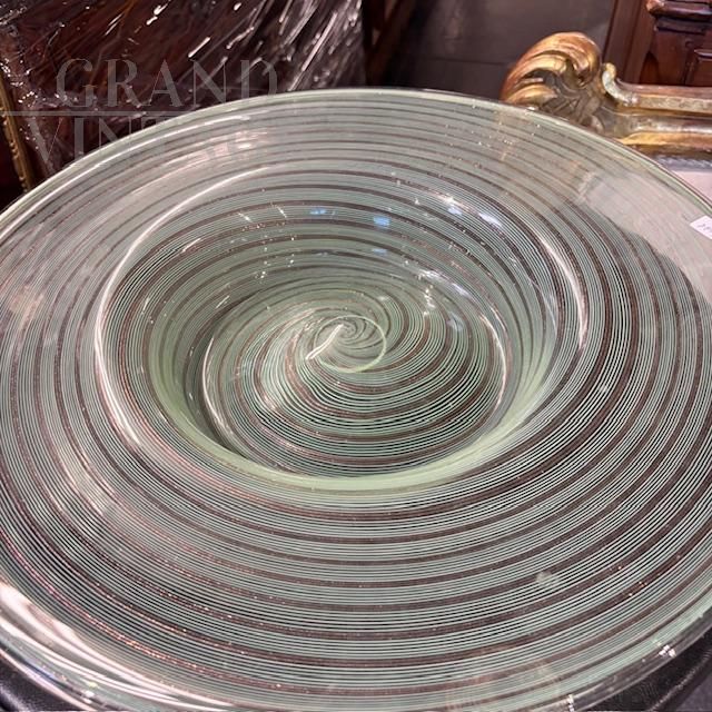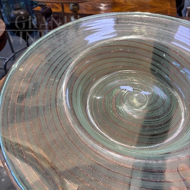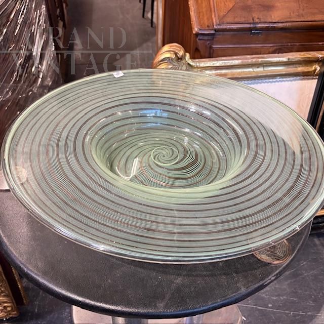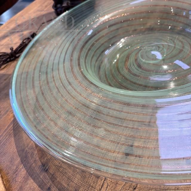 Large Murano glass centerpiece plate signed La Filigrana and dated 1987, handcrafted using the spiral technique and gold and green filigree. Diameter: 52 cm. Excellent condition.