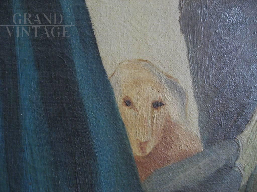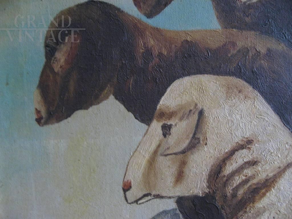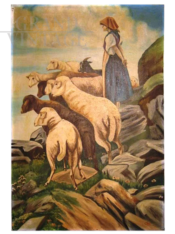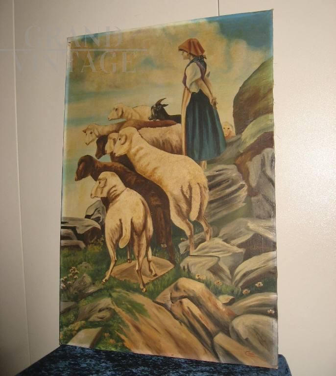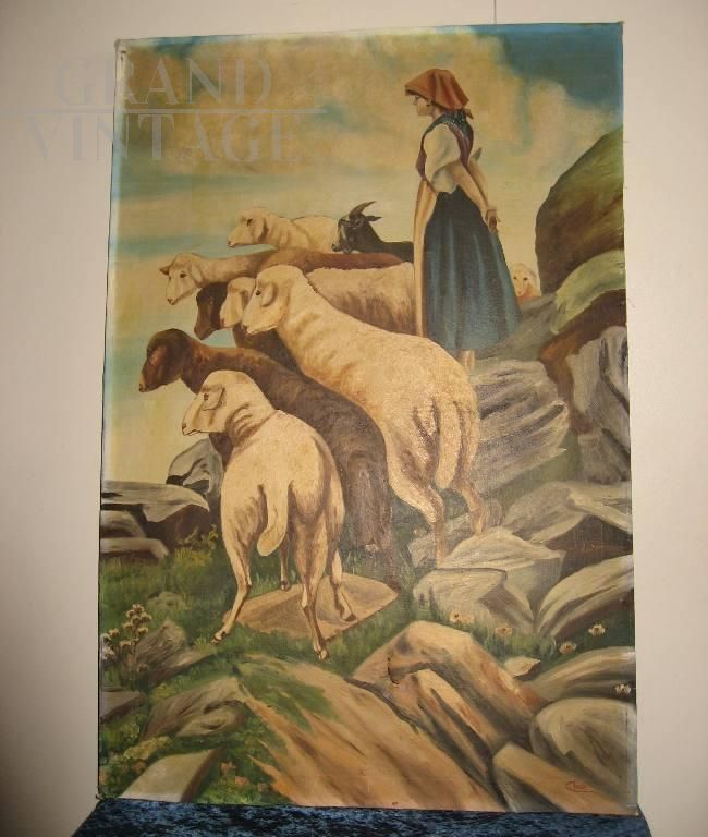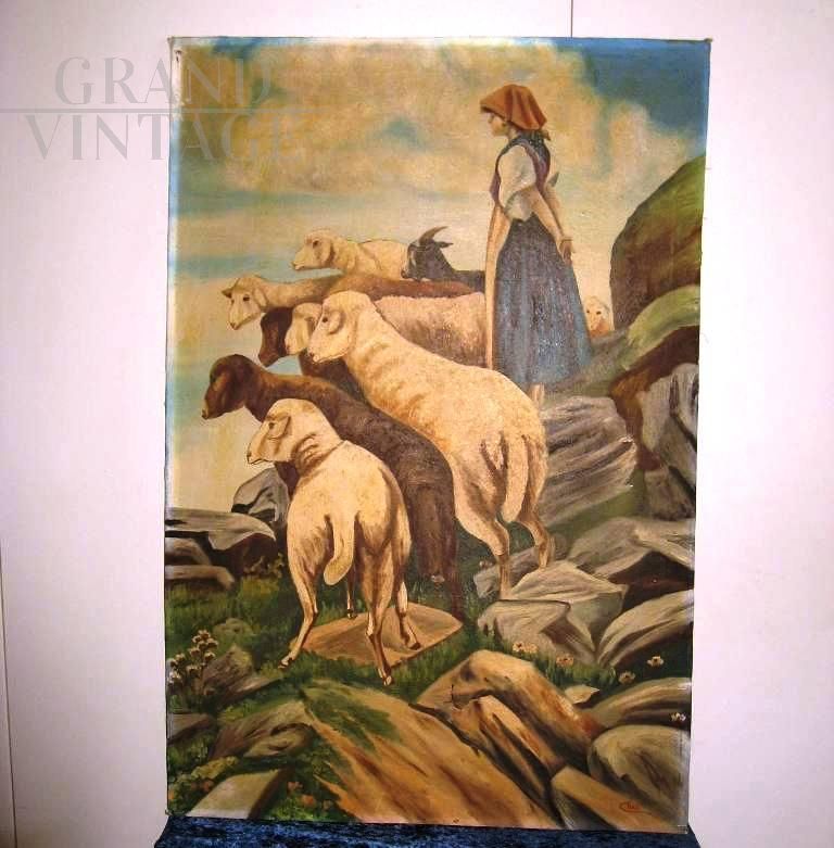The Shepherdess with flock, painting signed Clive oil on canvas of the 20th century without frame.