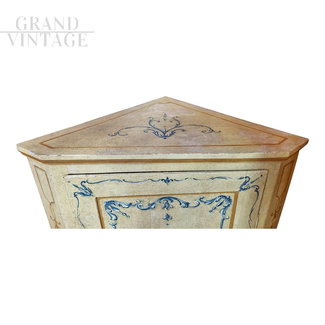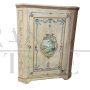 Antique Tyrolean style sideboard, beige lacquered with hand-painted decorarions and landscape medallion, equipped with a door and two internal wooden shelves.