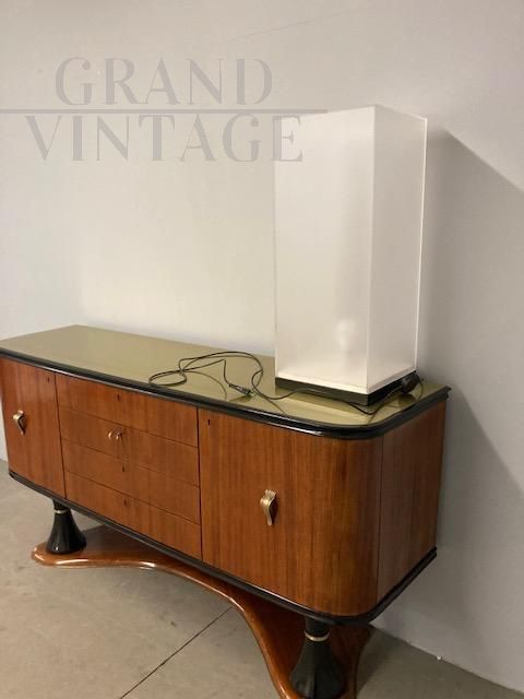 Minimal design cube lamp with plexiglass structure and wooden base. Very nice effect, modern antiques from the 70s, usable both fon the floor and on top of a piece of furniture. In good working order.