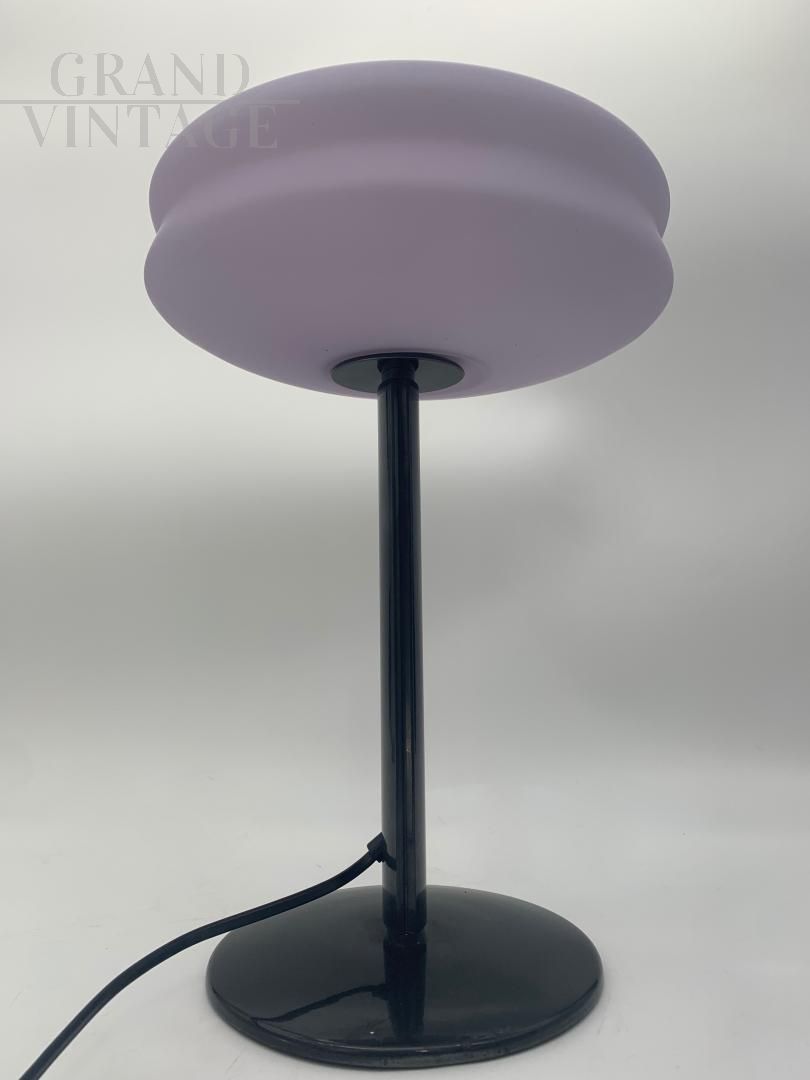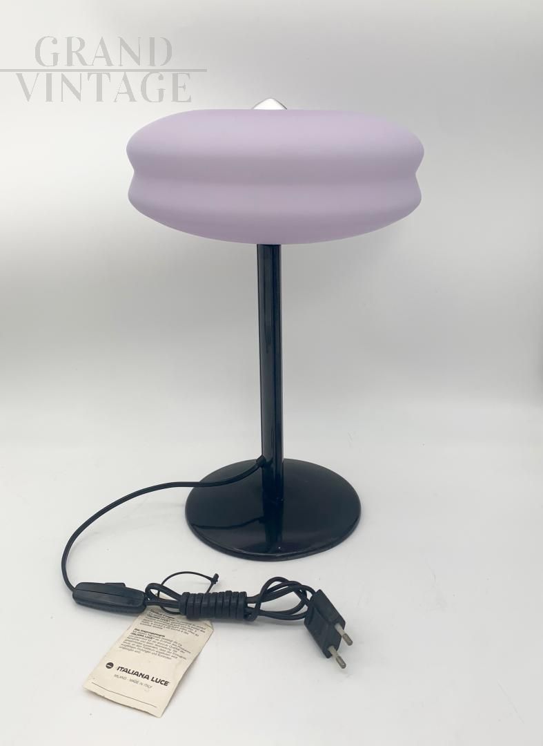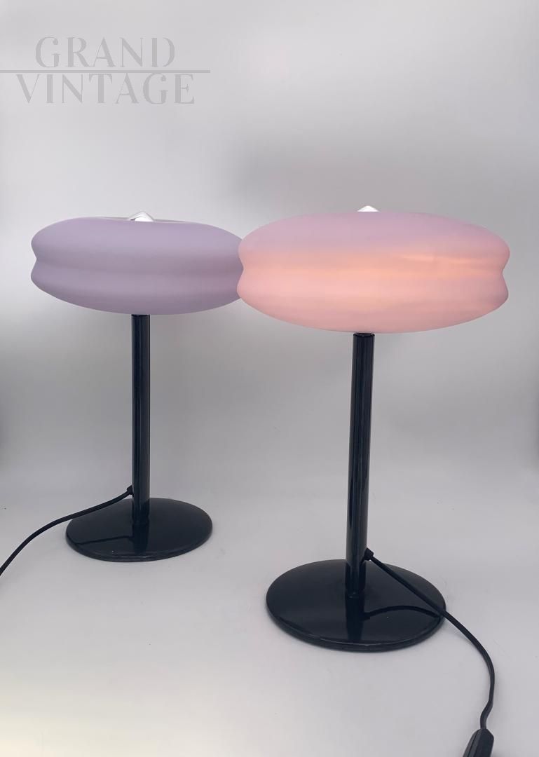 Fantastic and rare pair of lilac Murano glass Fenice table lamps by Stefano Marcato for Italiana Luce, 1980s. The lamps are in good condition, glasses not cracked, with few signs of aging as it is a stock fund, therefore they have never been used. Original and working electrical system with E14 bulb attachment, the use of LED bulbs is recommended. The color of the glass is lilac, when lit they are pink, and are encased in white on the inside. Marked on the base, the glasses will be disassembled for transport and packed with care. This Fenice lamps are suitable as desk lamps or bedside table lamps.