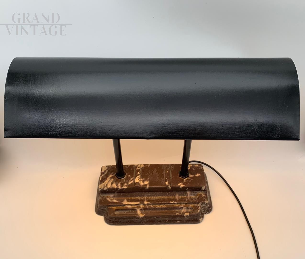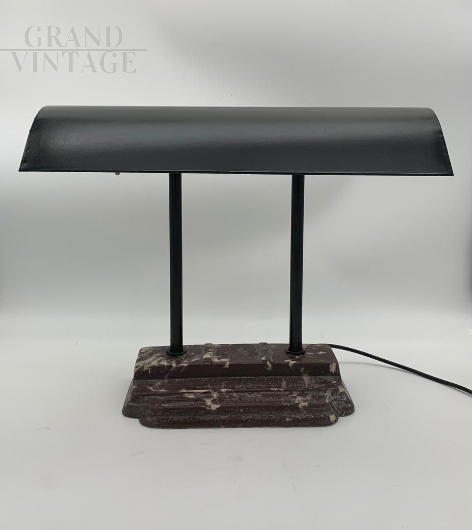 Fantastic and rare table lamp from the late 1930s, perfect as a studio lamp, with black lacquered iron structure and base in real metal alloy with marble effect. The lamp is in excellent condition, has few natural signs of aging, it works, the electrical system has been redone while keeping the neon.