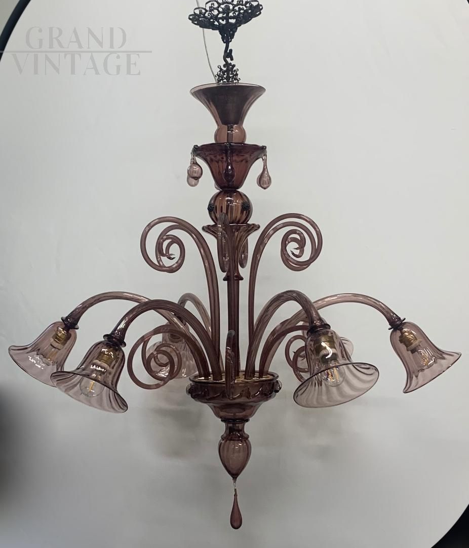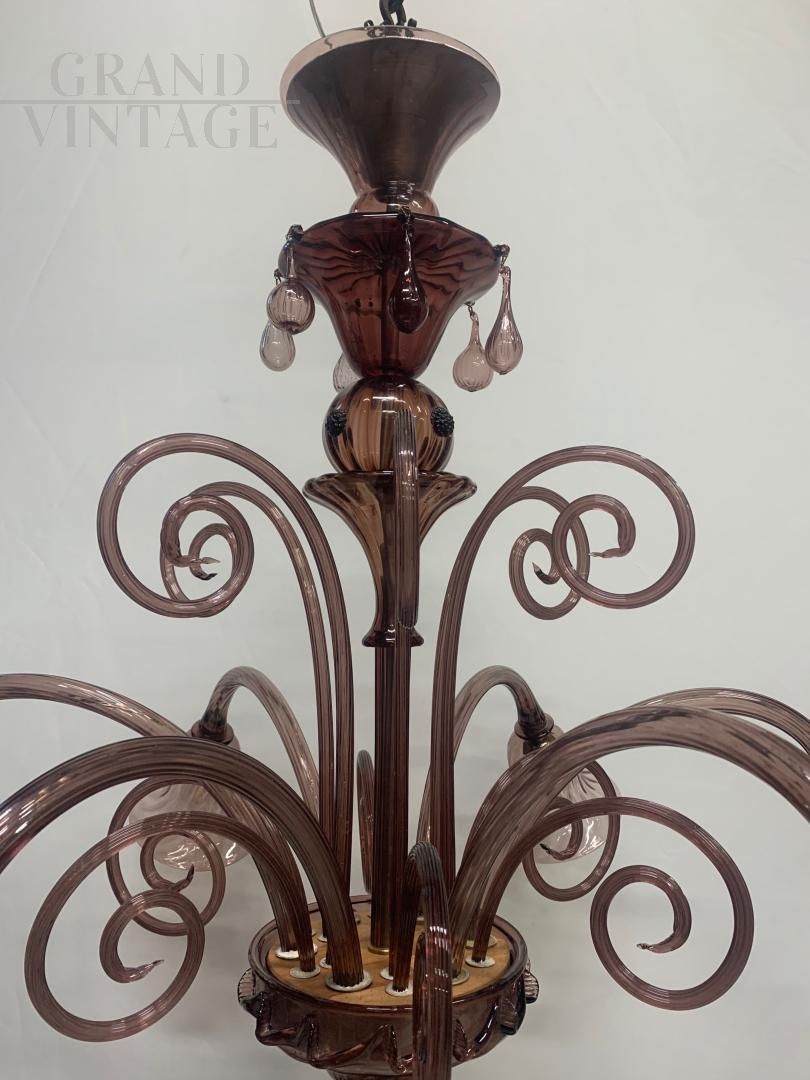 Grande lampadario attribuito alla ditta A.V.E.M. in vetro di Murano lavorato a mano con un bellissimo colore viola ametista, realizzato negli anni '20 - '30, molto scenografico e raro da trovare in queste condizioni, con vetri non crepati e con lievi naturali segni del tempo. Il lampadario è composto da 6 punti luce con attacchi per lampadine di tipo E27, l'impianto elettrico è stato rifatto a nuovo ed è adatto alle lampadine al Led. Il lampadario verrà smontato per favorirne un trasporto in sicurezza. Ottimo pezzo per illuminare diverse stanze, non abbaglia se vengono montate lampadine bianco latte.
