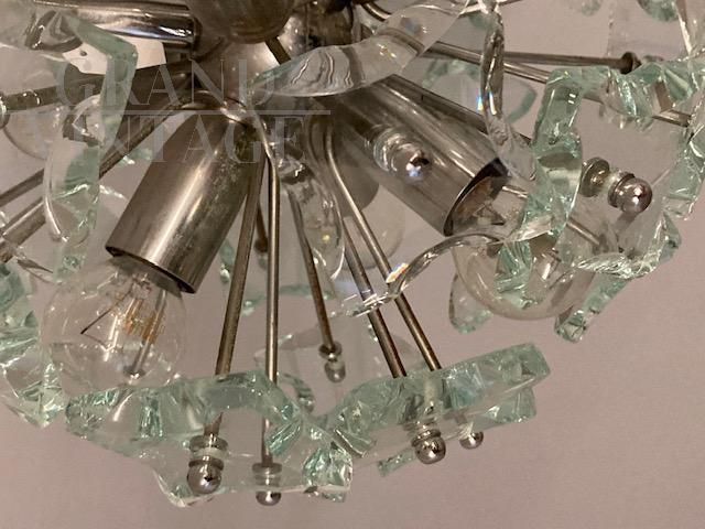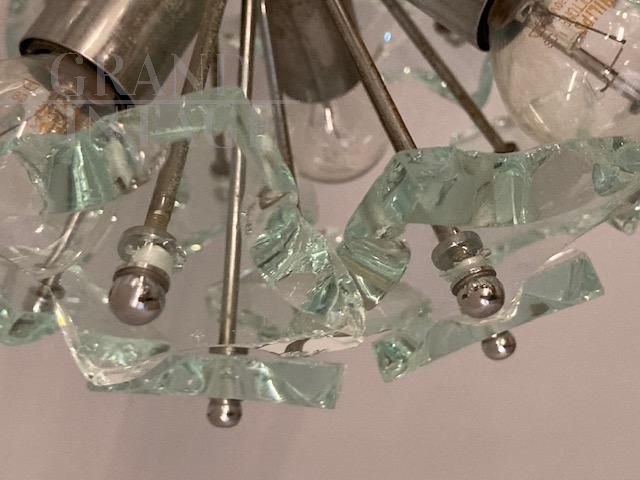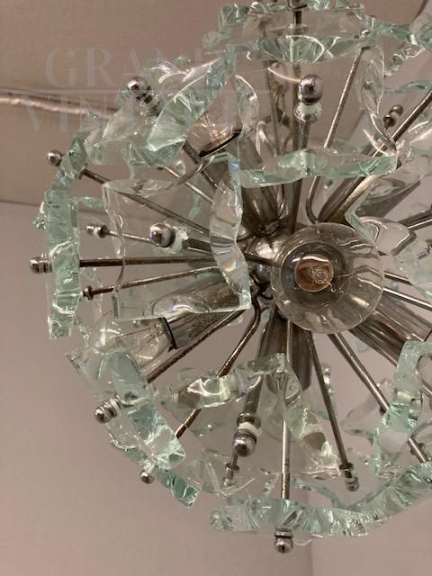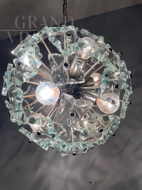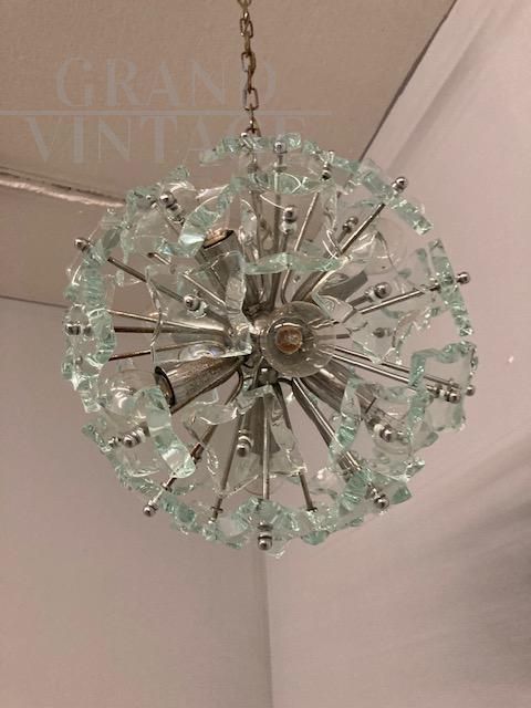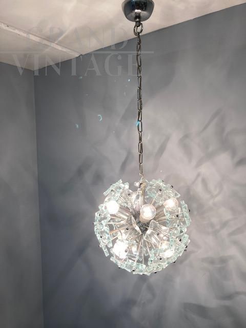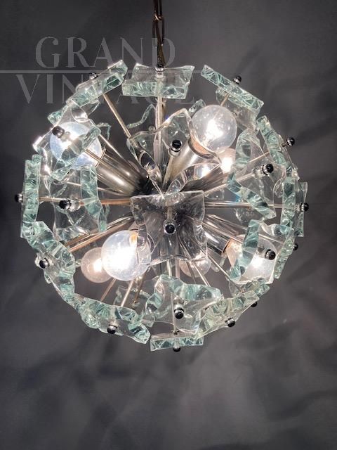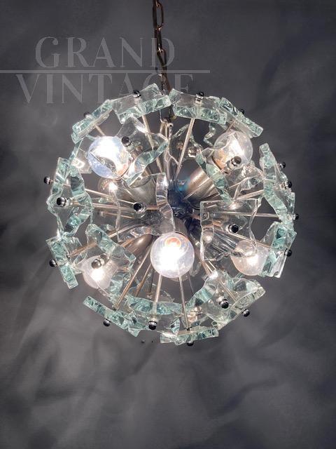 Sputnik chandelier by Fontana Arte from 1968, with frosted transparent green glass flakes and chromed metal structure. Eight light points. Item of unique design, revised and ready to hang. Sphere diameter 35cm, height adjustable by removing the rings.
