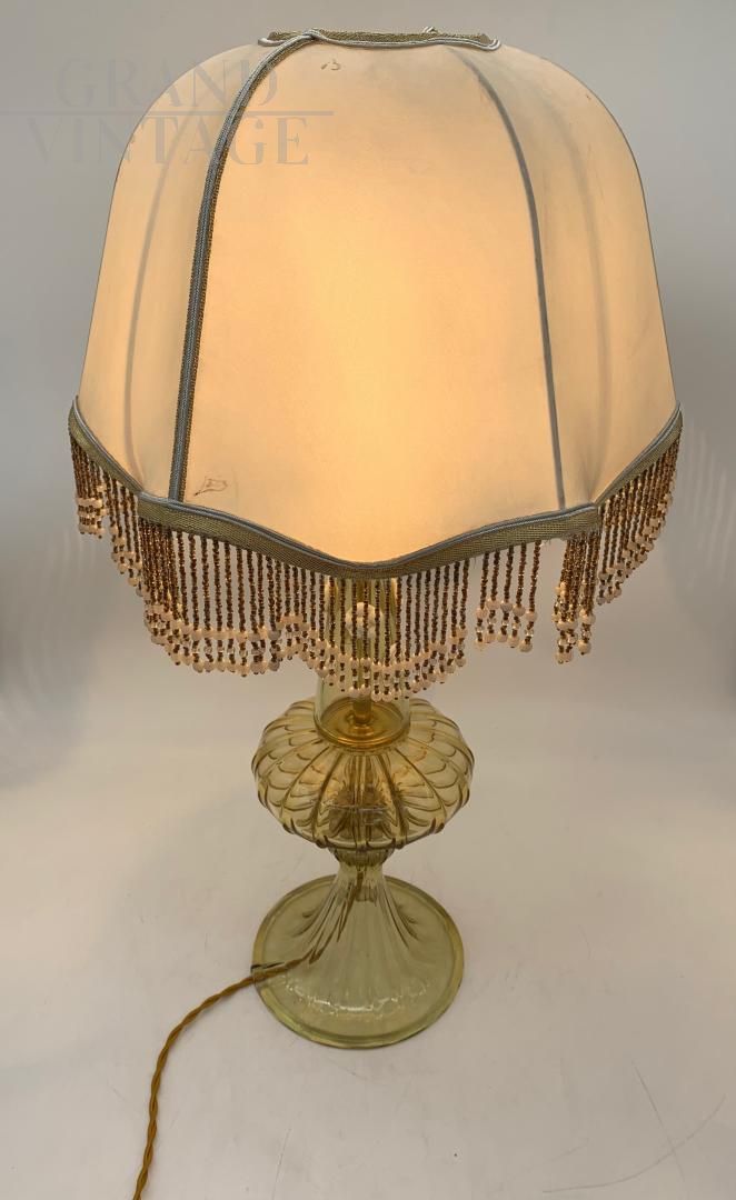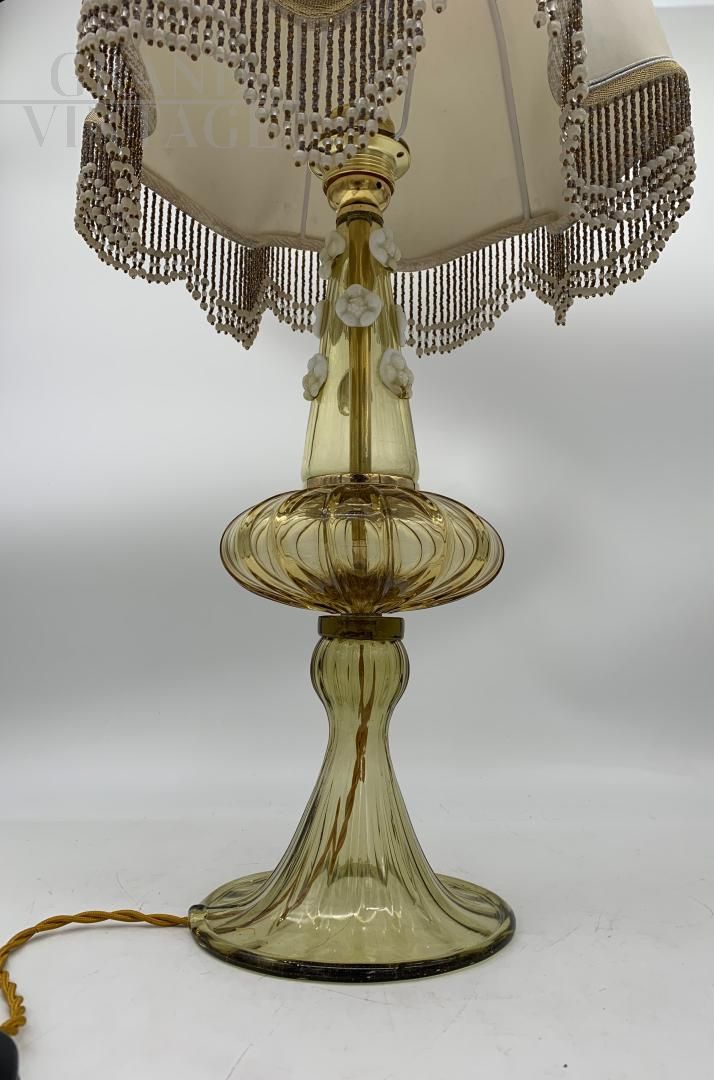 Fantastic and rare table lamp abat-jour attributable to A.V.E.M. with beautiful stem entirely in amber-coloured Murano glass decorated with white flowers and fabric lampshade with beaded fringes in perfect Art Deco style, 1940s Italy. In good general condition, it has the classic signs of age, the electrical system has been redone and has a metal socket for type E 27 bulbs. When the lamp is turned on, it has a wonderful effect. The lamp hat is made of fabric and has some defects and some signs of wear.